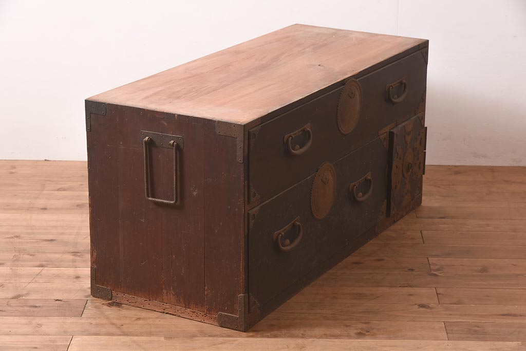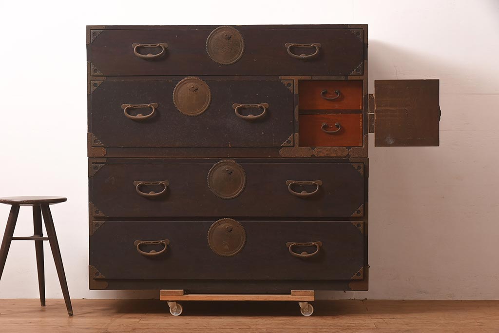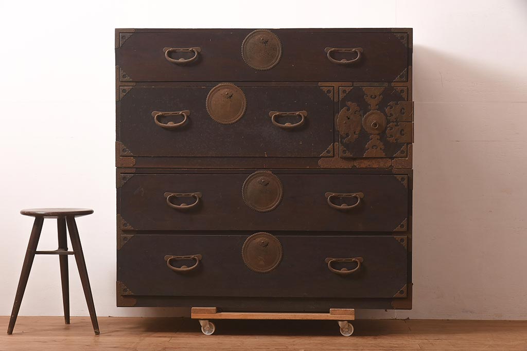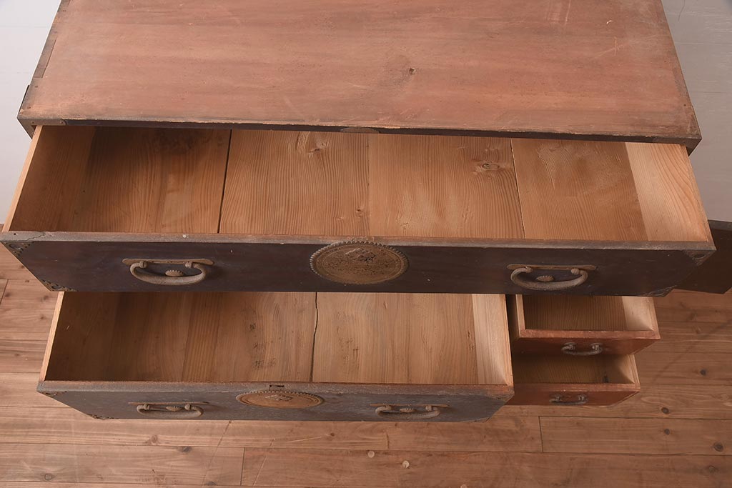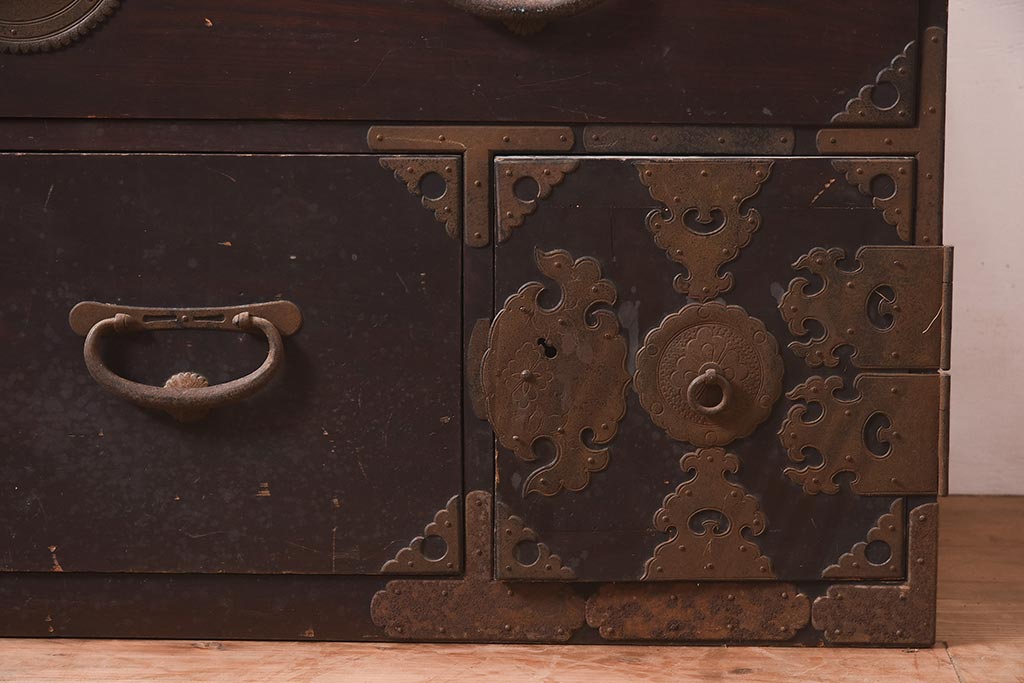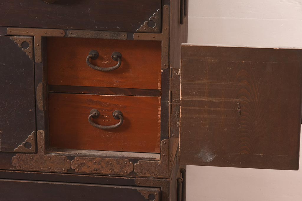 和箪笥 > アンティーク家具 明治大正期 前面ケヤキ材 凝った丸金具が上品な印象の仙台箪笥(重ね箪笥、野郎箪笥、時代箪笥、衣装箪笥)(R-044059)