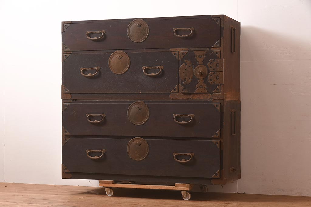 和箪笥> 衣装箪笥 > アンティーク家具 明治大正期 前面ケヤキ材 凝った丸金具が上品な印象の仙台箪笥(重ね箪笥、野郎箪笥、時代箪笥、衣装箪笥)(R-044059)