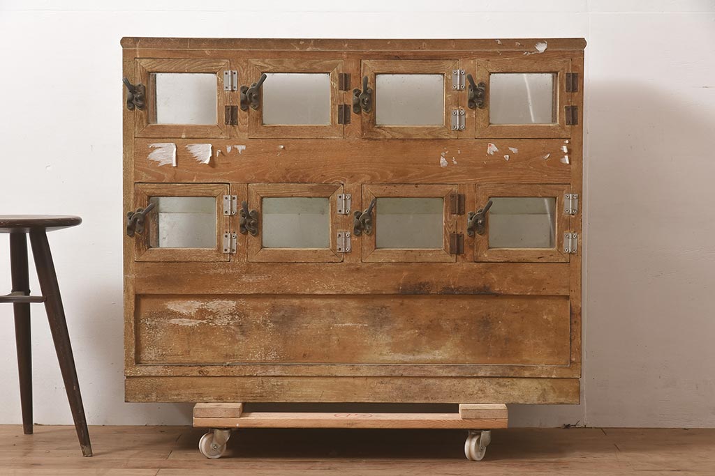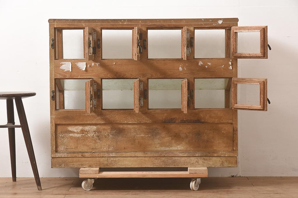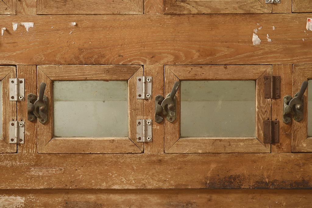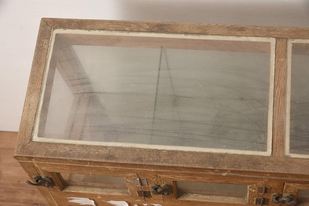 店舗什器 > アンティーク家具 昭和中期 ナラ材 味のある風合いが魅力のレトロなガラスケース(ショーケース、陳列棚、マス目)(R-044067)