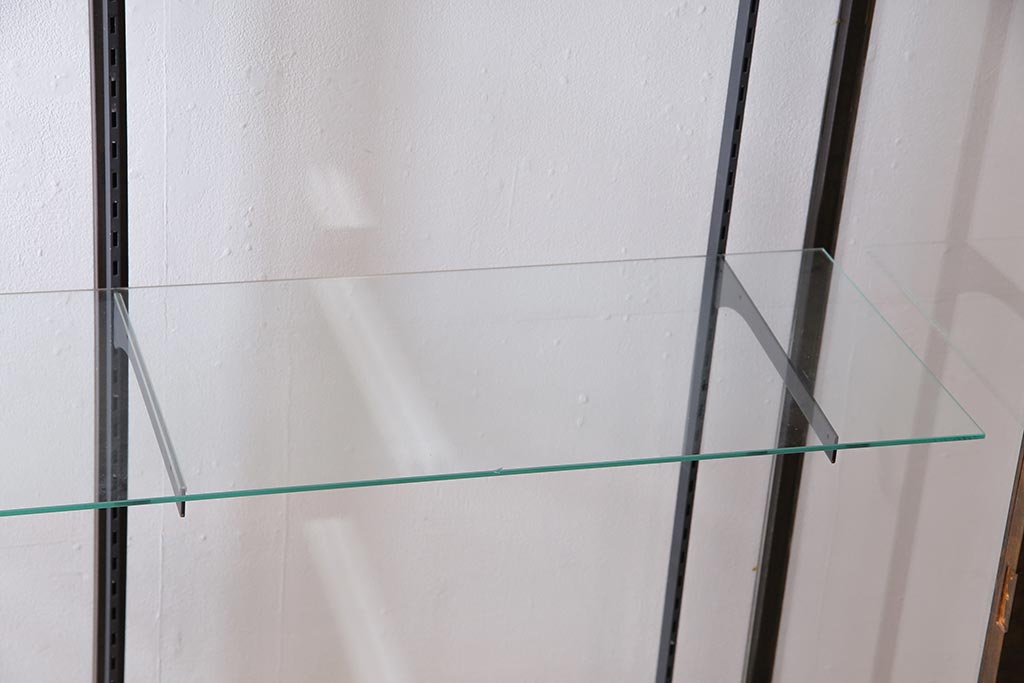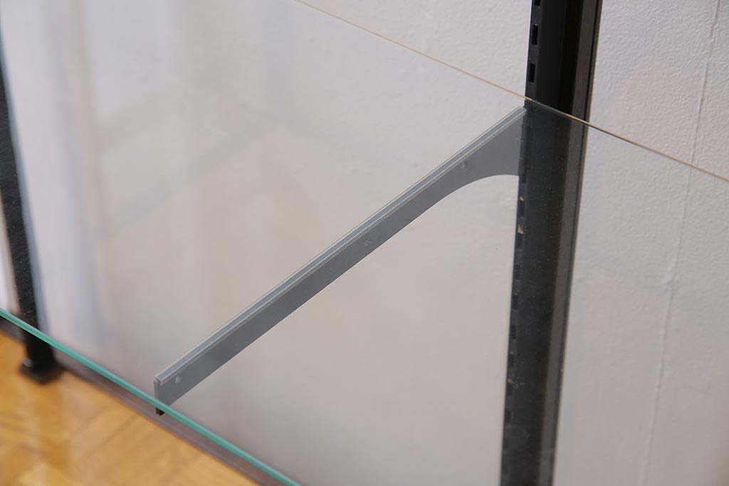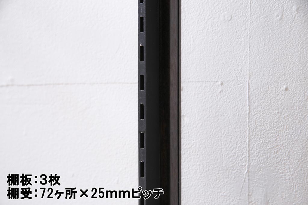 棚板は取り外しできます。棚板は3枚あります。棚受けは72ヶ所、25mmピッチで調整できます。棚幅サイズのものが1枚の作りです。