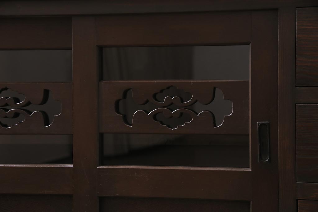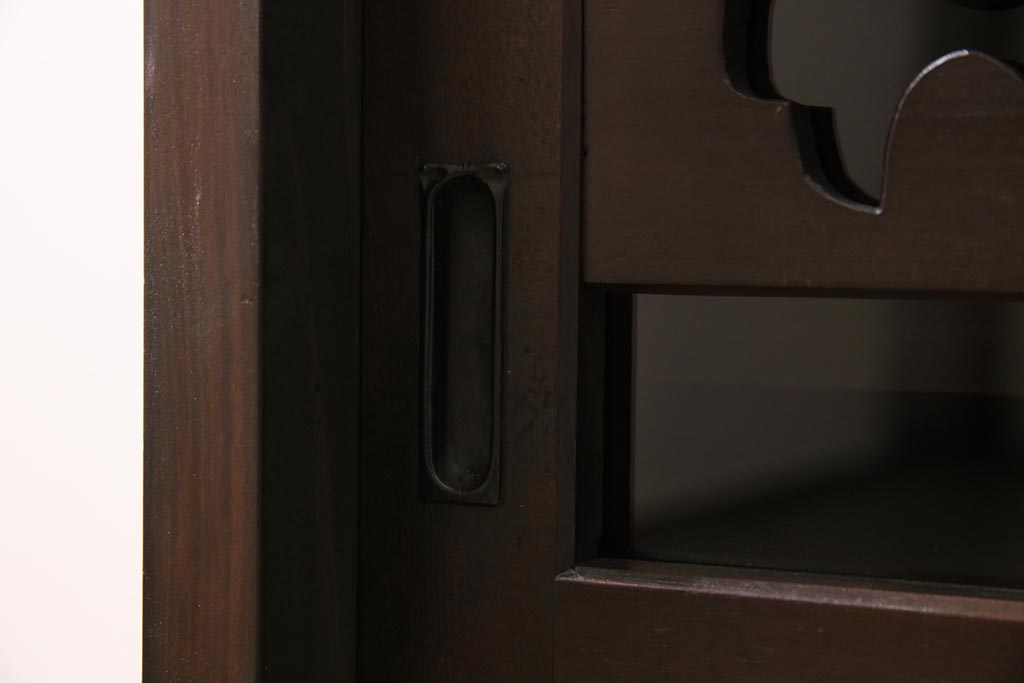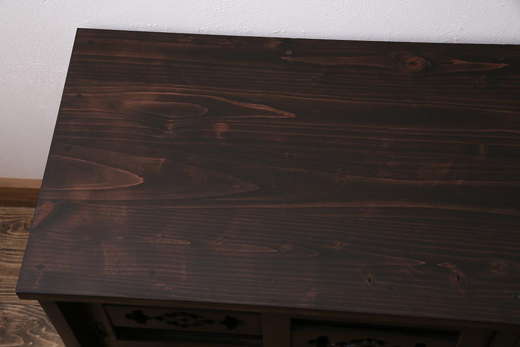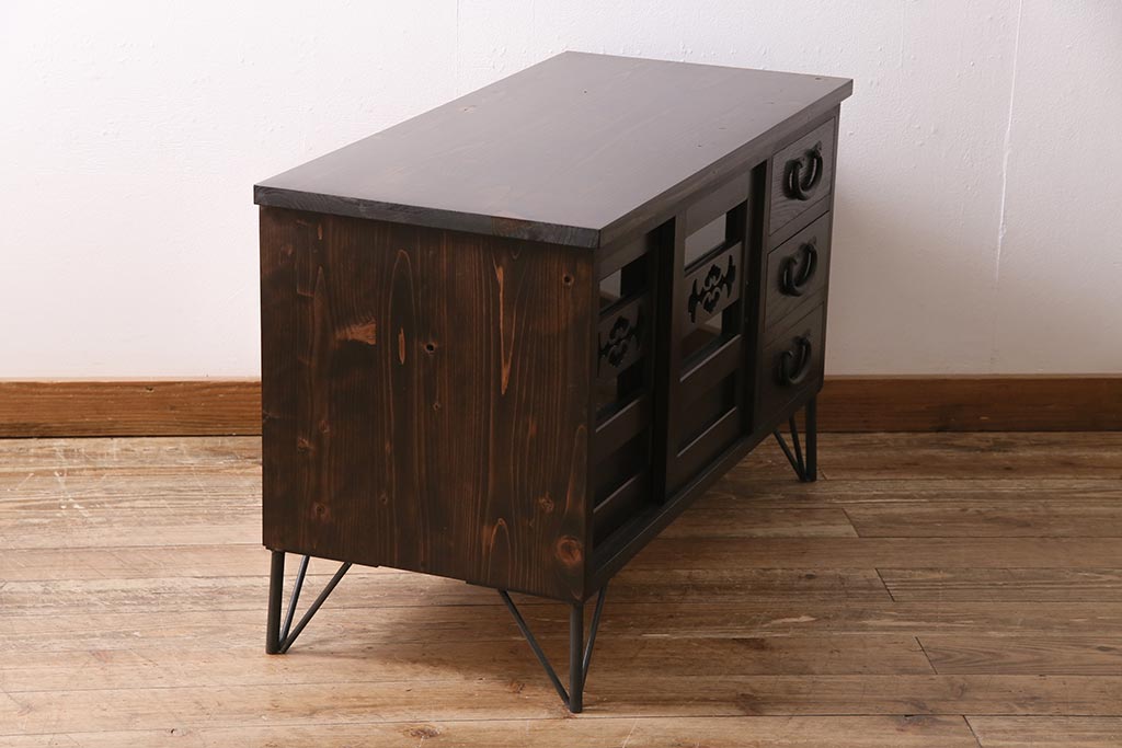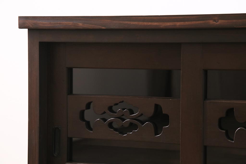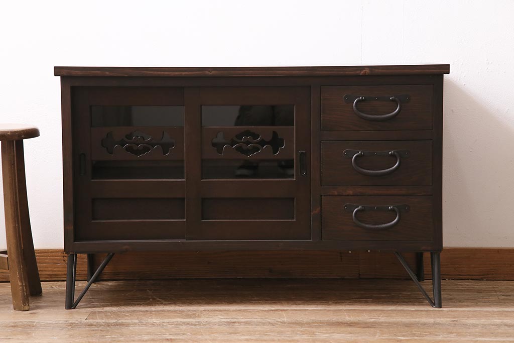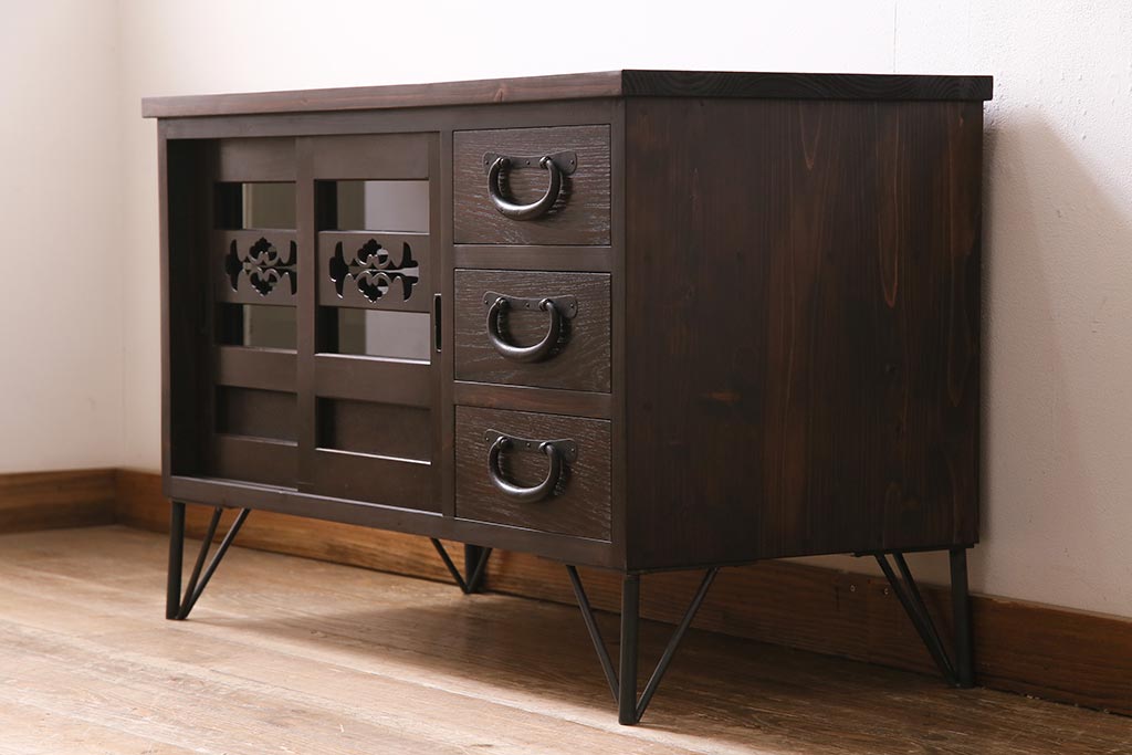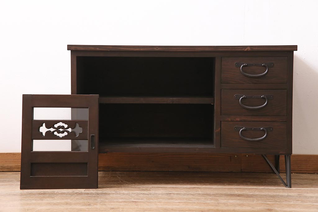 ラフジュ工房オリジナル 明治期 古建具リメイク 引き出し・脚付き 透かし彫りの意匠がアクセントになるローボード(収納棚、戸棚、テレビ台、テレビボード)(R-044276)です。