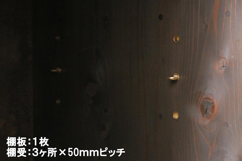 棚板は取り外しできます。棚板は1枚あります。棚受けは3ヶ所、50mmピッチで調整できます。棚幅サイズのものが1枚の作りです。