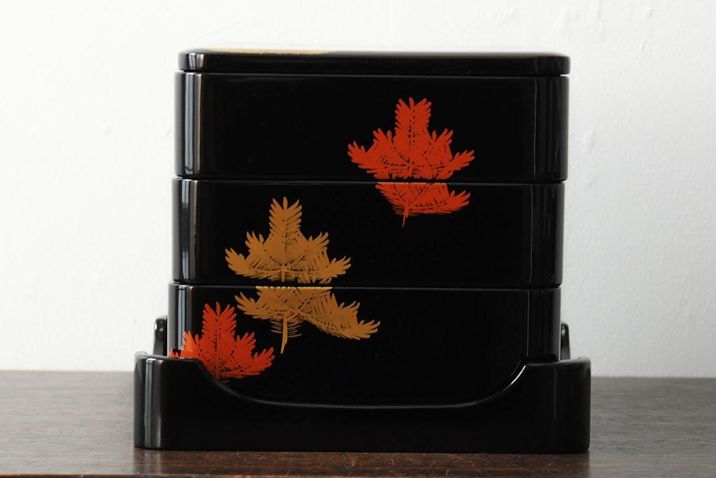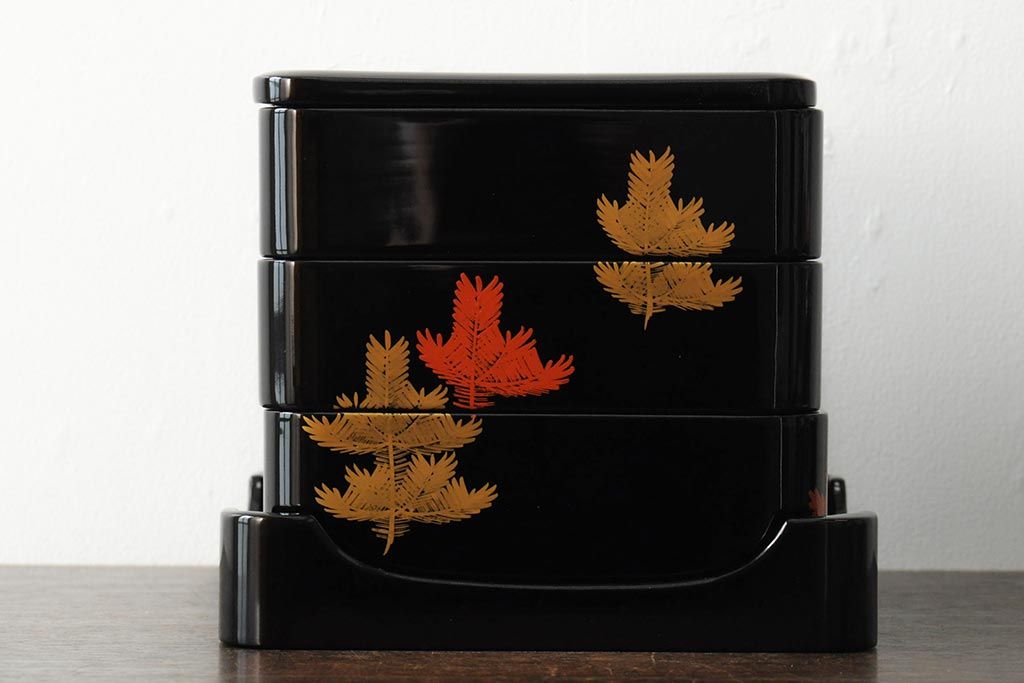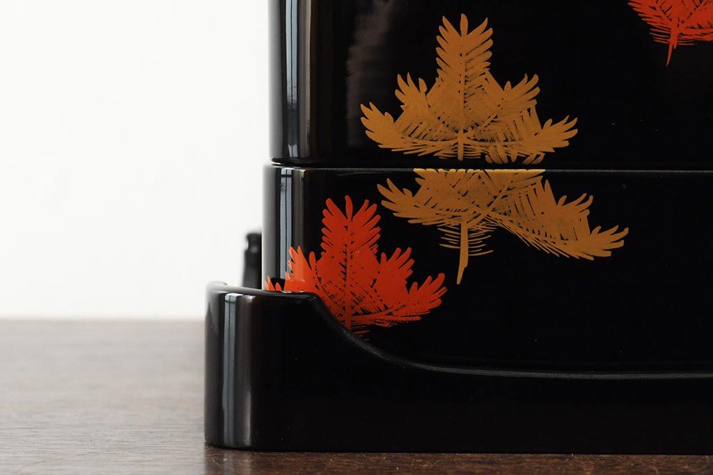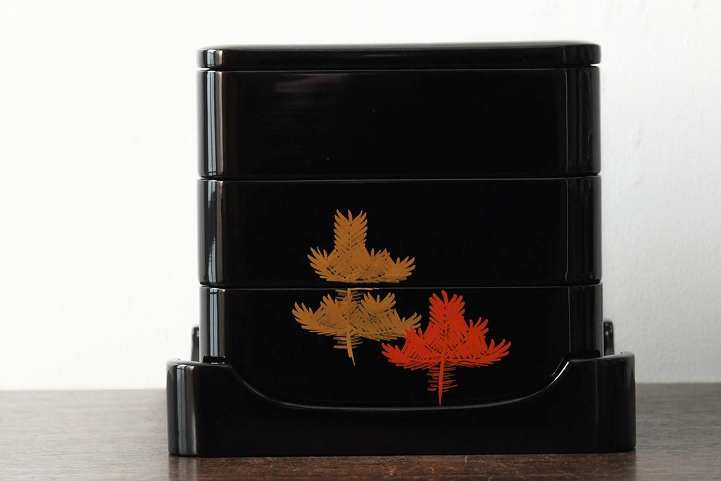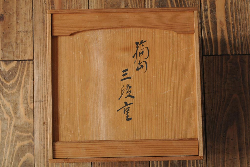 昭和期 輪島塗 松図木製三段重・重台 箱付き(重箱、漆器)(R-043770)