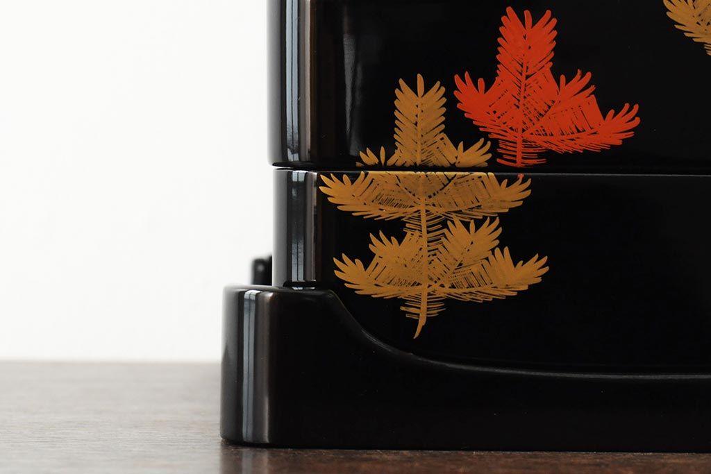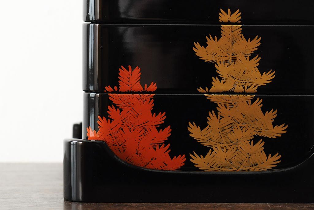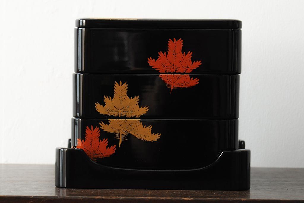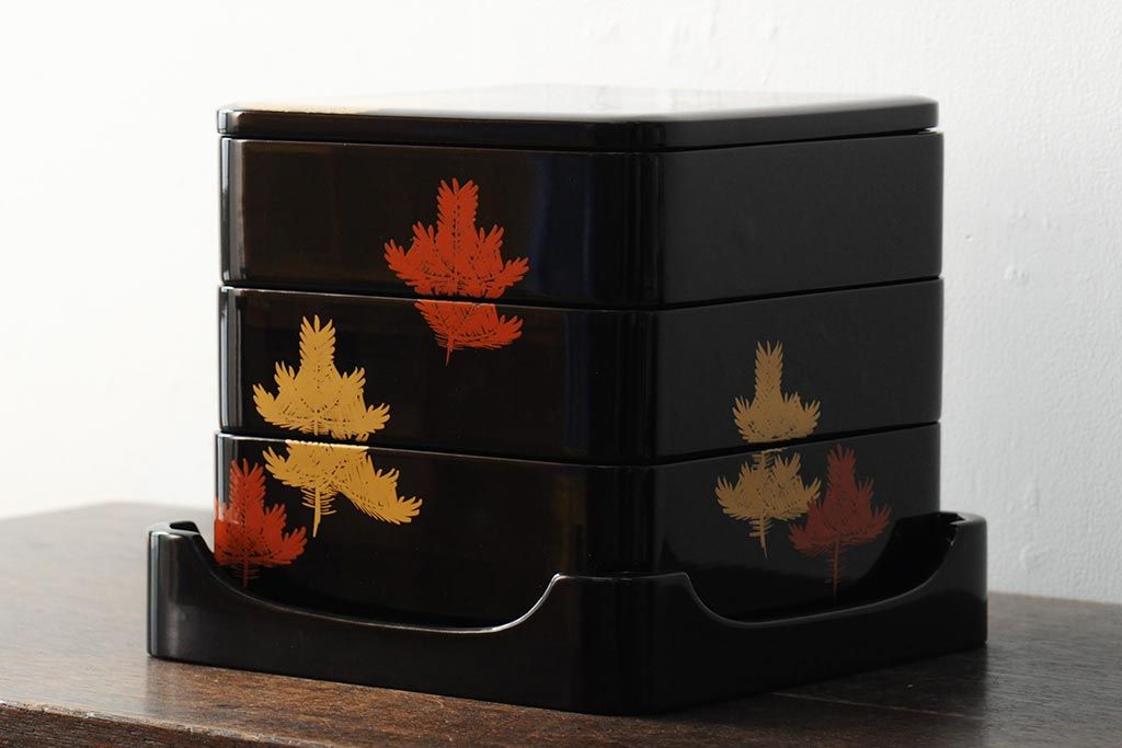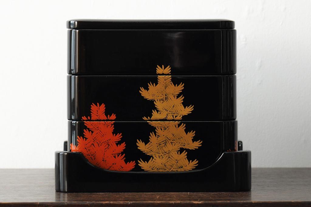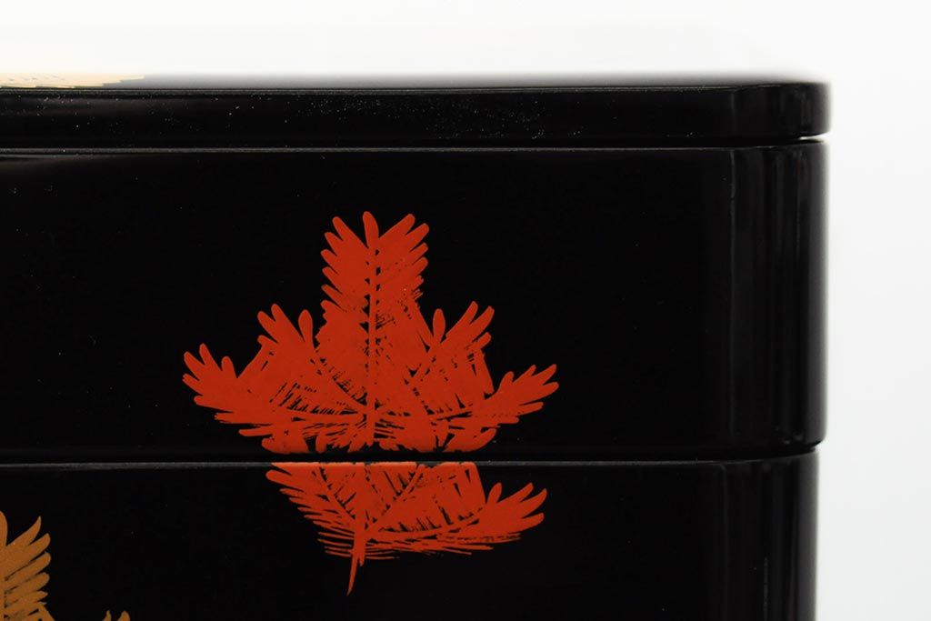 昭和期 輪島塗 松図木製三段重・重台 箱付き(重箱、漆器)(R-043770)