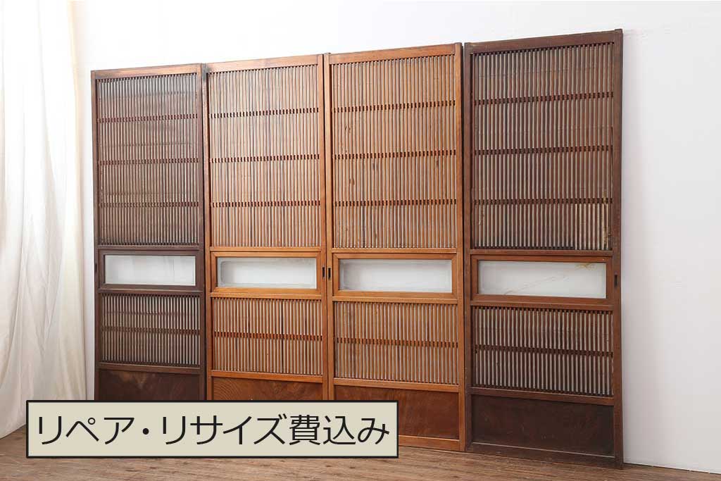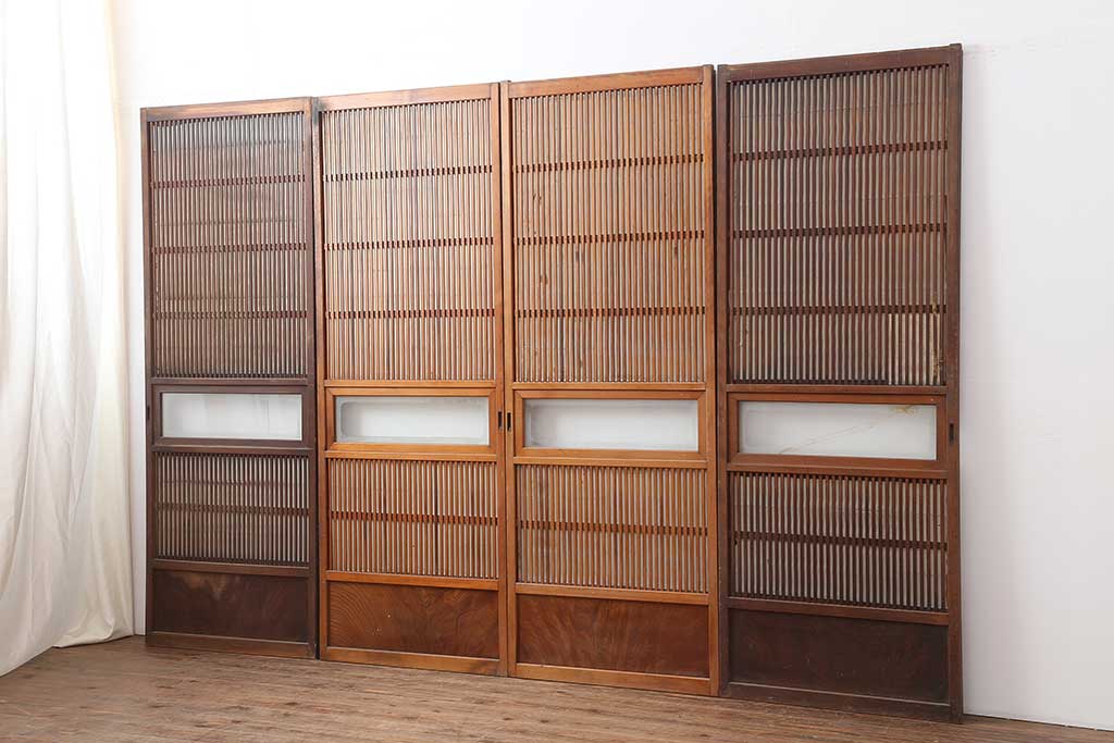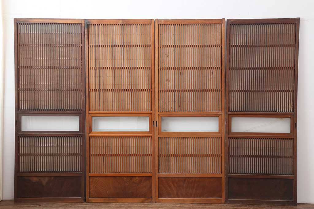 ドア・建具> 4枚〜セット > アンティーク建具 昭和初期 腰板ケヤキ材 裏障子付き 格子戸4枚セット(帯ガラス戸、引き戸、建具)(R-044260)