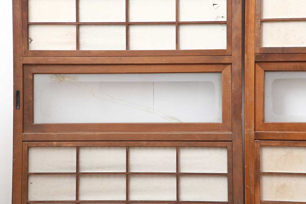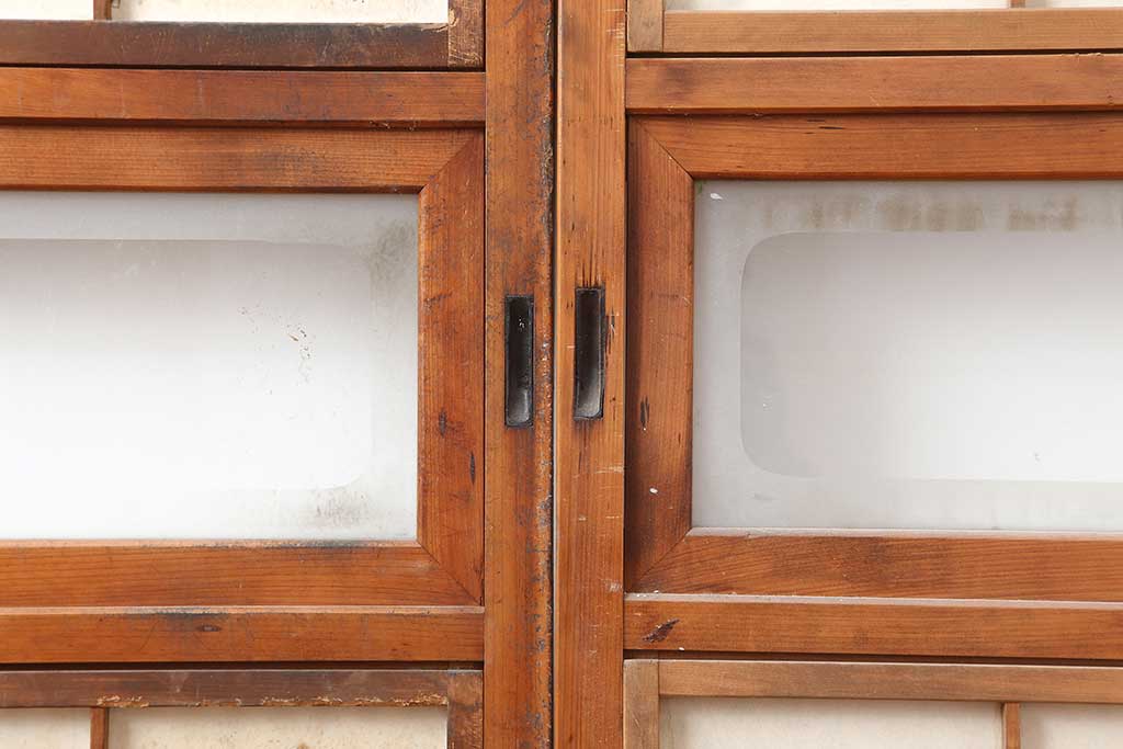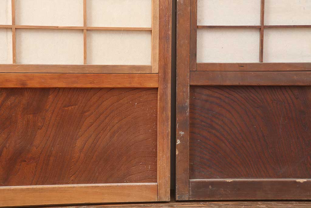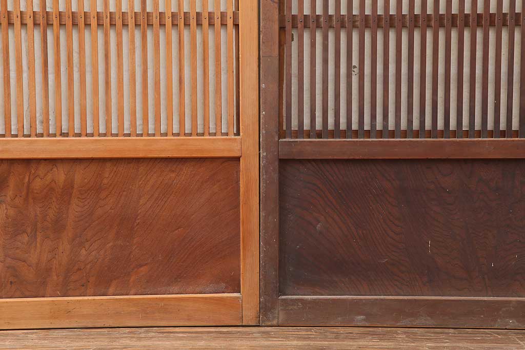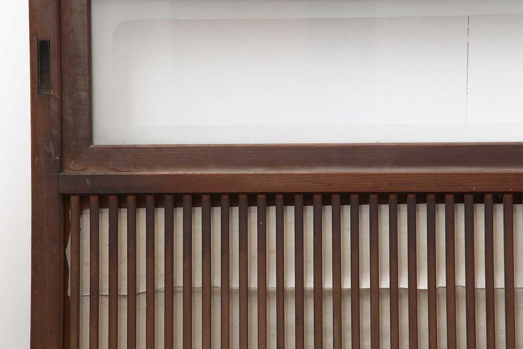 ドア・建具> 引き戸 > アンティーク建具 昭和初期 腰板ケヤキ材 裏障子付き 格子戸4枚セット(帯ガラス戸、引き戸、建具)(R-044260)