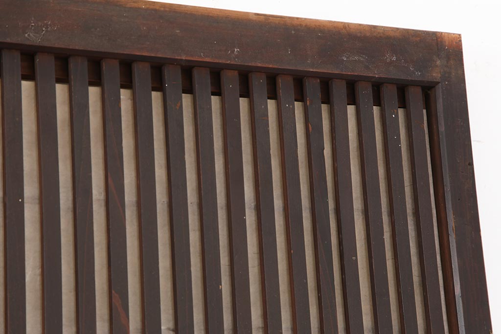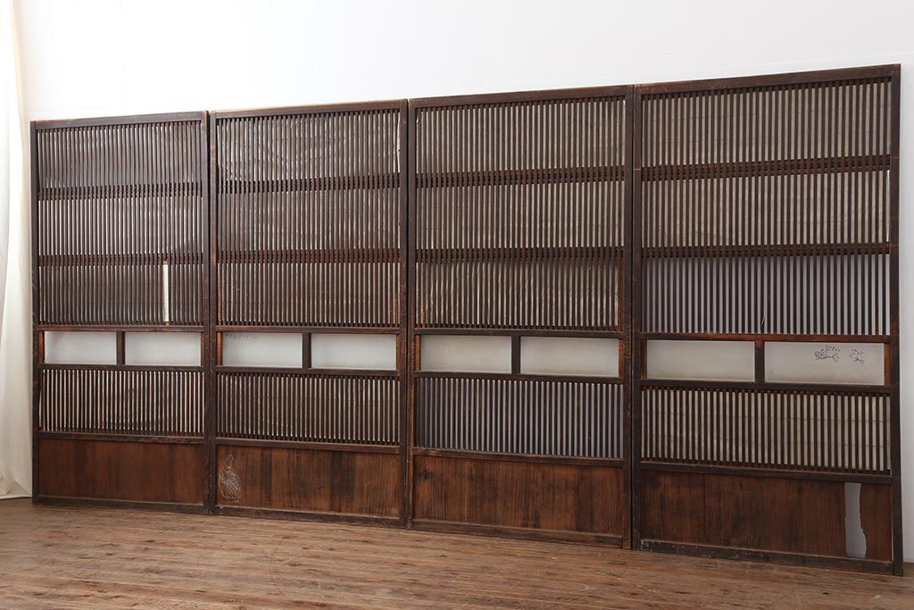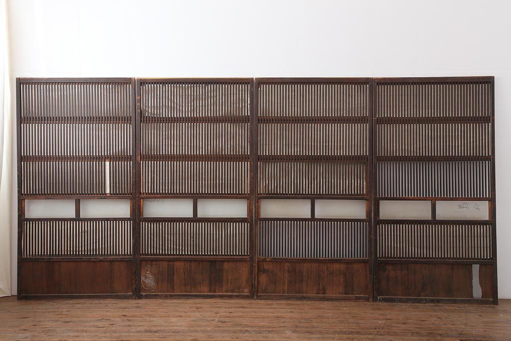 ラフジュ工房> ドア・建具> 4枚〜セット > アンティーク建具 和製アンティーク 大正期 裏障子付き いぶされたような色合いが味わい深い格子戸4枚セット(ガラス帯戸、格子帯戸、引き戸、建具)(R-044286)