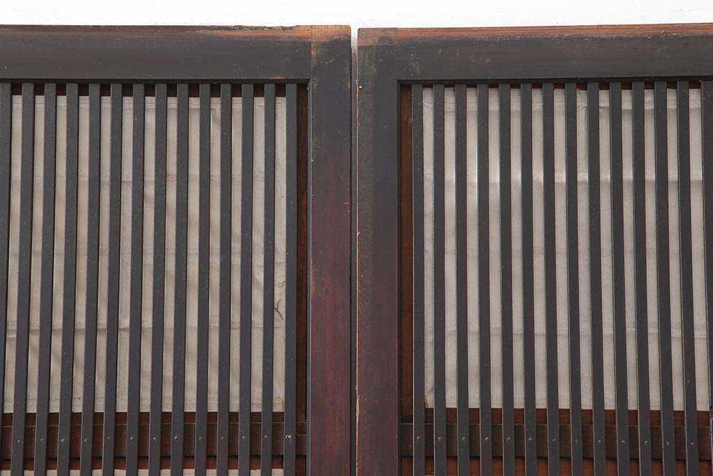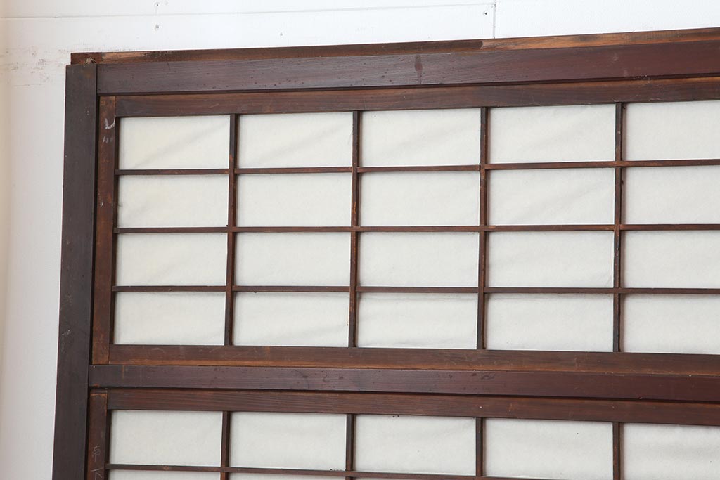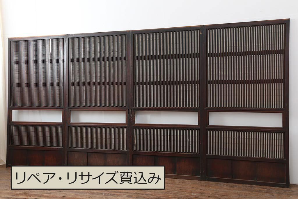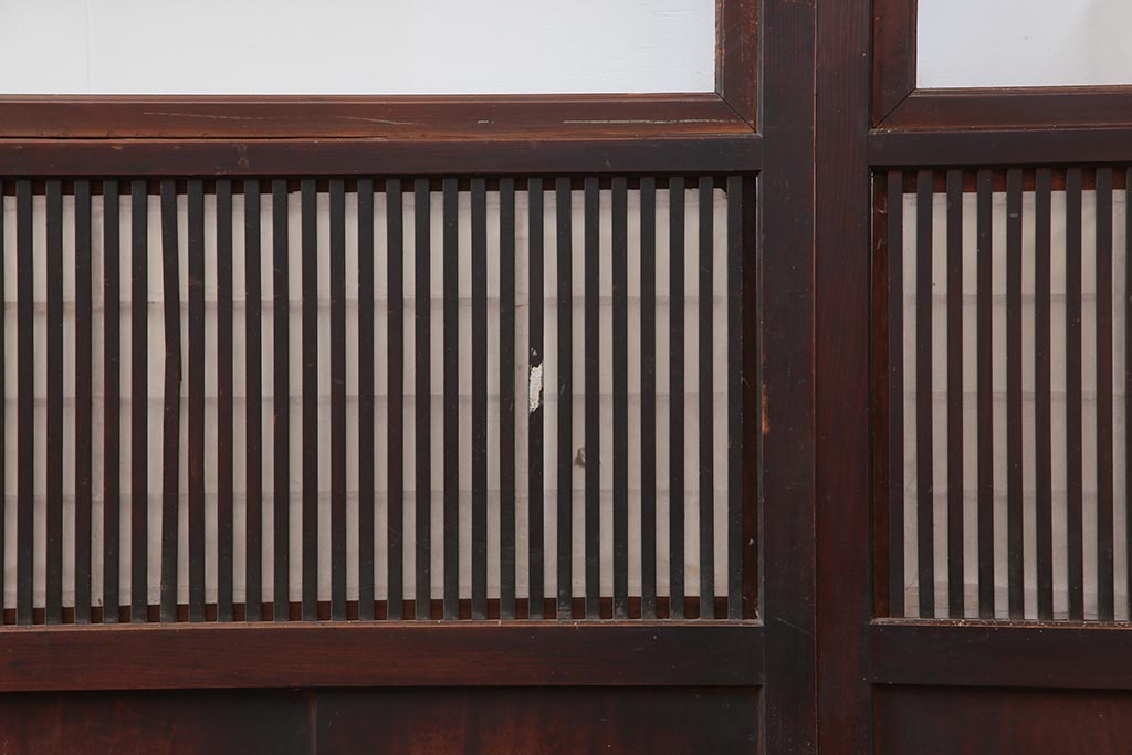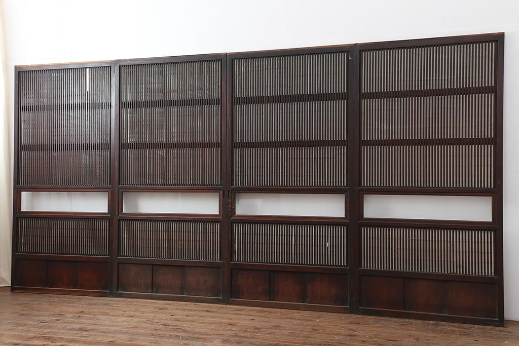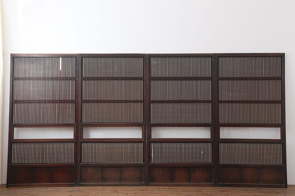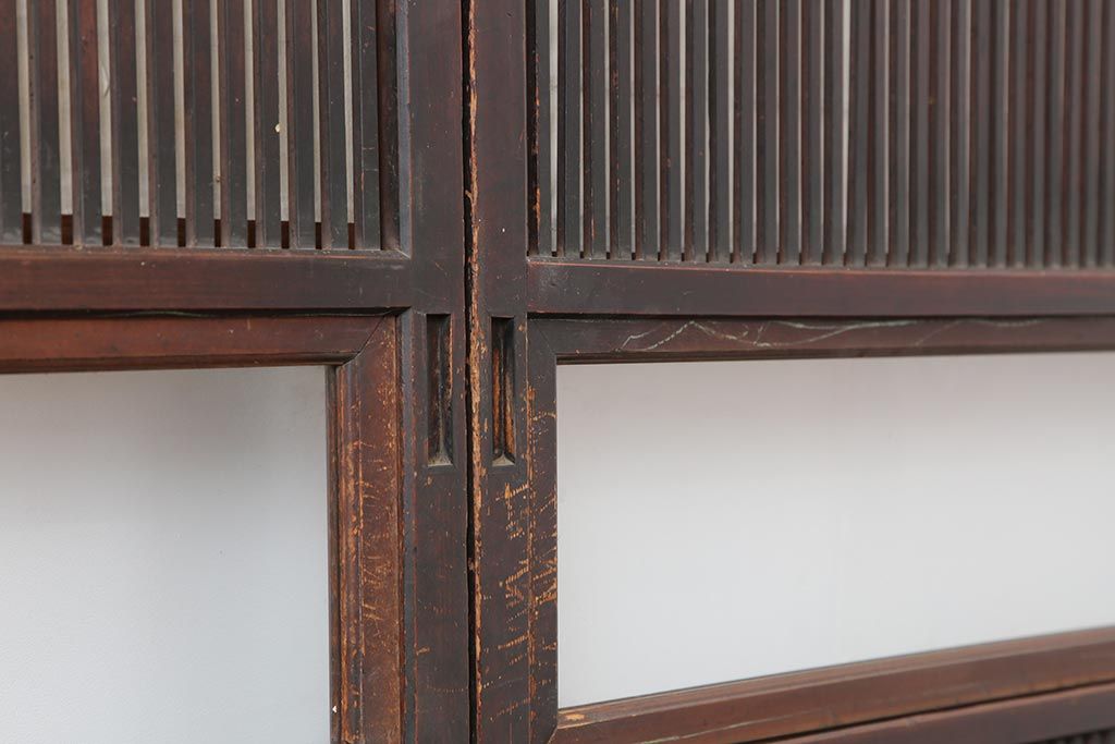 ドア・建具> 障子戸 > アンティーク建具 和製アンティーク 大正期 裏障子付き いぶされたような色合いが味わい深い格子戸4枚セット(ガラス帯戸、格子帯戸、引き戸、建具)(R-044285)