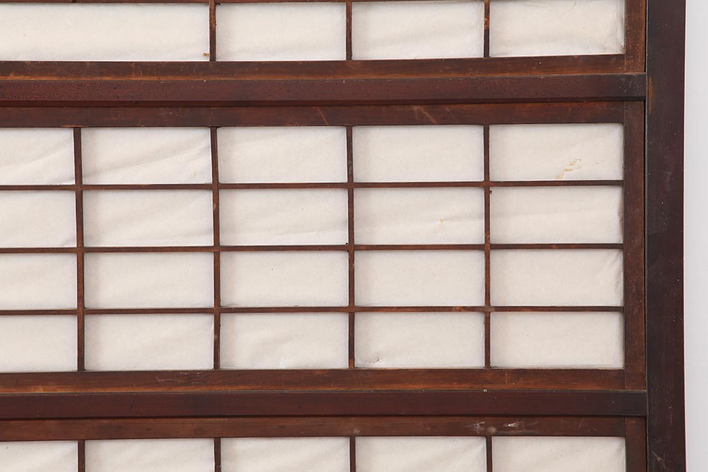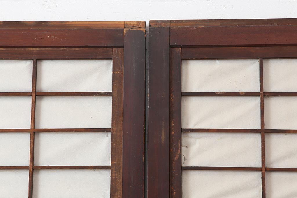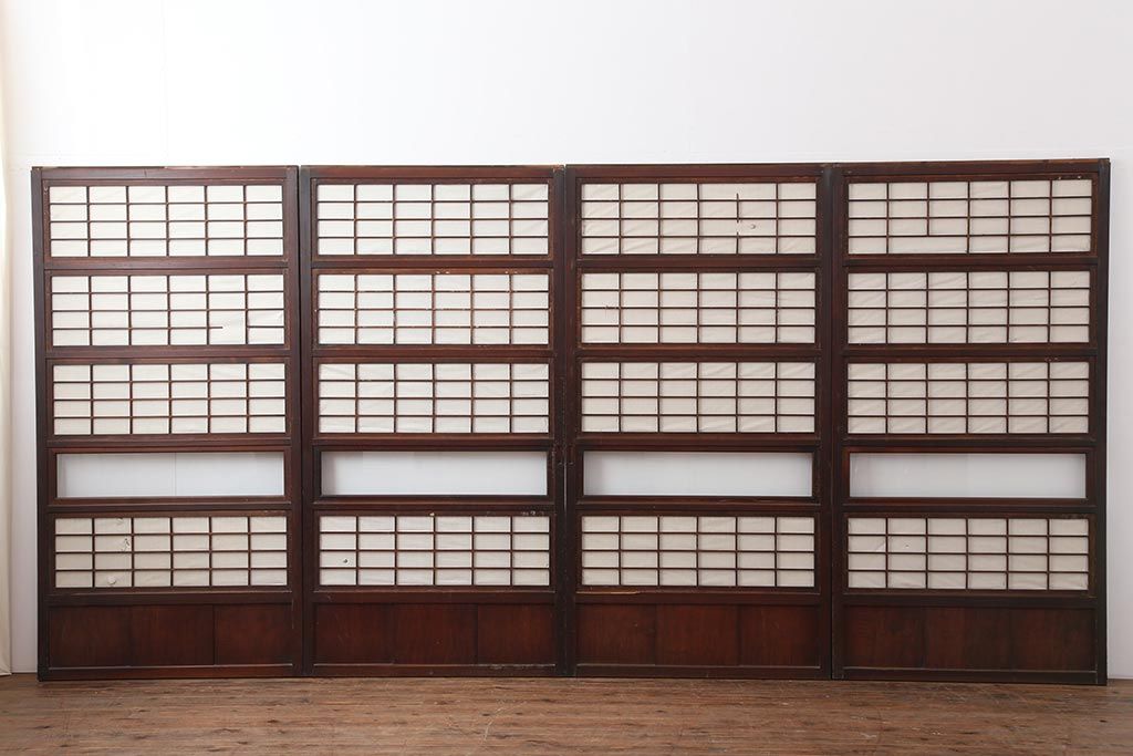 ドア・建具> 4枚〜セット > アンティーク建具 和製アンティーク 大正期 裏障子付き いぶされたような色合いが味わい深い格子戸4枚セット(ガラス帯戸、格子帯戸、引き戸、建具)(R-044285)