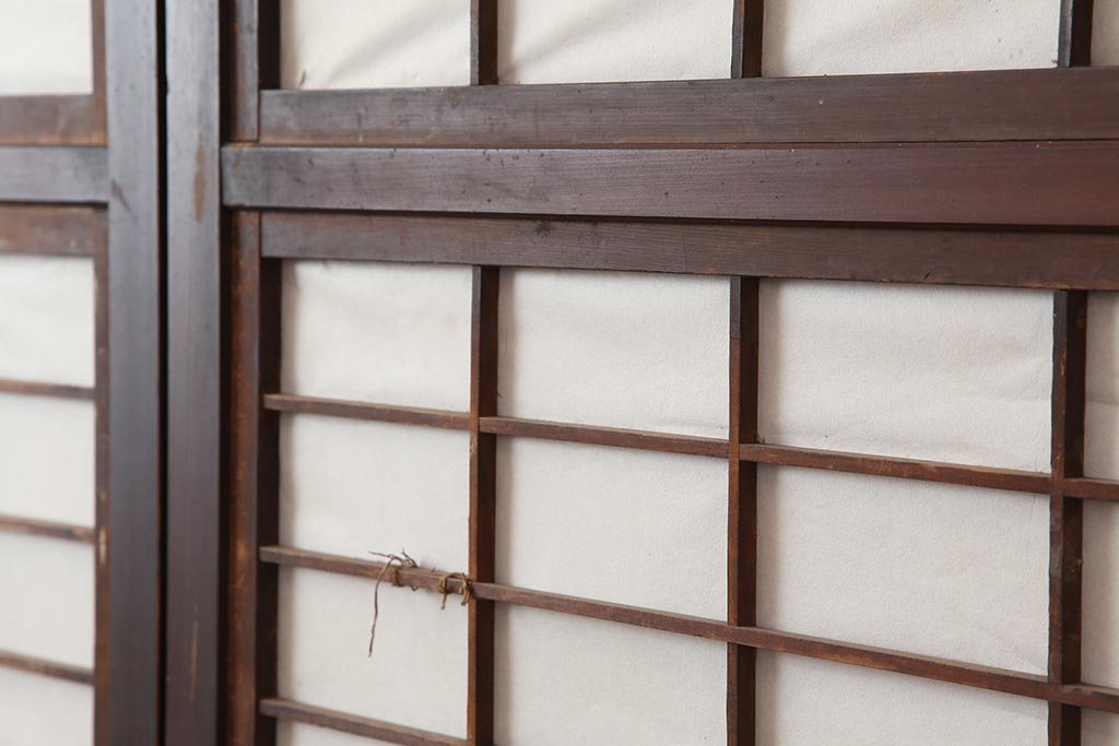 ドア・建具> 引き戸 > アンティーク建具 和製アンティーク 大正期 裏障子付き いぶされたような色合いが味わい深い格子戸4枚セット(ガラス帯戸、格子帯戸、引き戸、建具)(R-044285)