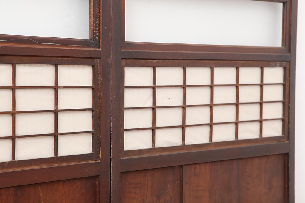 ドア・建具> 格子戸 > アンティーク建具 和製アンティーク 大正期 裏障子付き いぶされたような色合いが味わい深い格子戸4枚セット(ガラス帯戸、格子帯戸、引き戸、建具)(R-044285)