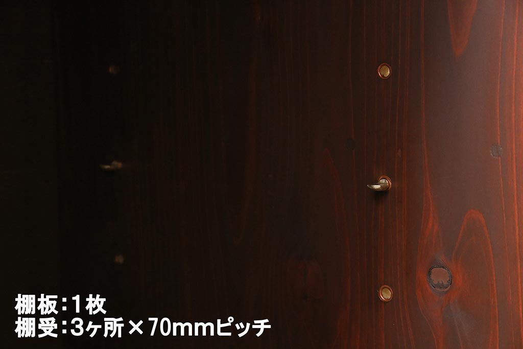 棚板は取り外しできます。棚板は1枚あります。棚受けは3ヶ所、70mmピッチで調整できます。棚幅サイズのものが1枚の作りです。