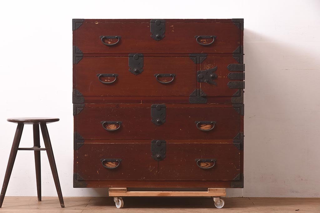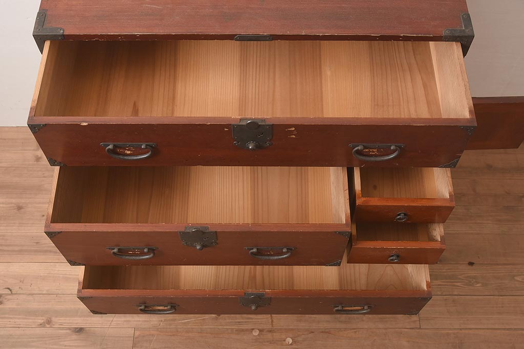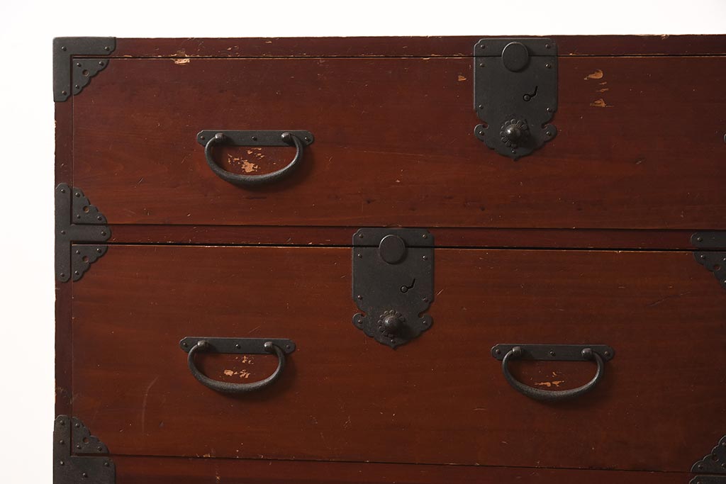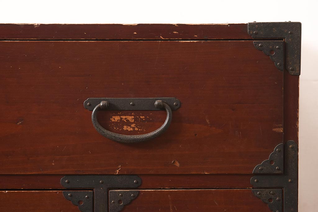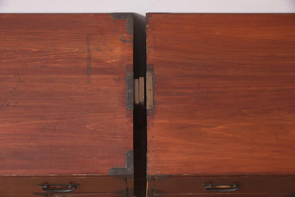アンティーク家具 明治期 ヒノキ材 赤みがかった色合いが趣のある重ね箪笥(和箪笥、衣装箪笥、引き出し、チェスト)(R-044352)