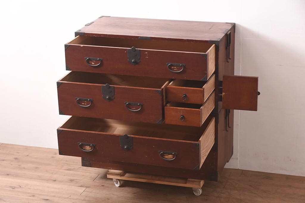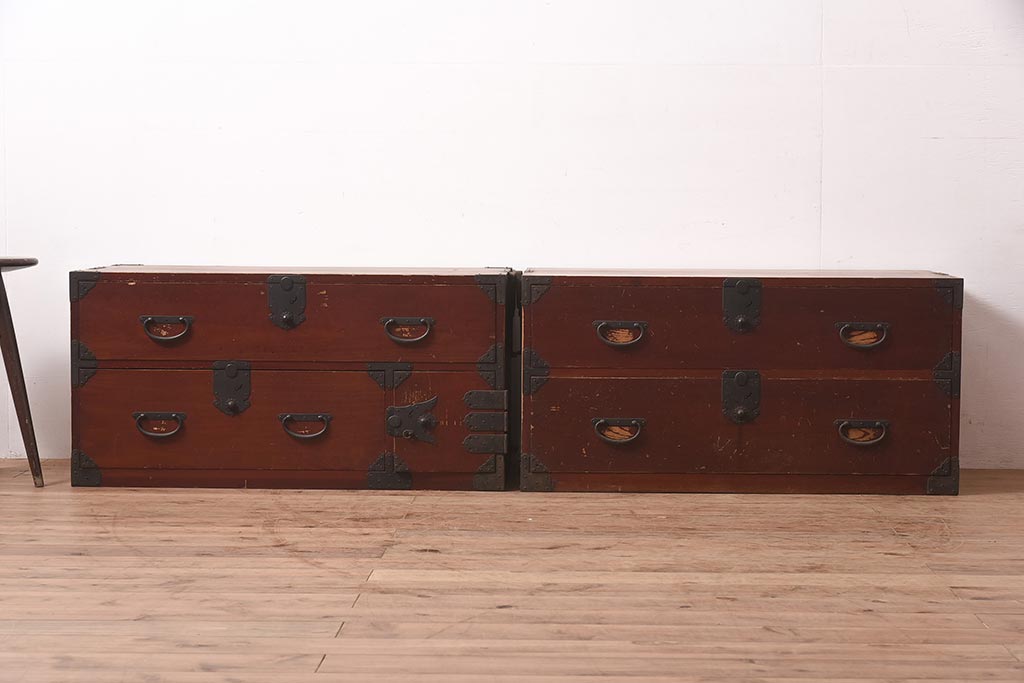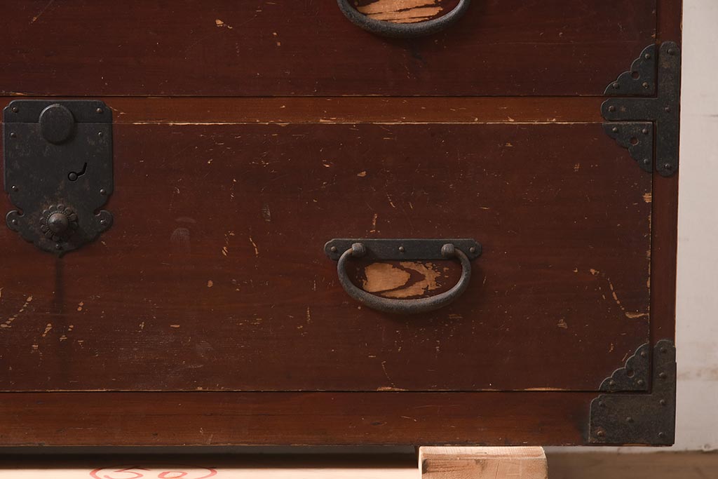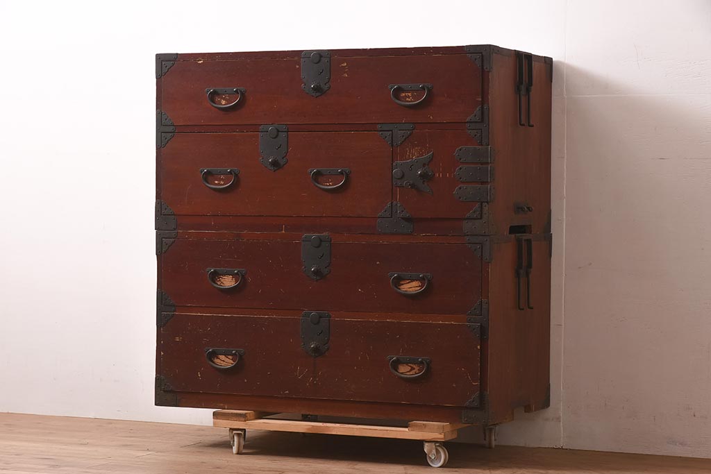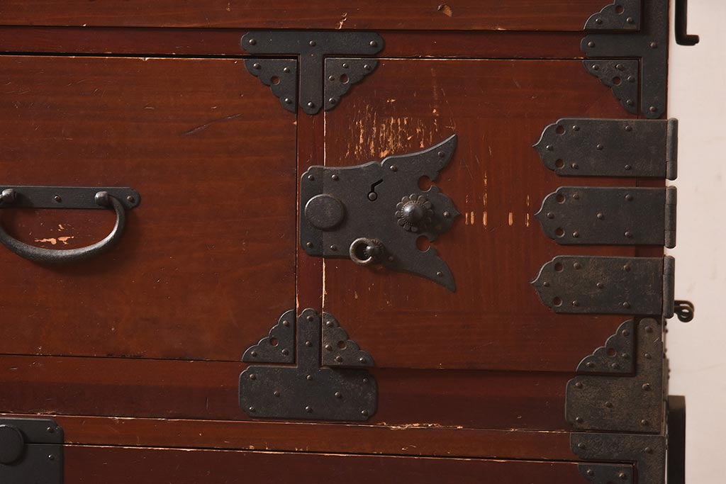 アンティーク家具 明治期 ヒノキ材 赤みがかった色合いが趣のある重ね箪笥(和箪笥、衣装箪笥、引き出し、チェスト)(R-044352)