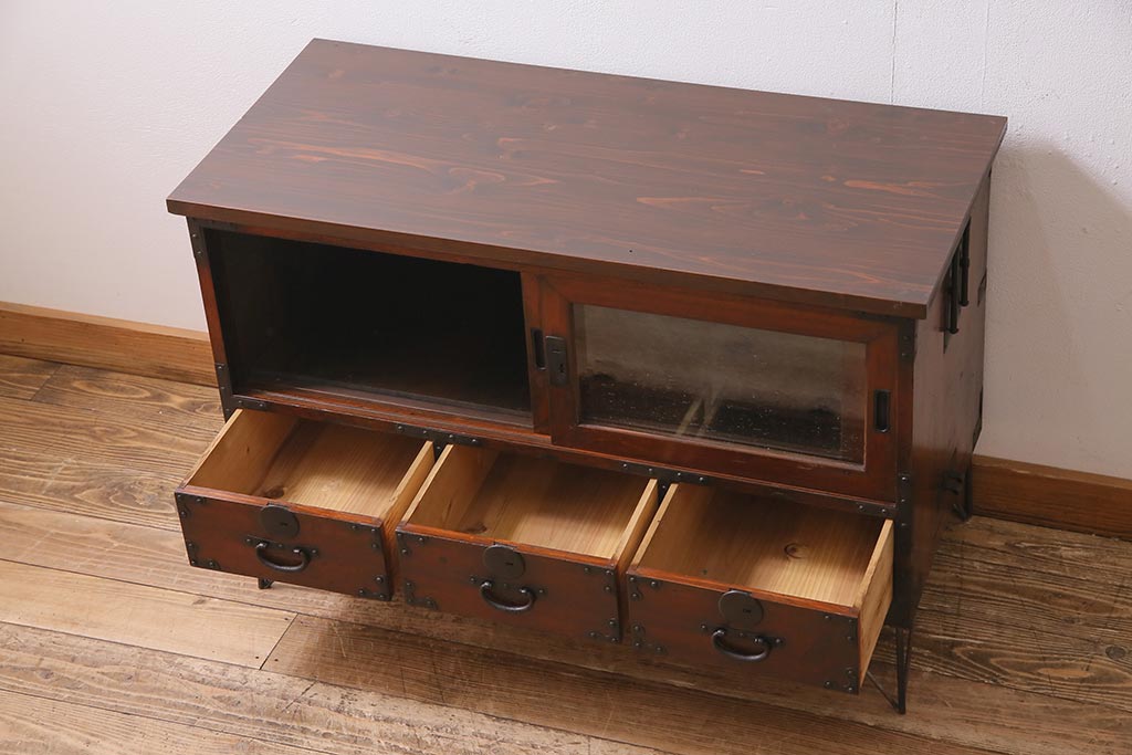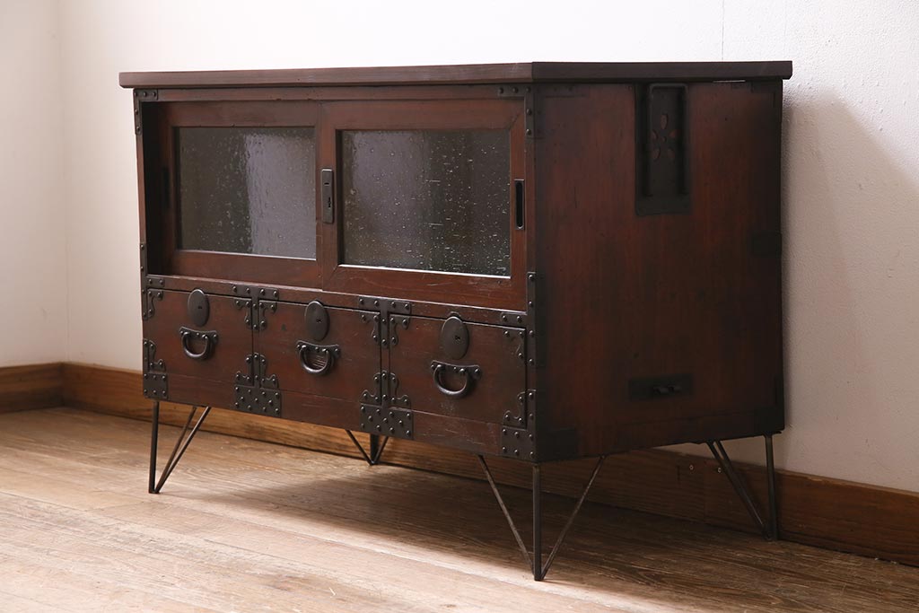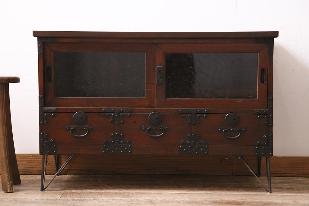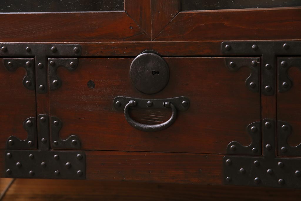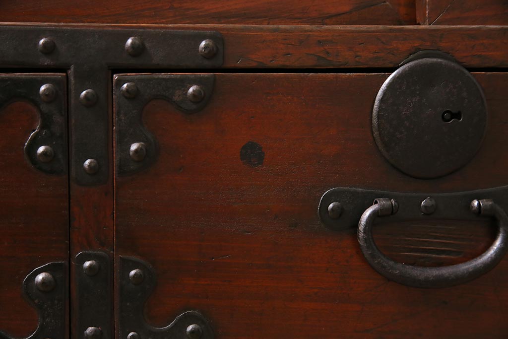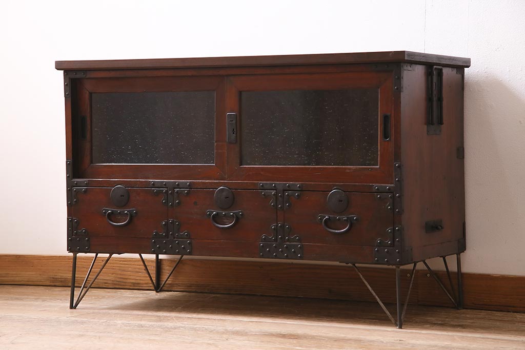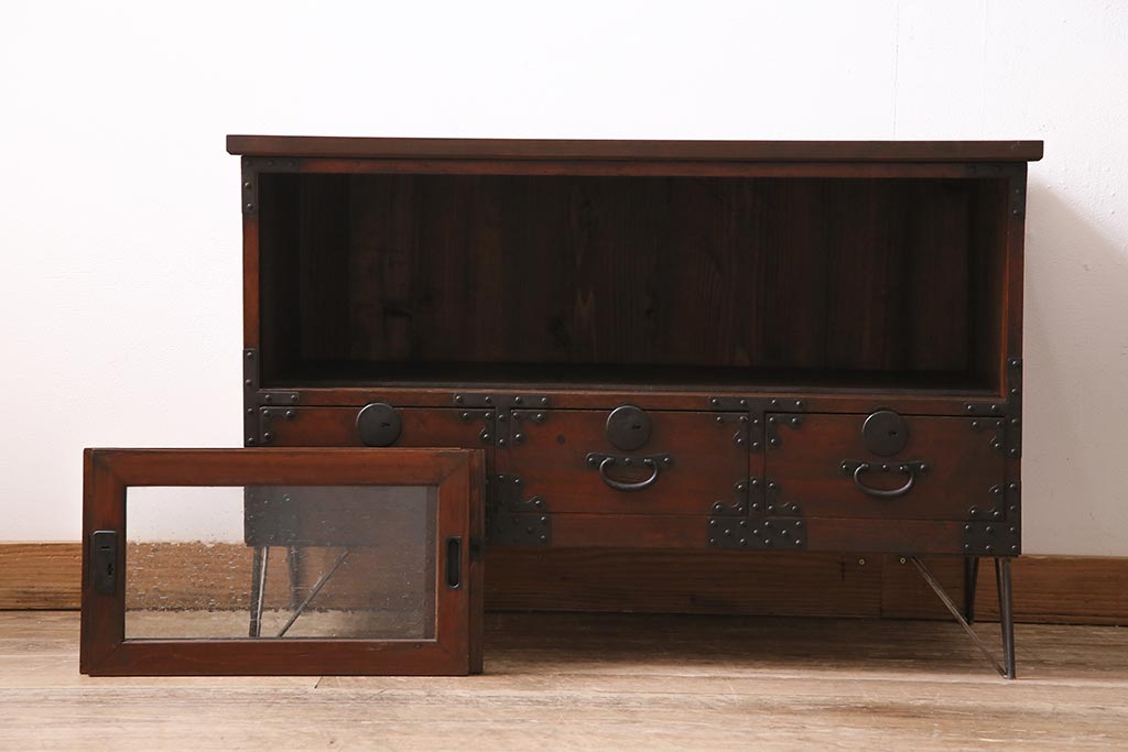和箪笥 > アンティーク家具 明治大正期 前面ケヤキ材 鋲金具が存在感のあるローボード(テレビボード、リビングボード、テレビ台)(R-044382)