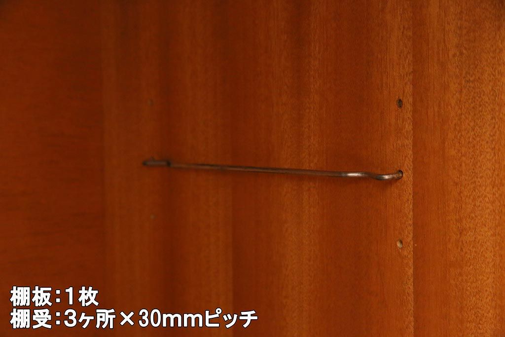 棚板は取り外しできます。棚板は1枚あります。棚受けは3ヶ所、30mmピッチで調整できます。棚幅サイズのものが1枚の作りです。