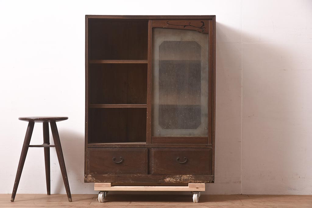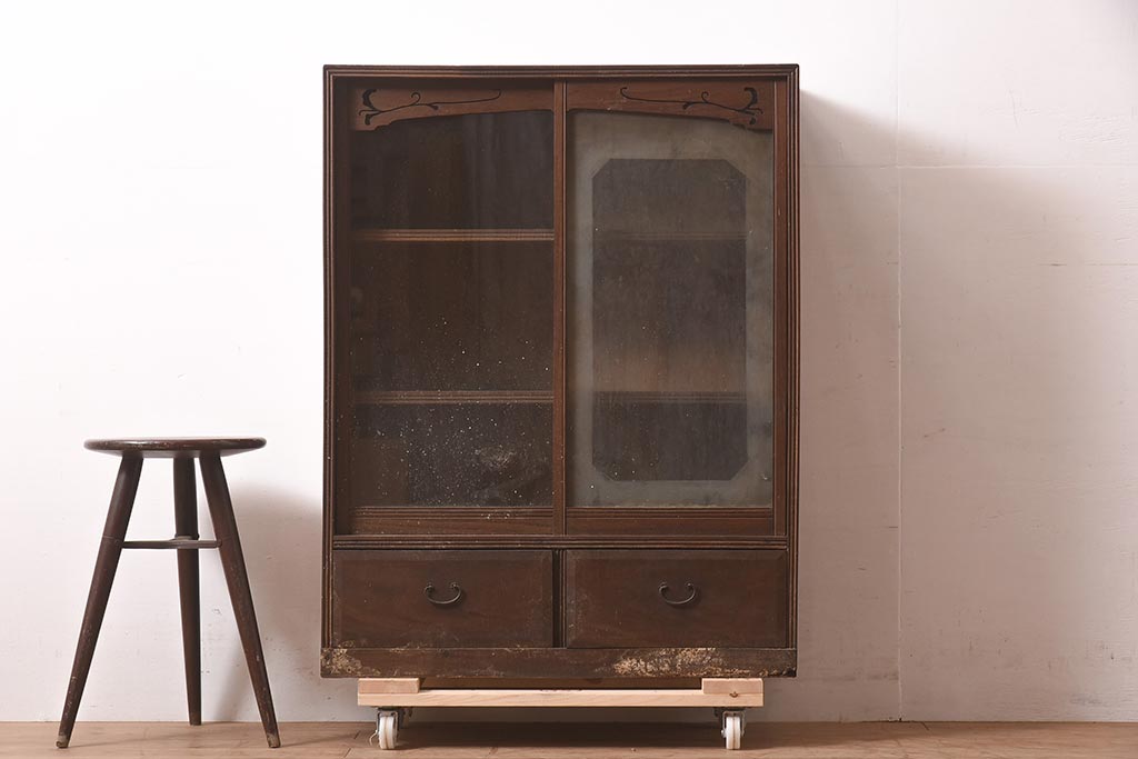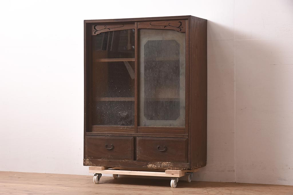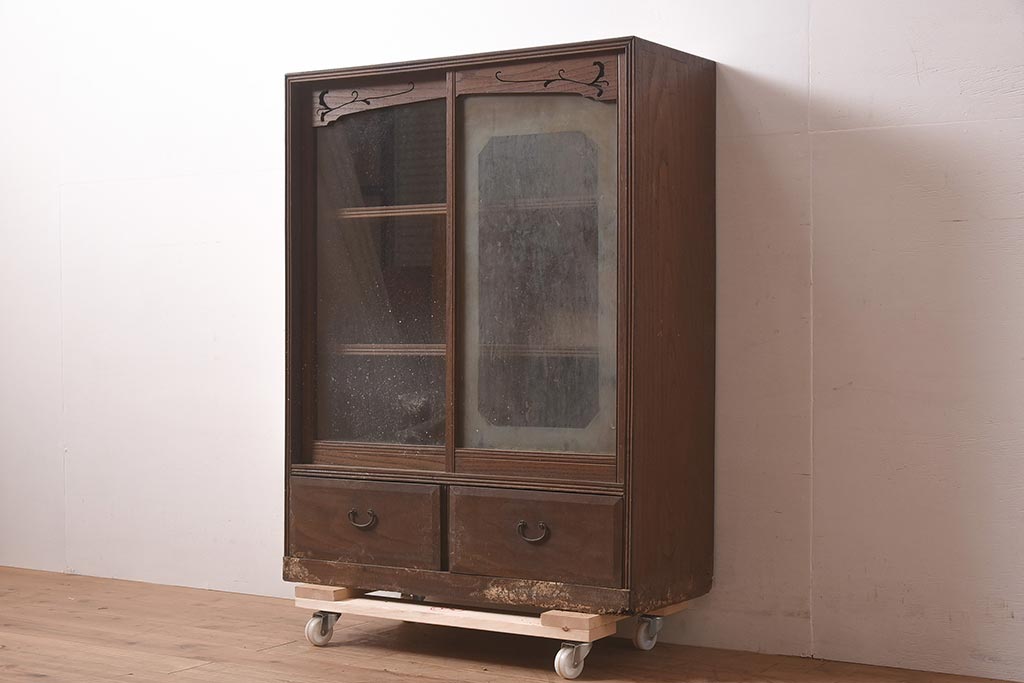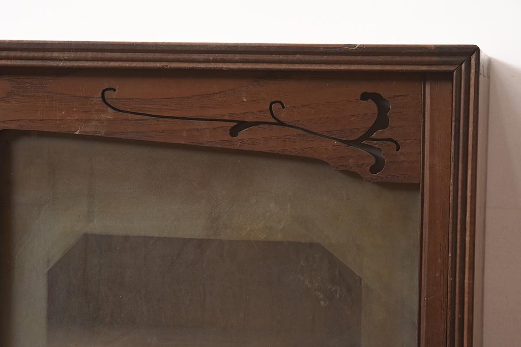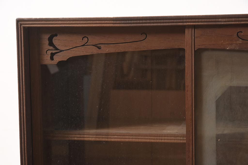 アンティーク家具 和製 大正ロマン 透かし彫りの意匠がおしゃれな栗材製の収納棚(ガラス戸棚、食器棚、飾り棚、キャビネット)(R-044373)