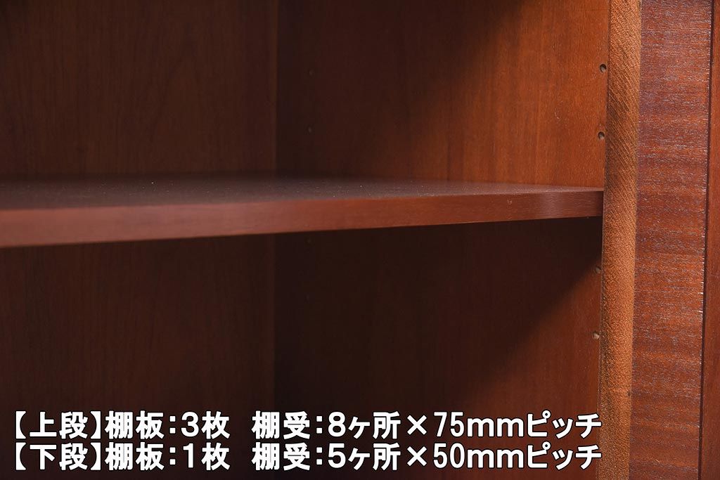 棚板は取り外しできます。棚板は上段3枚・下段1枚あります。棚受けは上段が8ヶ所・75mmピッチ、下段は5ヶ所、50mmピッチで調整できます。棚幅サイズのものが1枚の作りです。