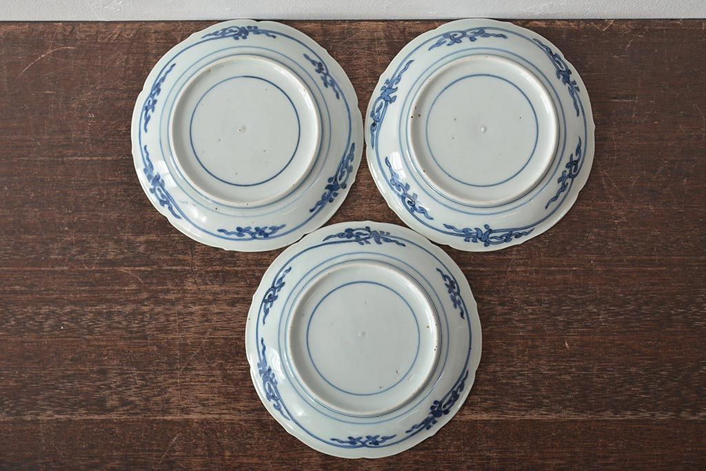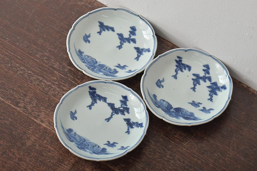古民具・骨董 江戸期 古伊万里 藍九谷 松と鴎 変形皿3枚(中皿、和食器)(R-044226)