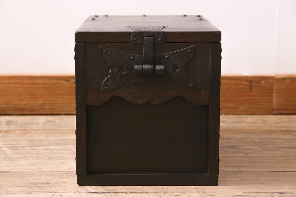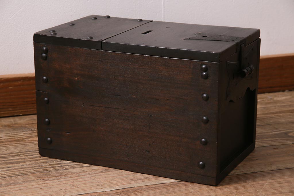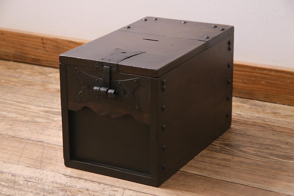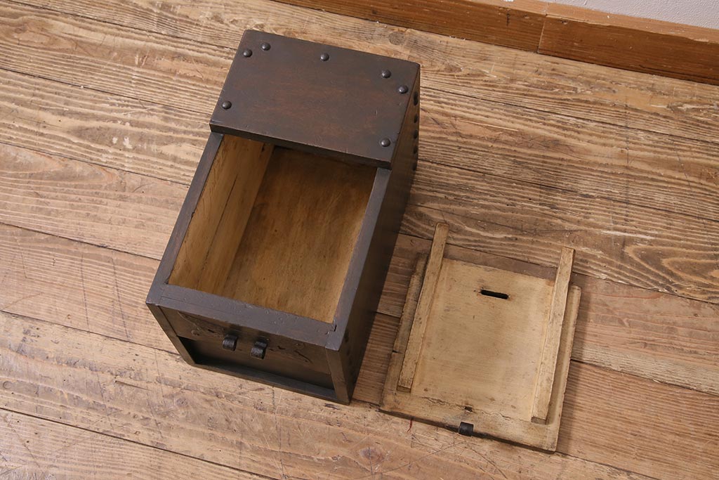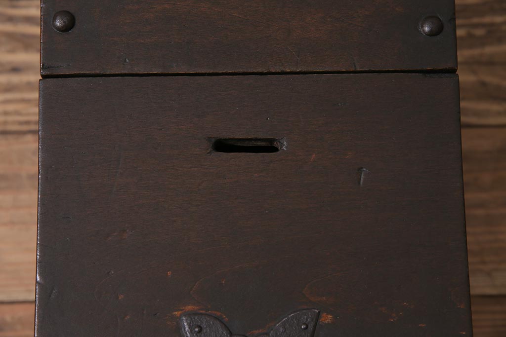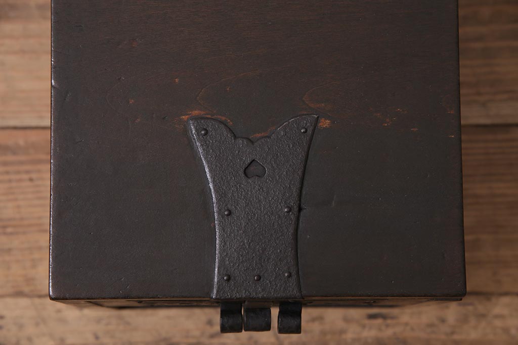 古道具・古民具> 銭箱 > アンティーク雑貨 古民具・骨董 明治大正期 朴の木(ホオノキ) 古い金具が風格漂う銭箱(銭函)(R-044619)