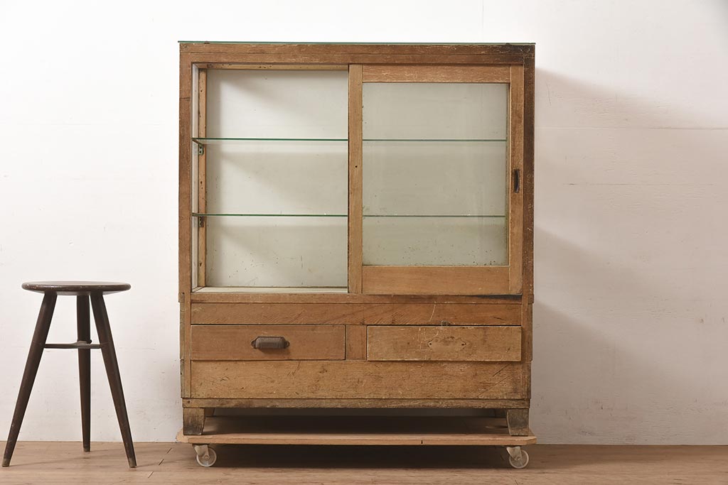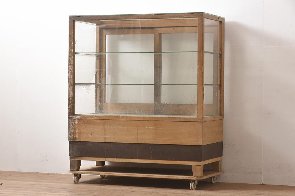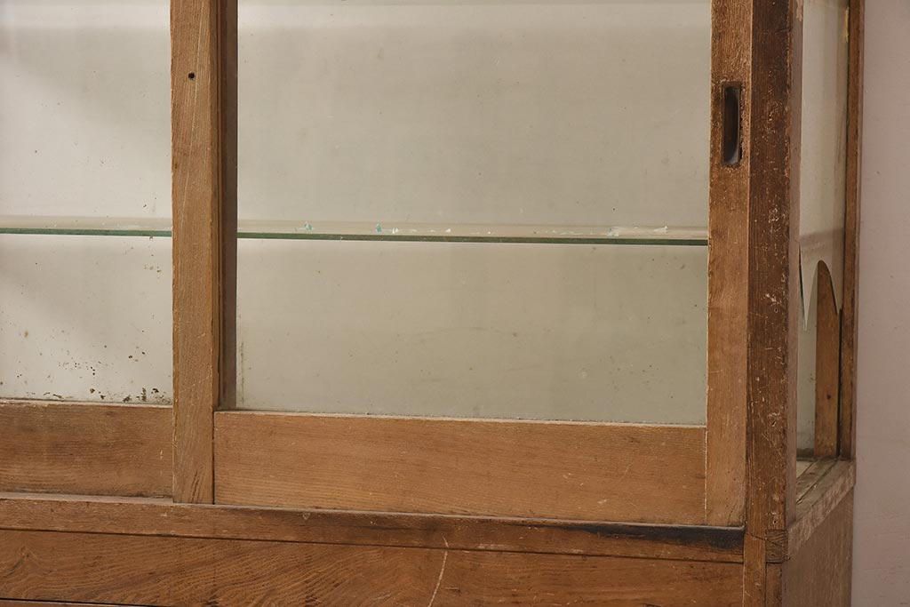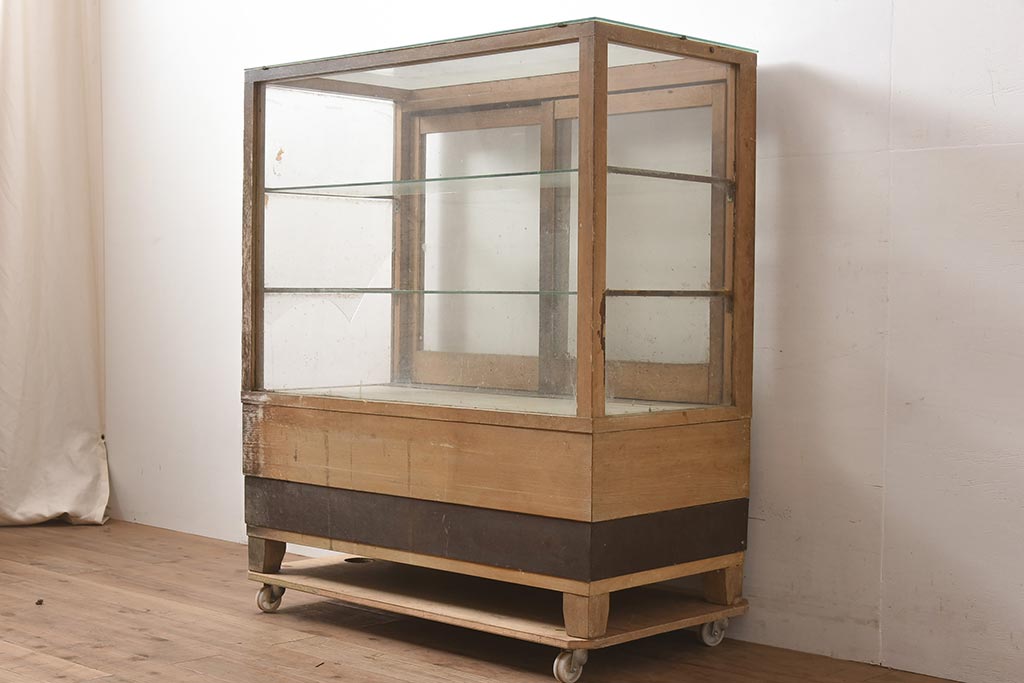 ラフジュ工房> ガラスケース・ショーケース > アンティーク家具 昭和中期 ナラ材 引き出し付きのレトロなガラスケース(ショーケース、陳列棚)(R-044556)