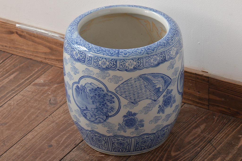 アンティーク雑貨 鶴・花・風景の図 瀬戸火鉢(鉢カバー、傘立て)(R-044669)です。