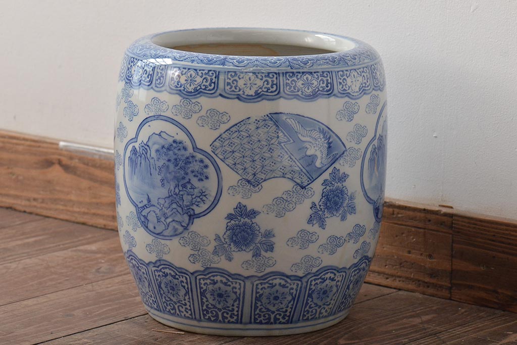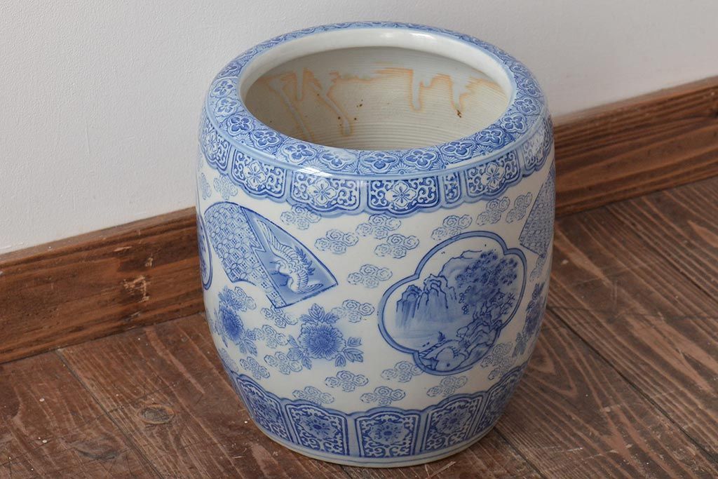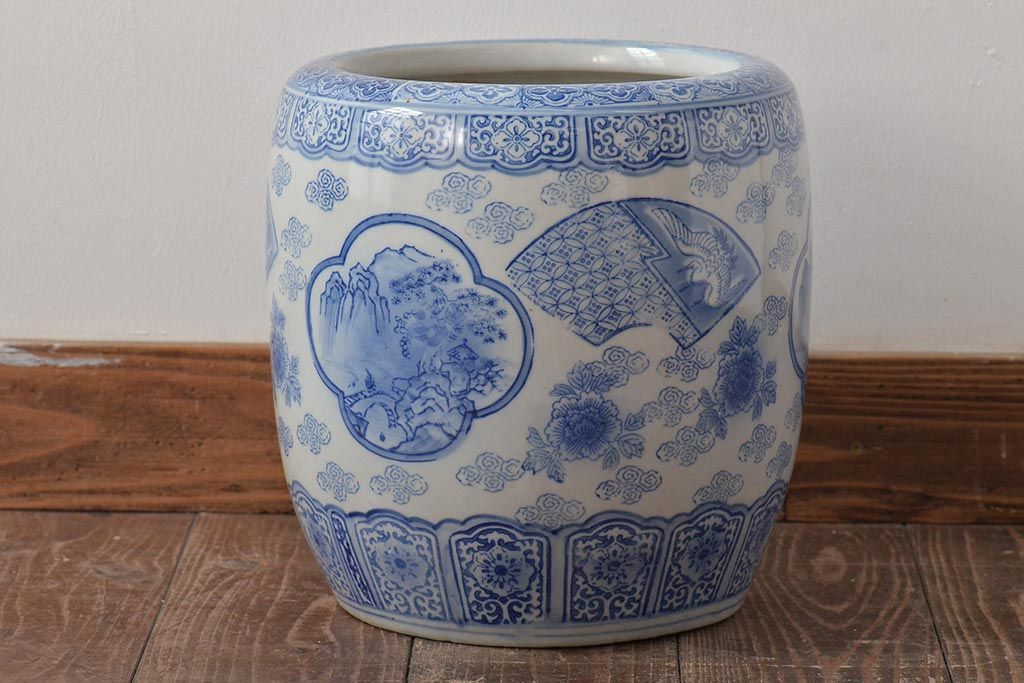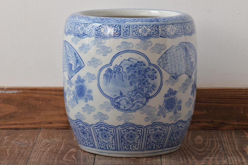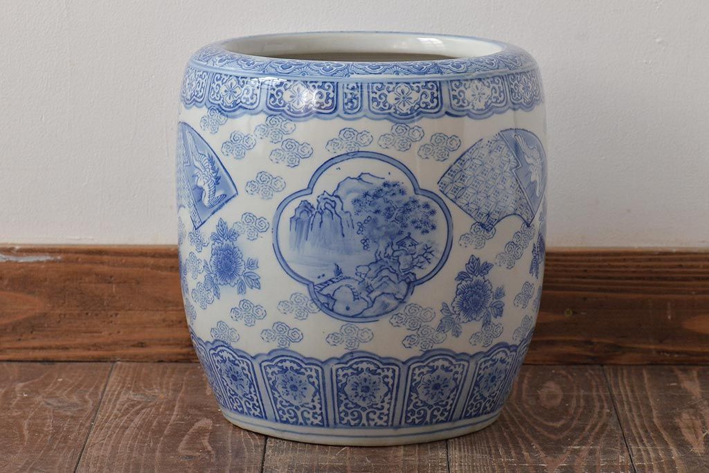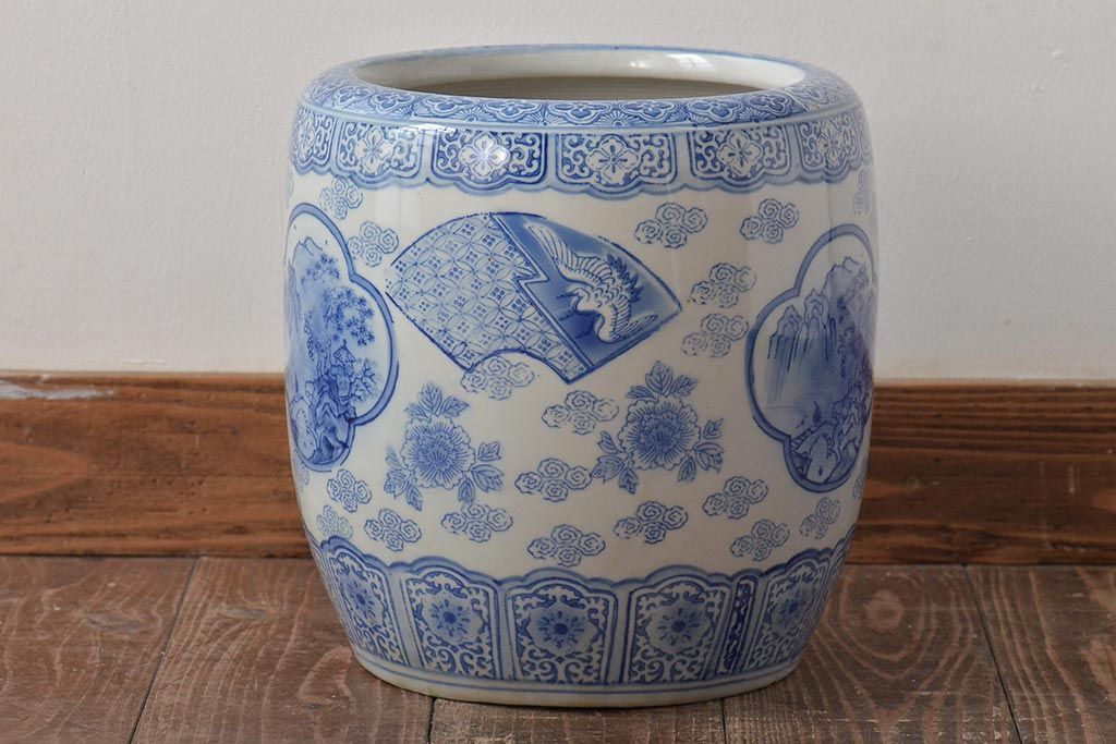 アンティーク雑貨 鶴・花・風景の図 瀬戸火鉢(鉢カバー、傘立て)(R-044669)