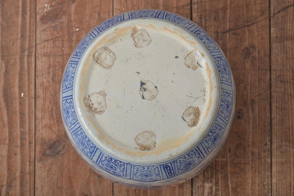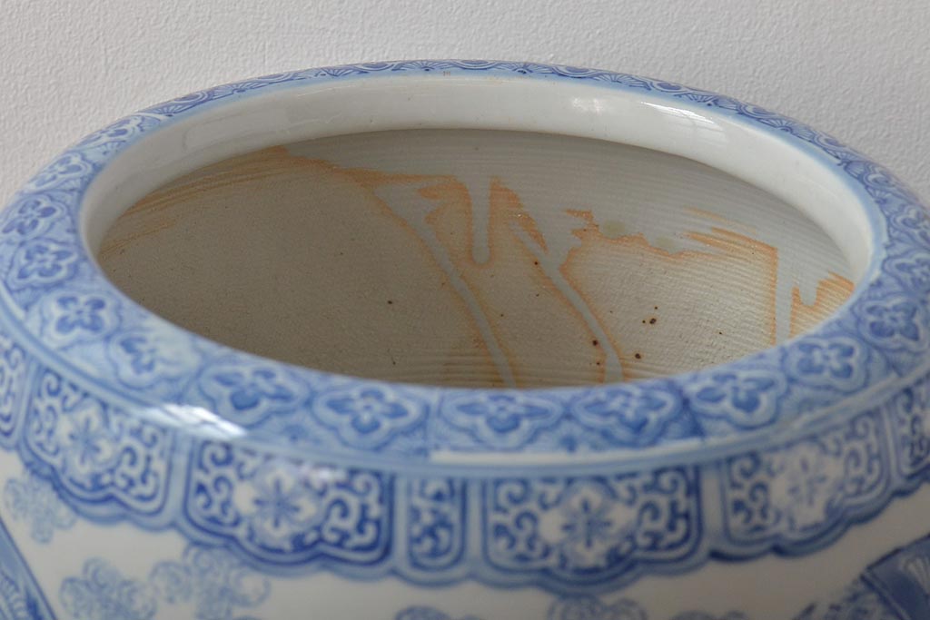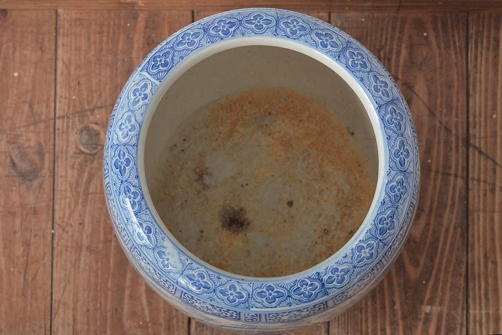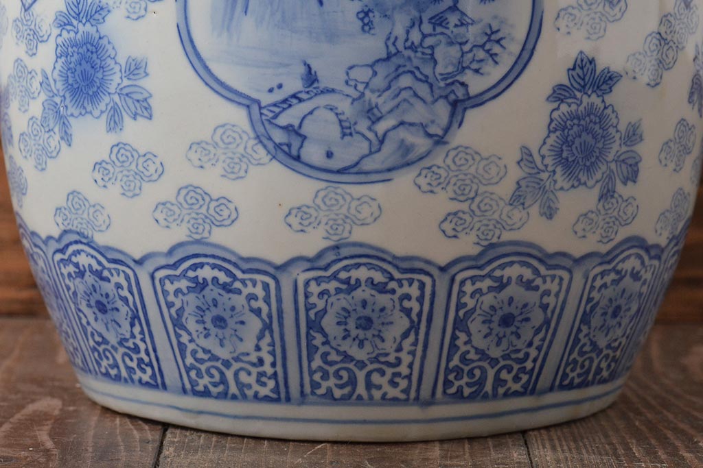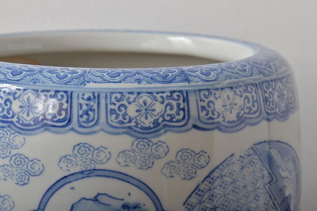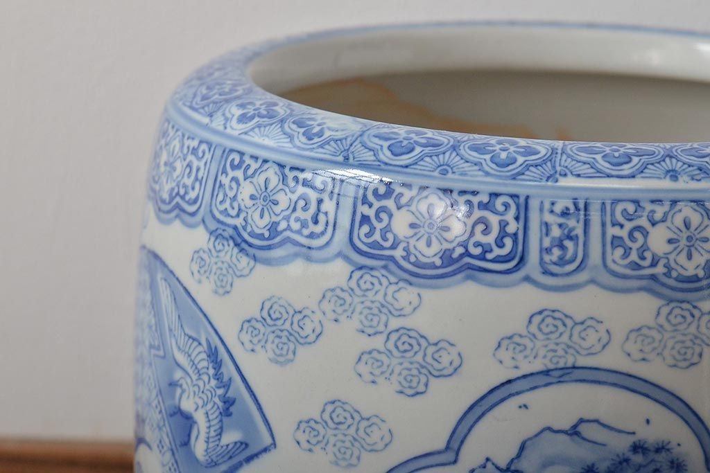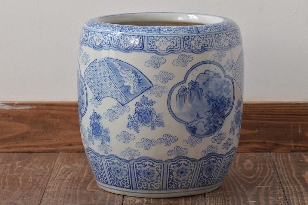 アンティーク雑貨 鶴・花・風景の図 瀬戸火鉢(鉢カバー、傘立て)(R-044669)