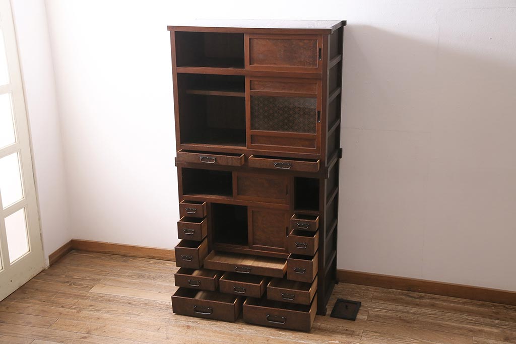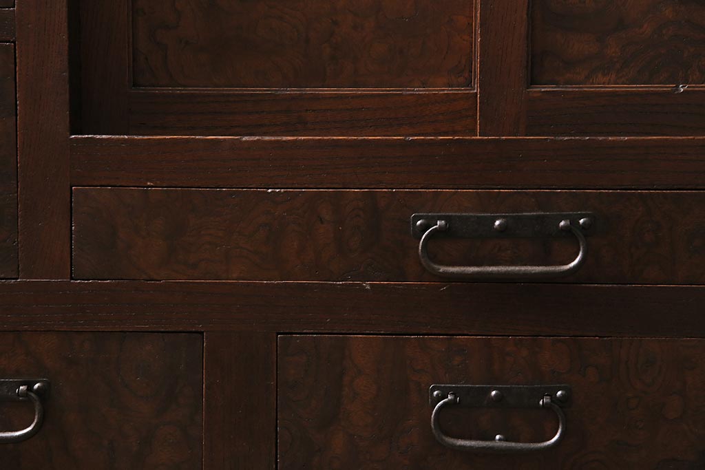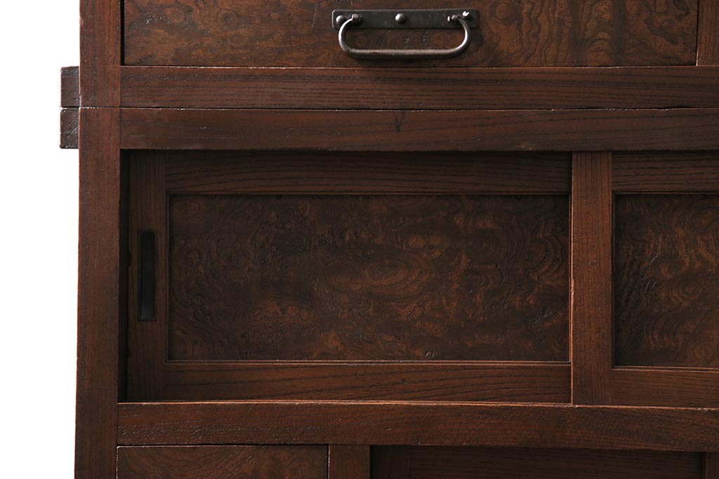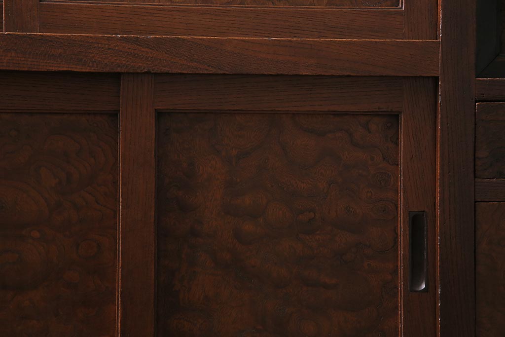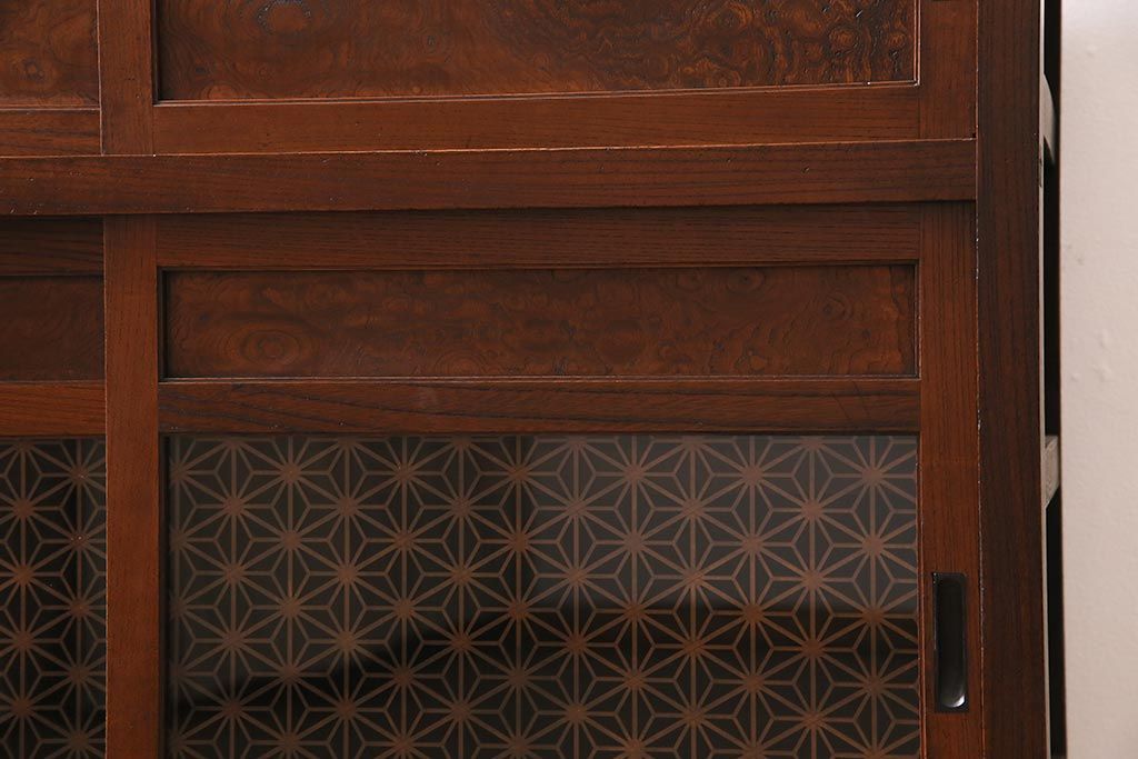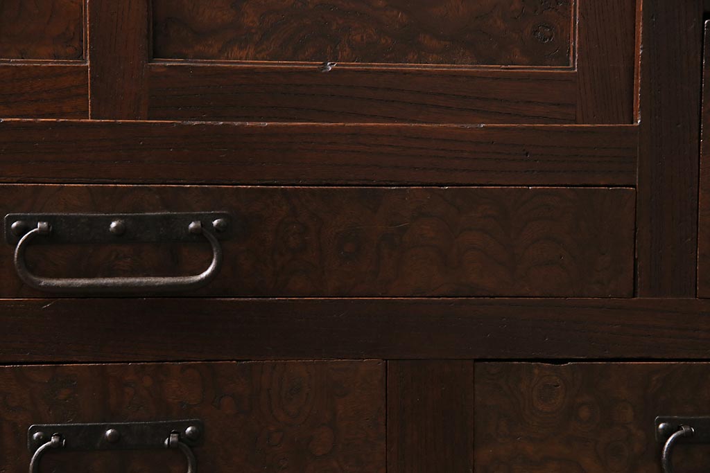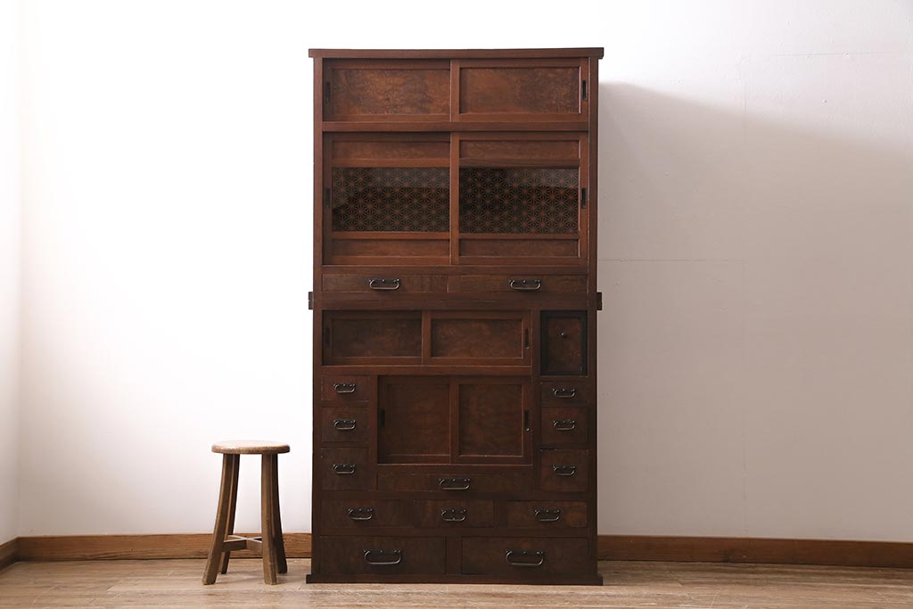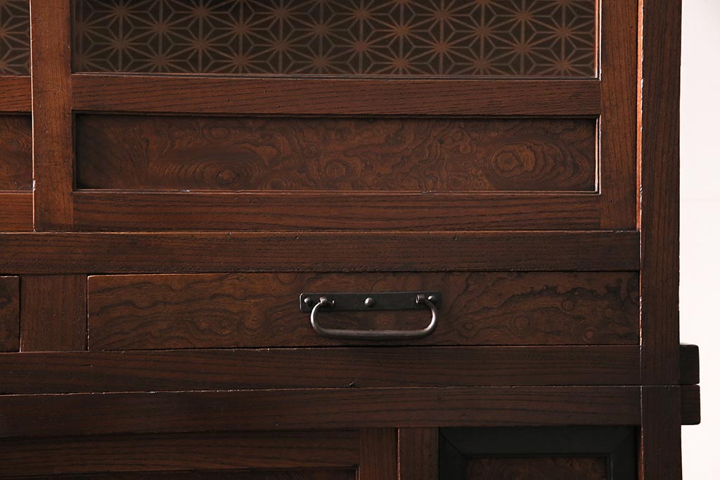 アンティーク家具 上手物 前面ケヤキ 玉杢や凝ったつくりが素晴らしい組子入り関東水屋箪笥・重ね(茶箪笥)(R-044173)