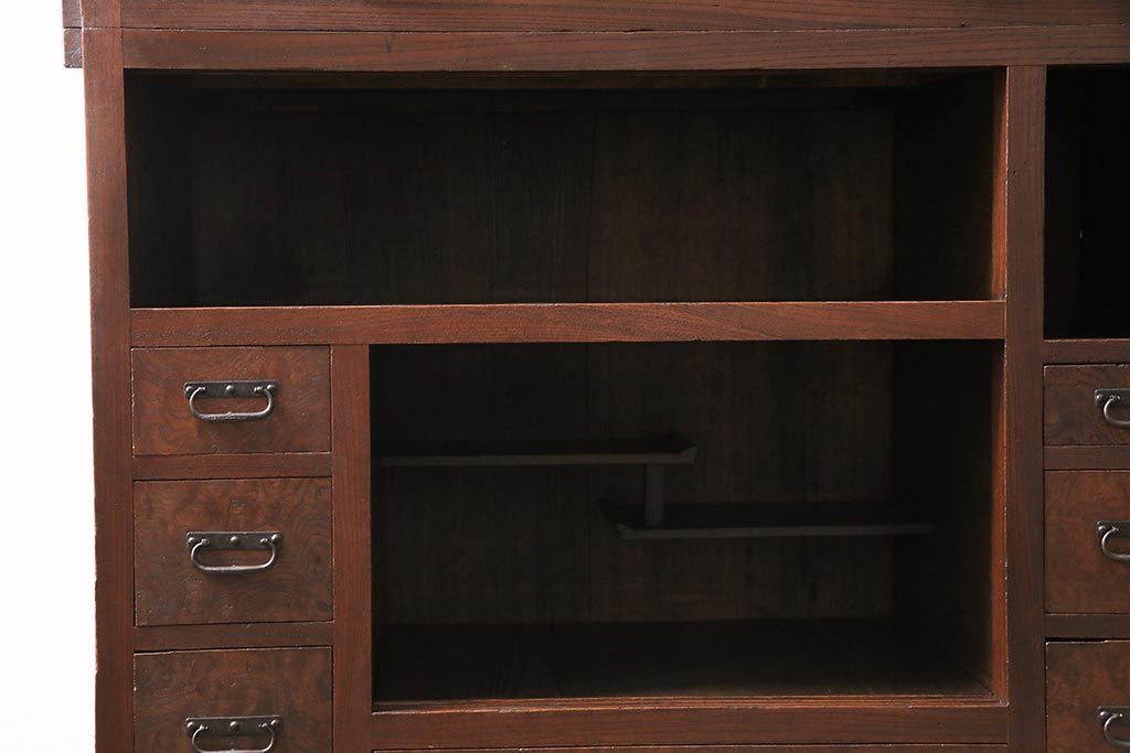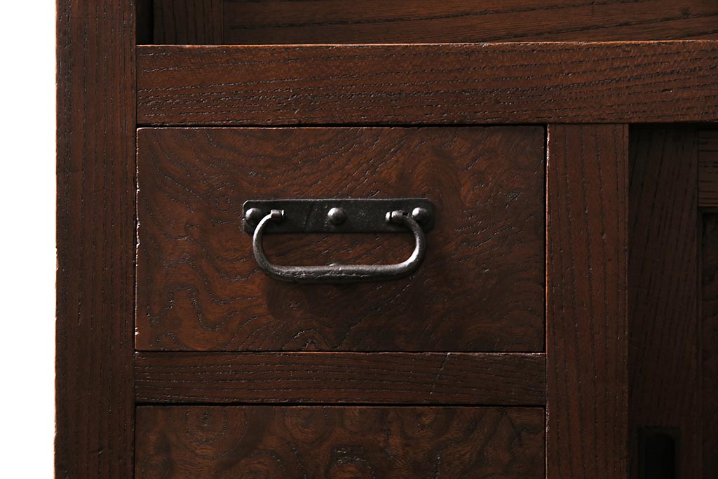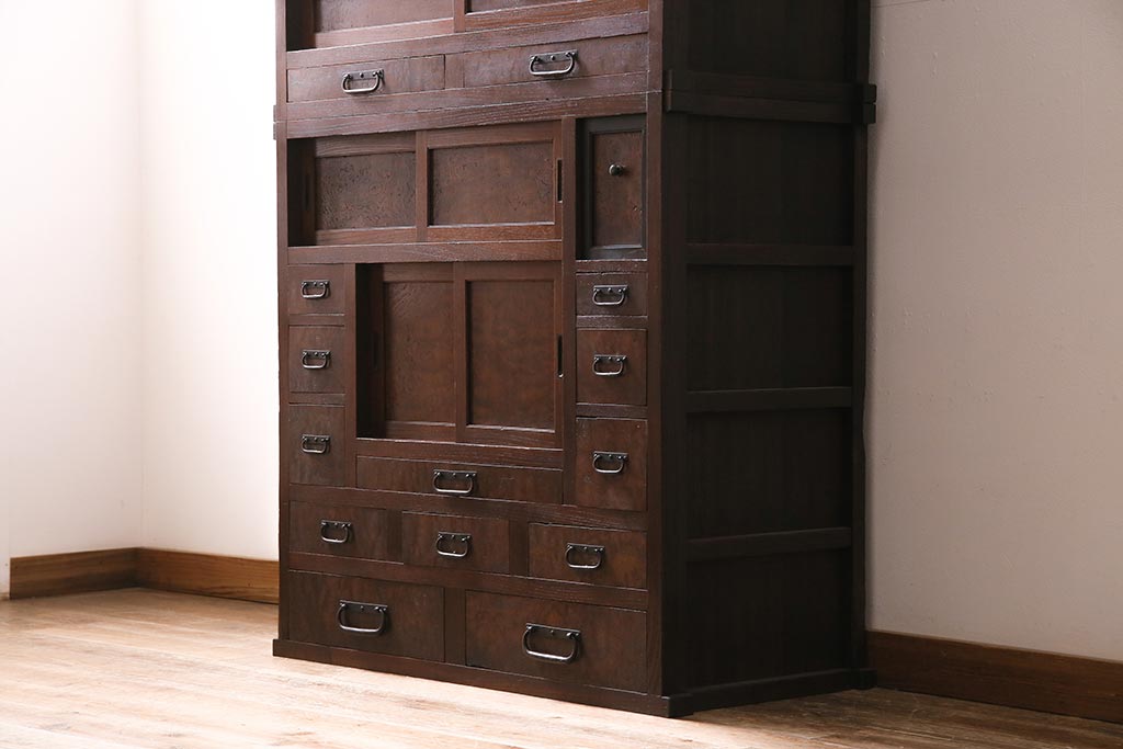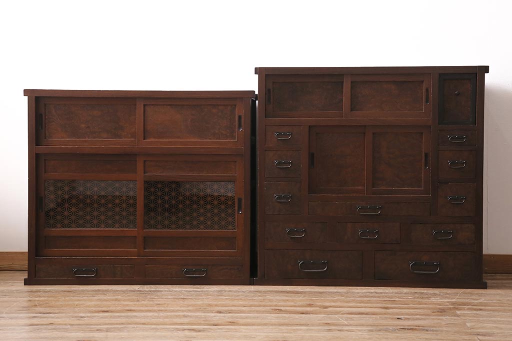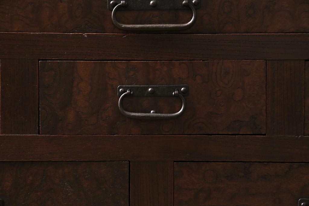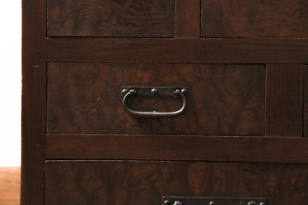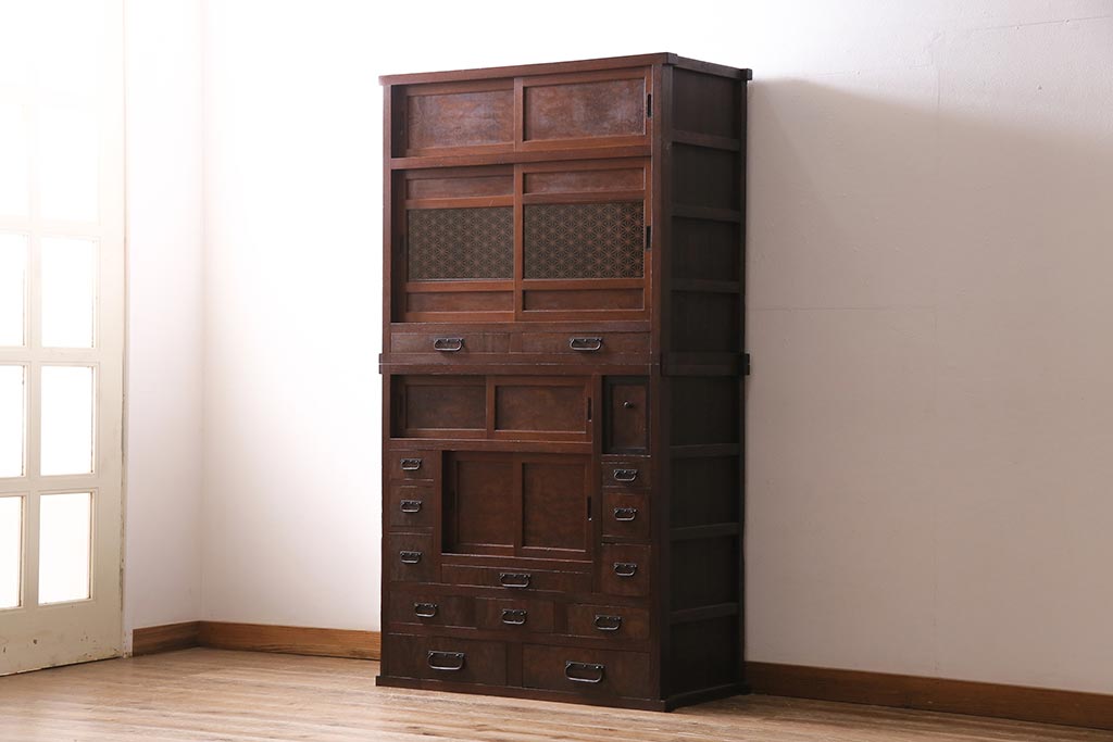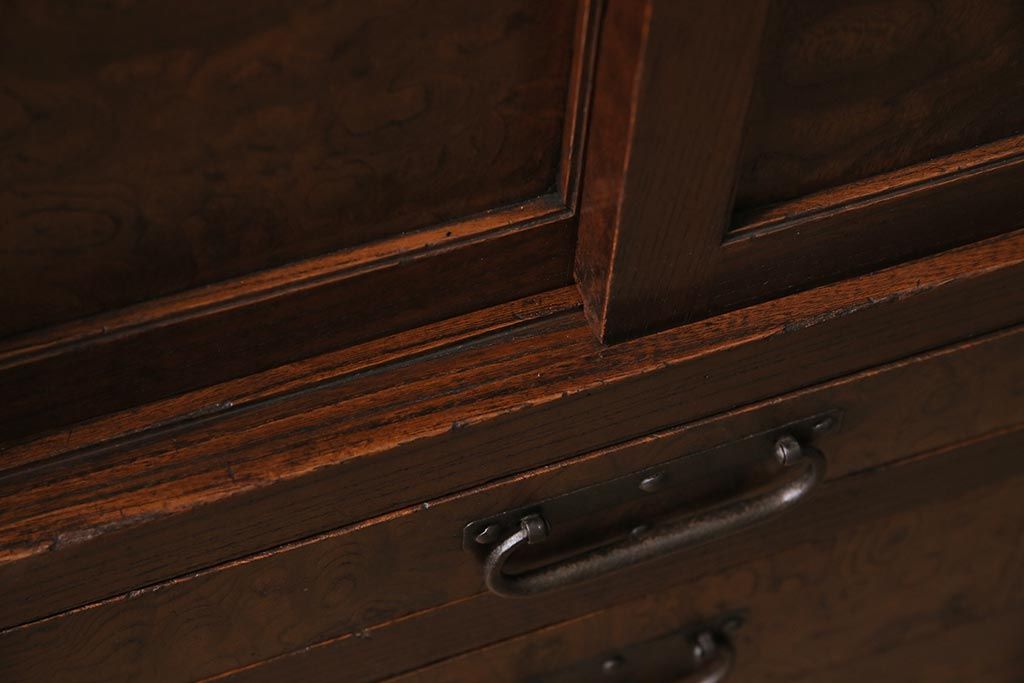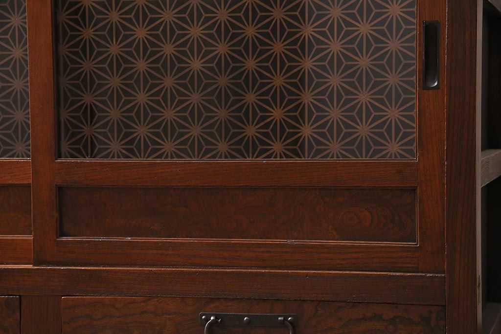 アンティーク家具 上手物 前面ケヤキ 玉杢や凝ったつくりが素晴らしい組子入り関東水屋箪笥・重ね(茶箪笥)(R-044173)