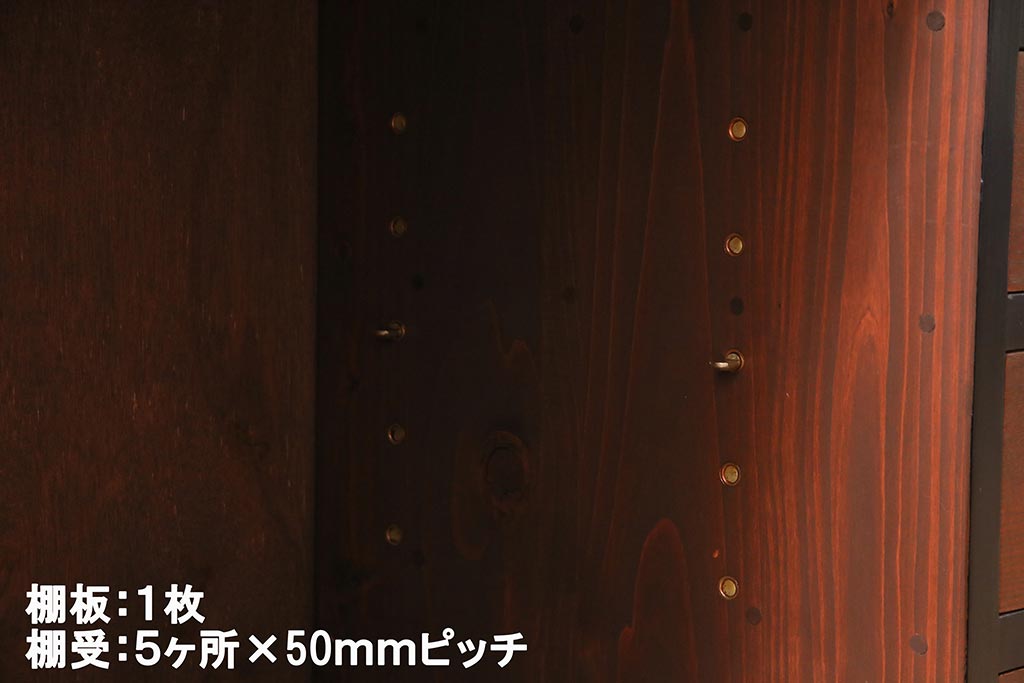 棚板は取り外しできます。棚板は1枚あります。棚受けは5ヶ所、50mmピッチで調整できます。棚幅サイズのものが1枚の作りです。