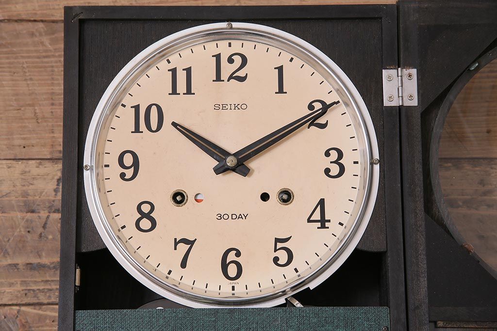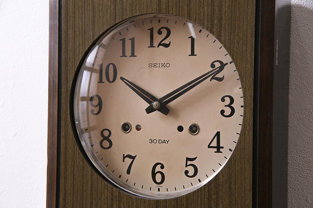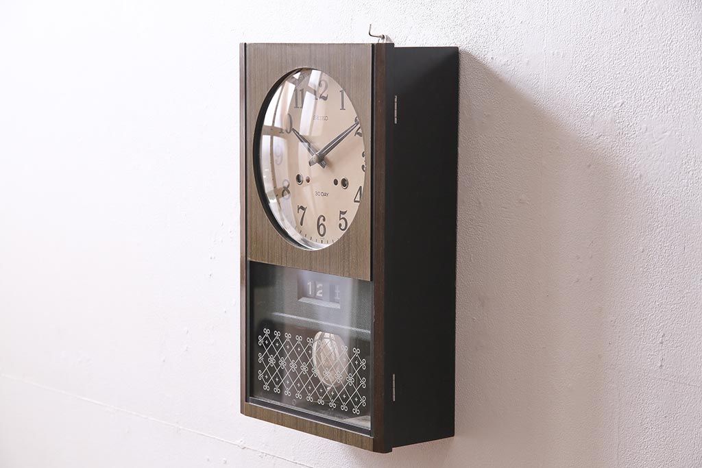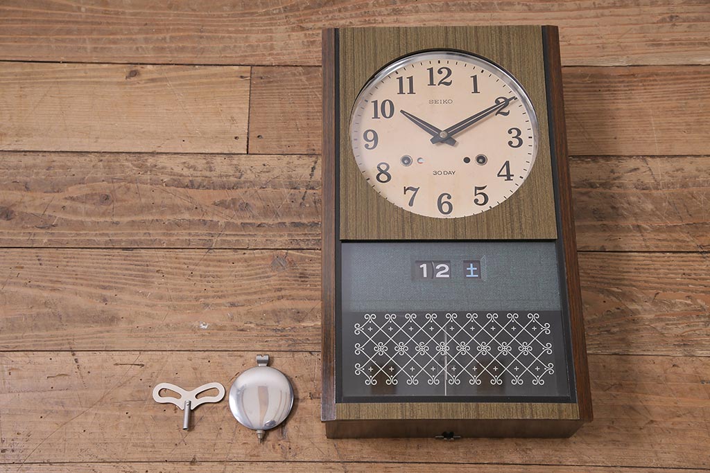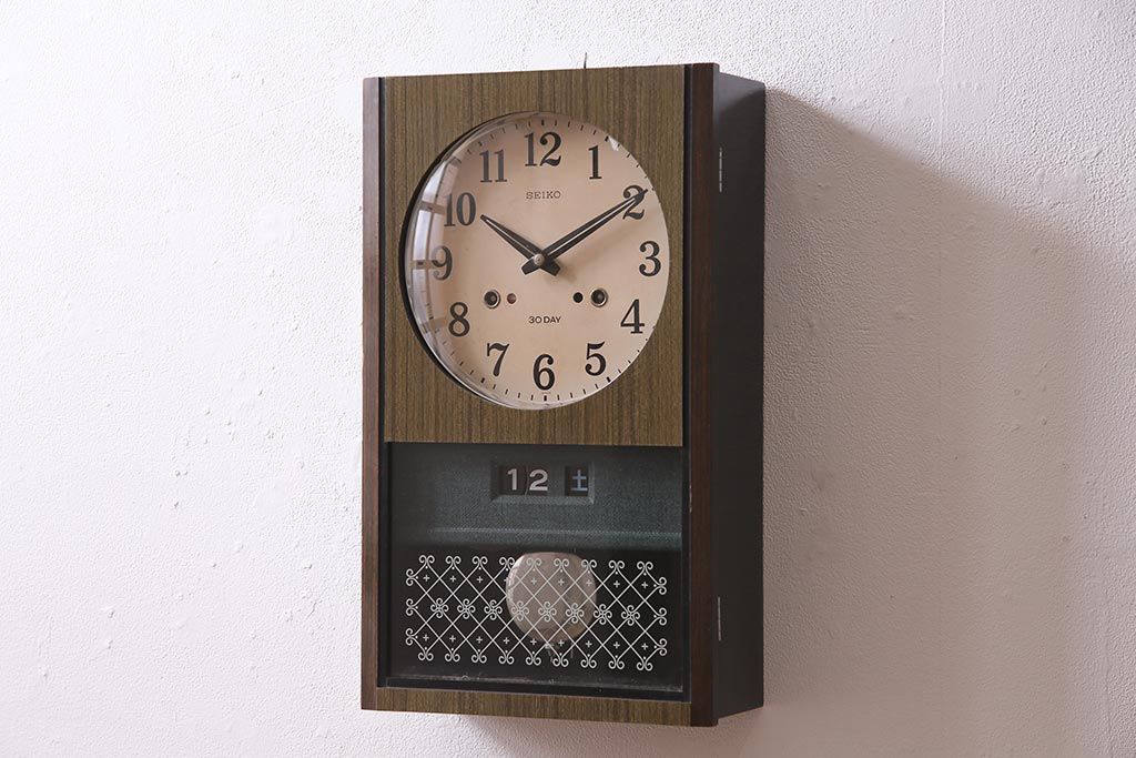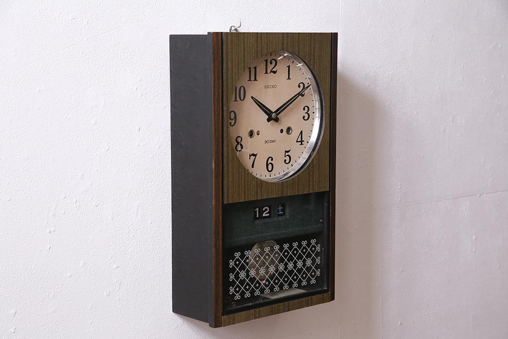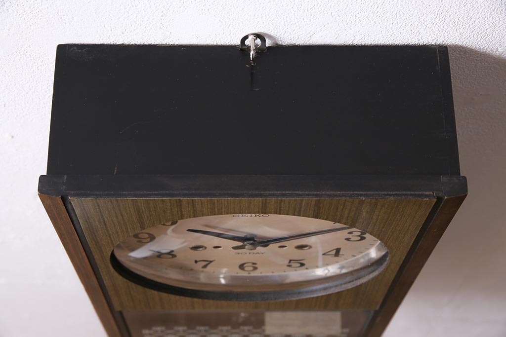 レトロ雑貨 SEIKO(セイコー) ゼンマイ式 カレンダー付き 渋い色合いがレトロな掛け時計(柱時計、振り子時計)(R-044746)です。