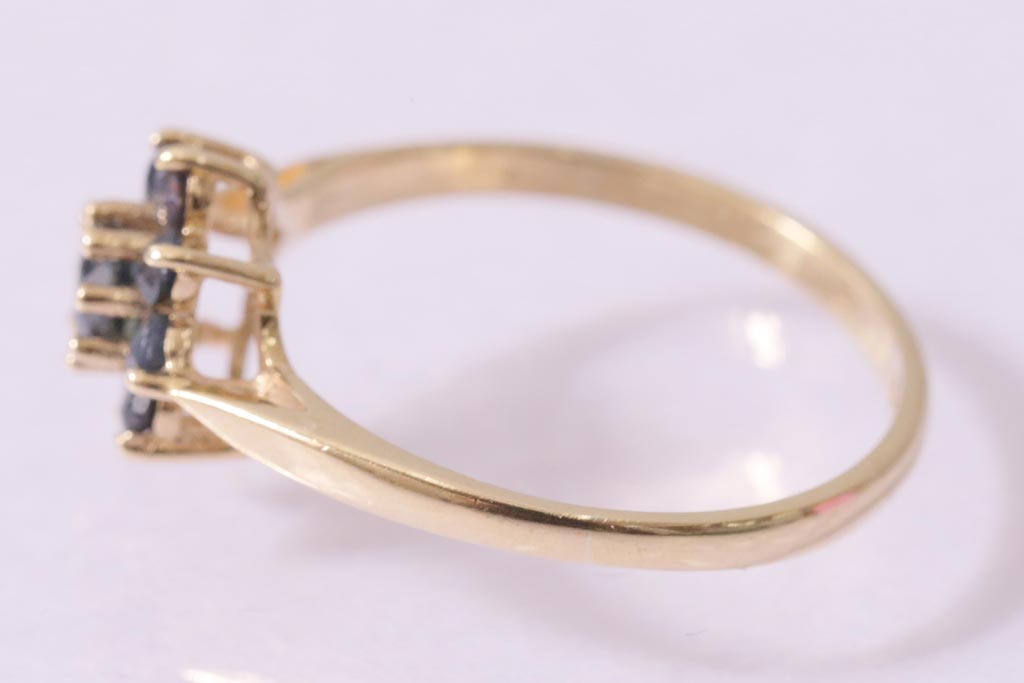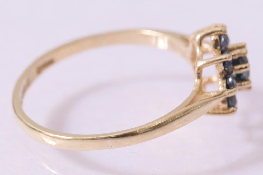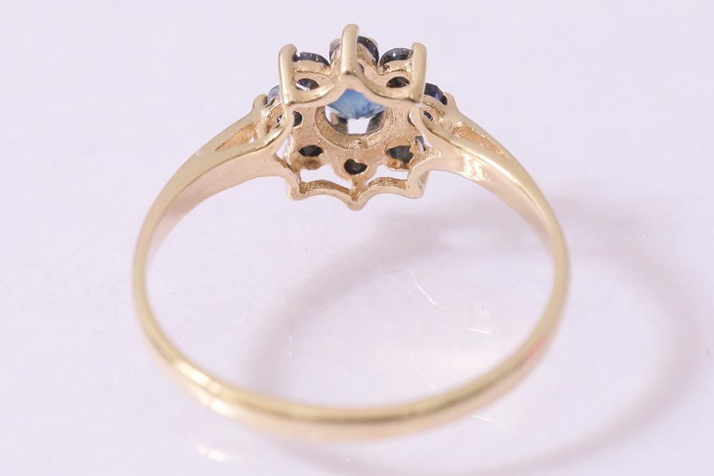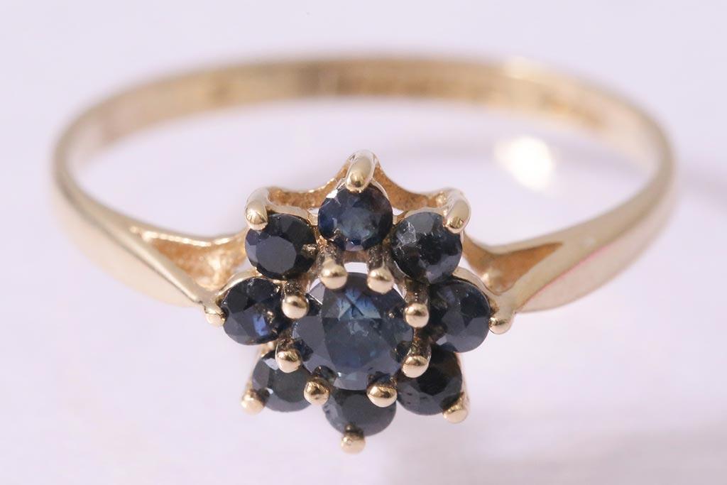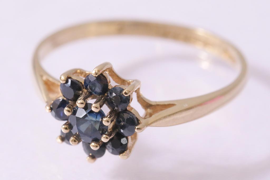 ヴィンテージアクセサリー イギリス ゴールド9K 濃青サファイア フラワーモチーフのリング(指輪、ビンテージ)(R-044712)
