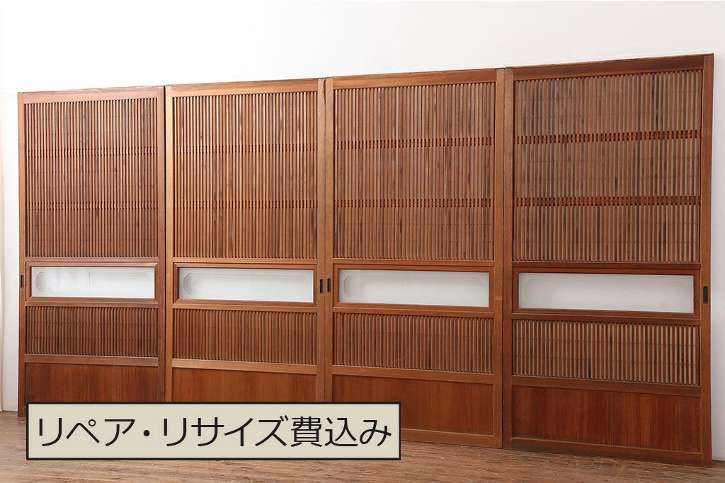 アンティーク建具 裏障子付き 昭和初期 和風の空間づくりにおすすめな格子戸4枚セット(ガラス帯戸、引き戸、建具)(R-044789)
