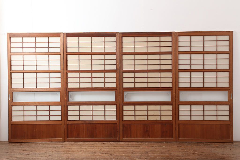 ドア・建具> 障子戸 > アンティーク建具 裏障子付き 昭和初期 和風の空間づくりにおすすめな格子戸4枚セット(ガラス帯戸、引き戸、建具)(R-044789)