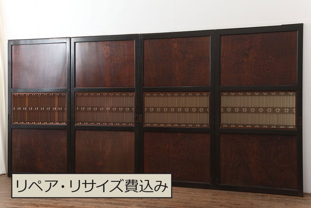 アンティーク建具 激レア 明治大正期 新潟産 漆塗り 玉杢 組子入り板戸4枚セット(帯戸、障子戸、建具、引き戸)(R-044767)
