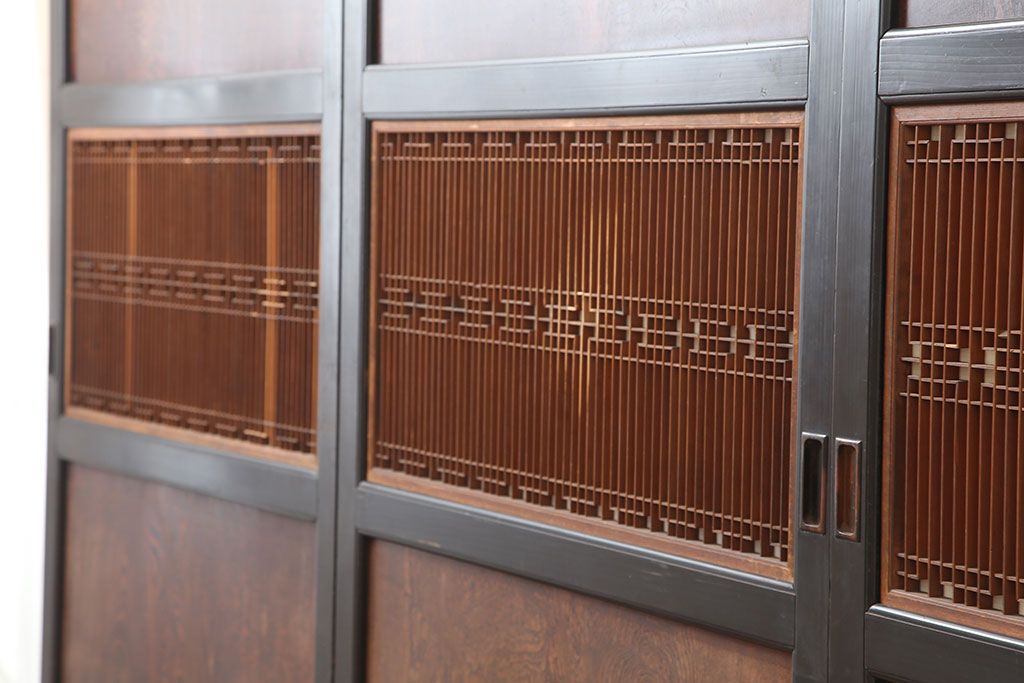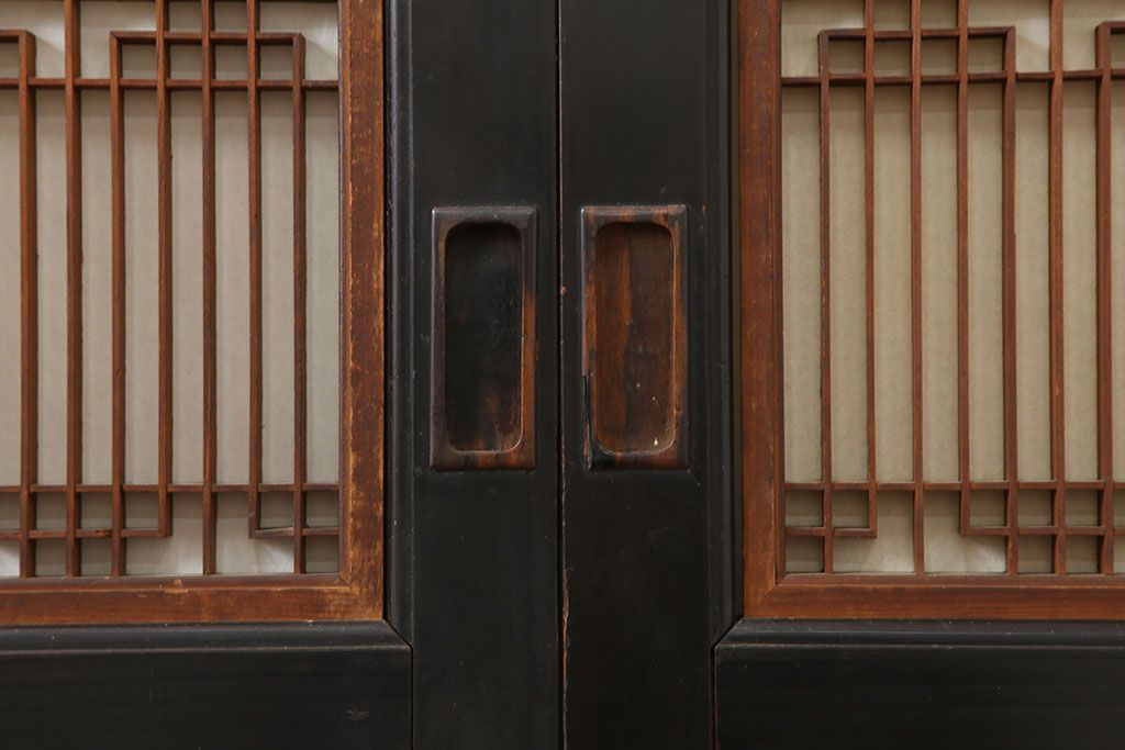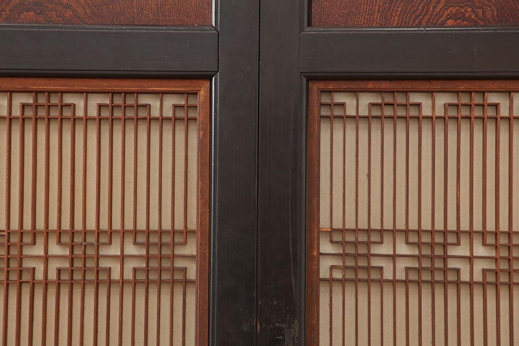 ドア・建具> 組子建具 > アンティーク建具 激レア 明治大正期 新潟産 漆塗り 玉杢 組子入り板戸4枚セット(帯戸、障子戸、建具、引き戸)(R-044767)
