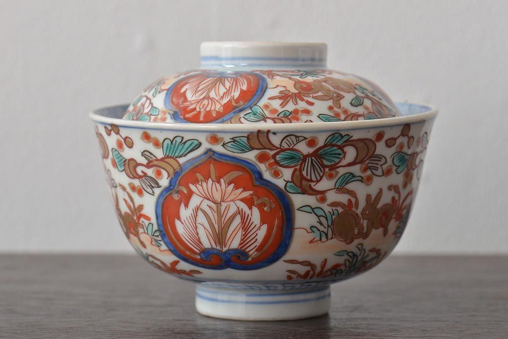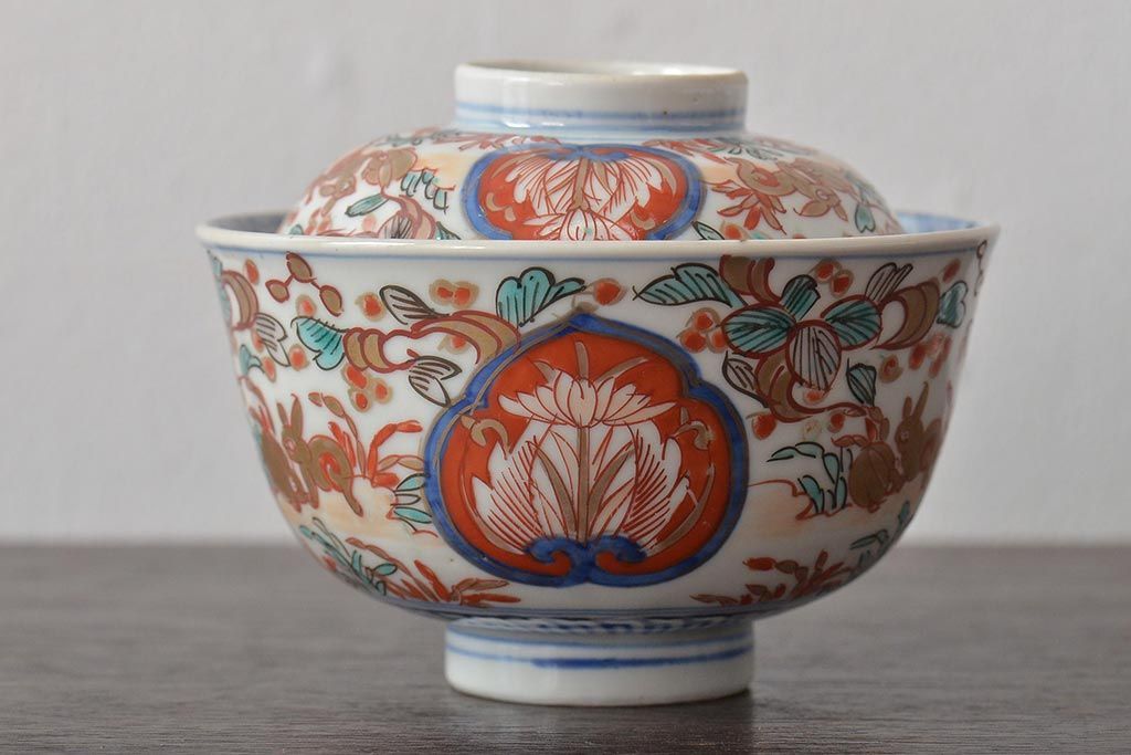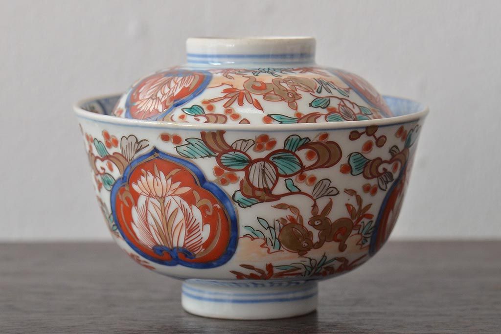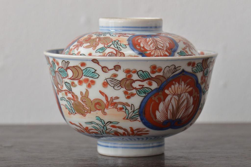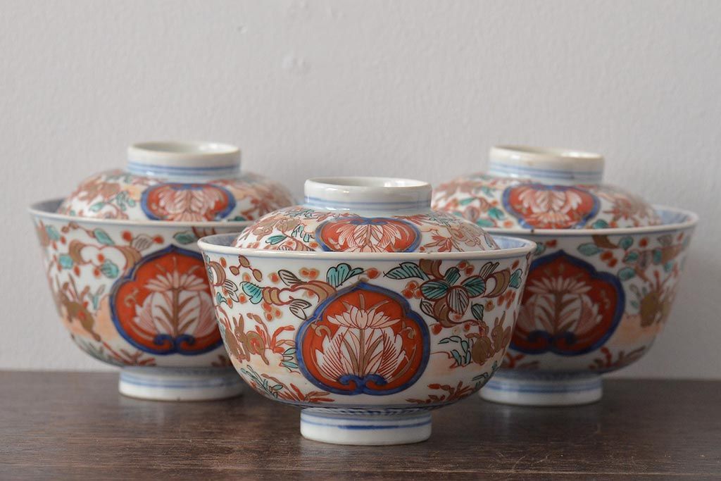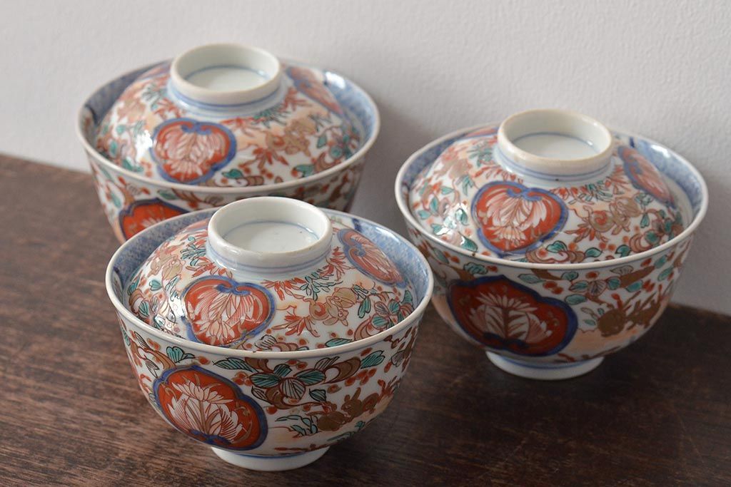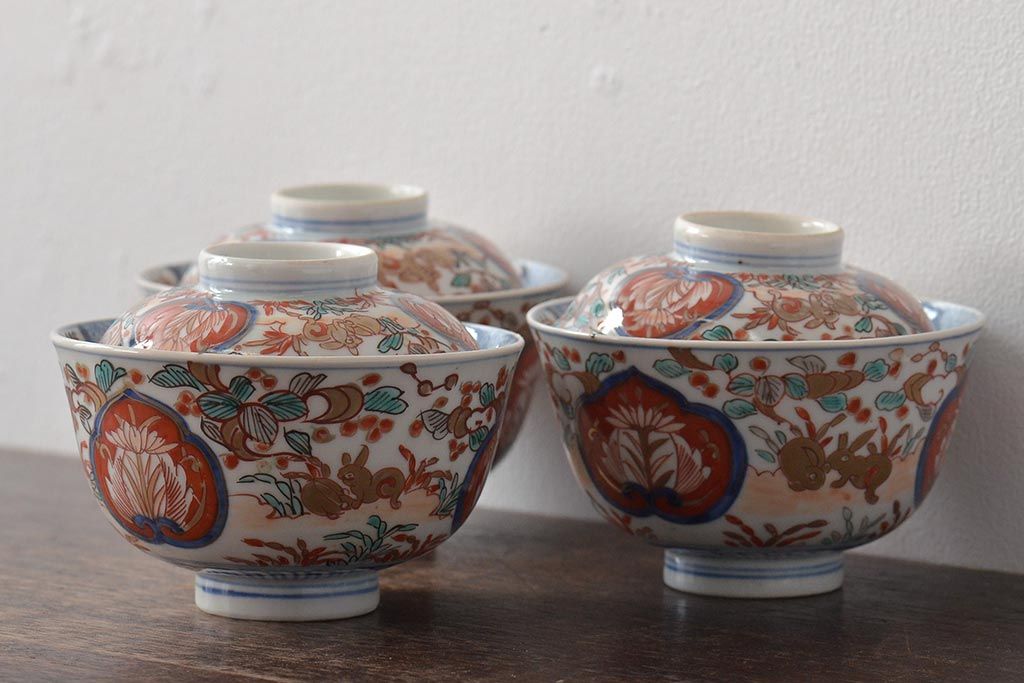 幕末〜明治 伊万里焼 色絵金彩兎図 蓋茶碗3客(和食器)(R-044543)