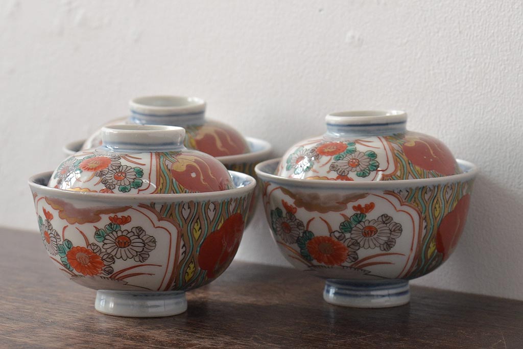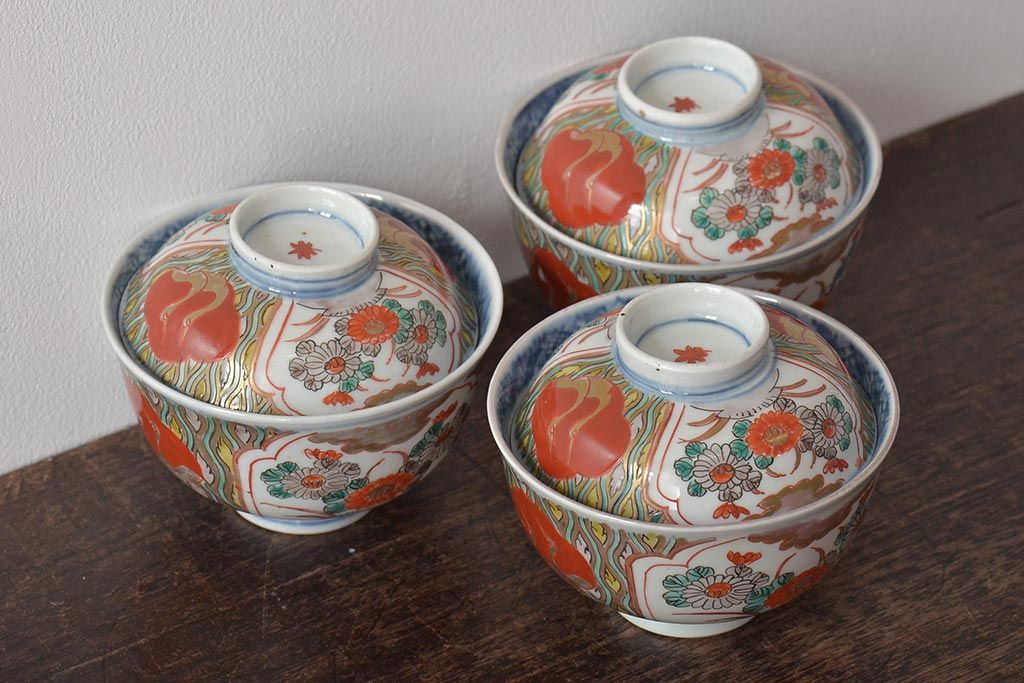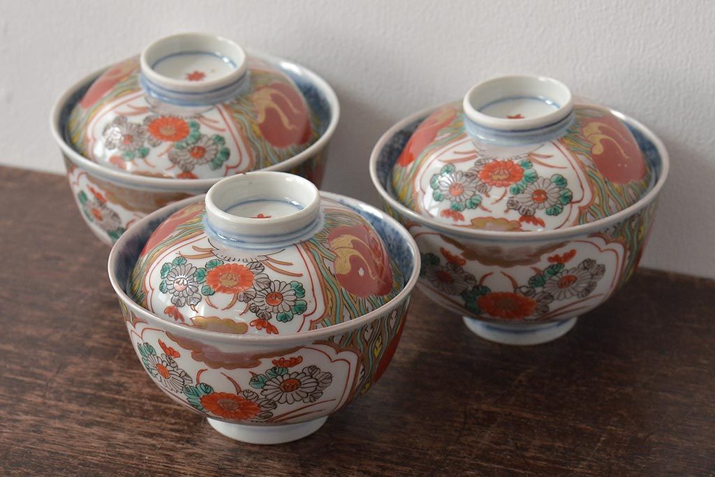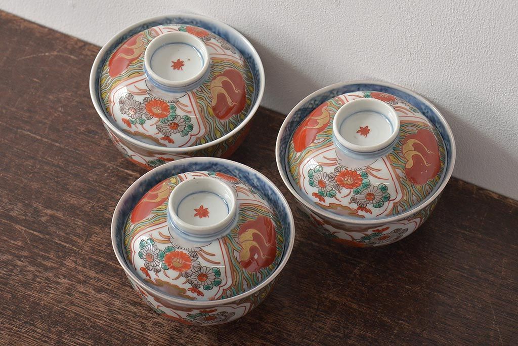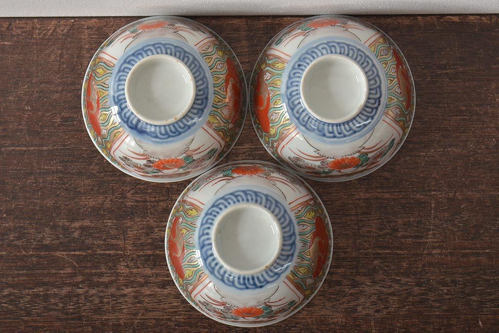 ラフジュ工房> 骨董・美術品> 骨董-陶磁器 > 江戸期 古伊万里 色絵染付蓋茶碗3客(和食器)(R-044575)