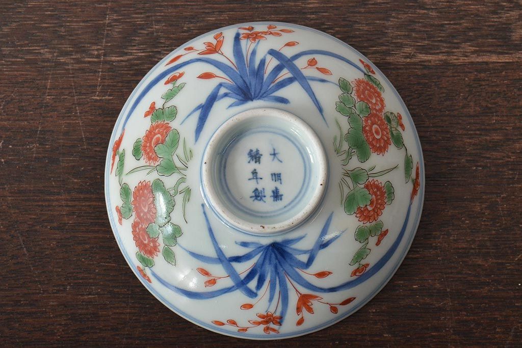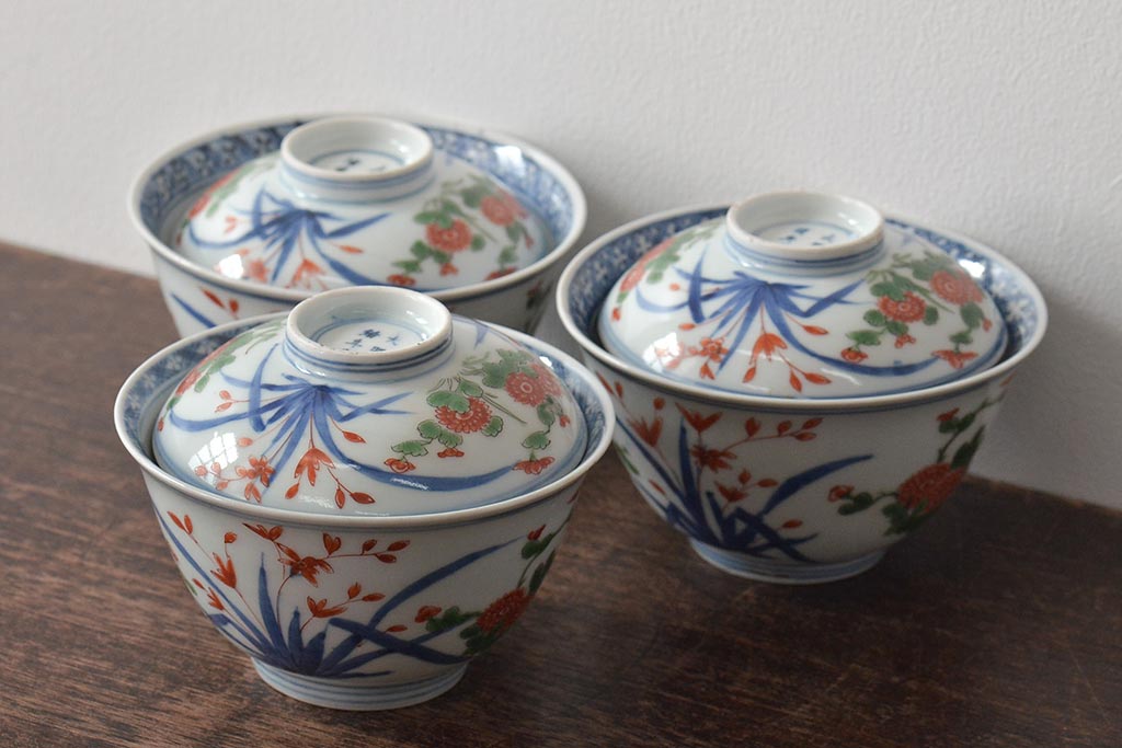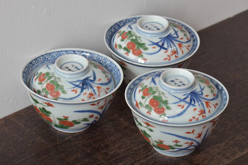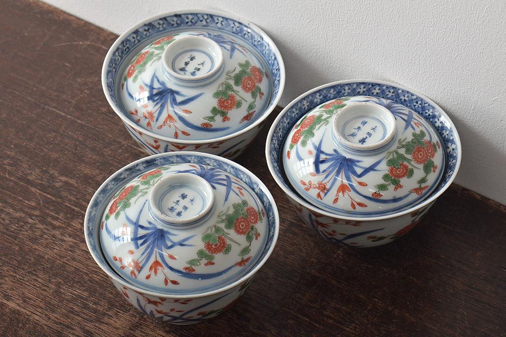 ラフジュ工房> 骨董・美術品> 骨董-陶磁器 > 江戸期 古伊万里 大明年製 色絵染付 蓋茶碗3客(上手物古伊万里)(R-044632)
