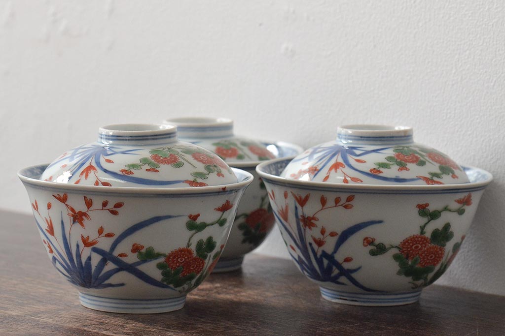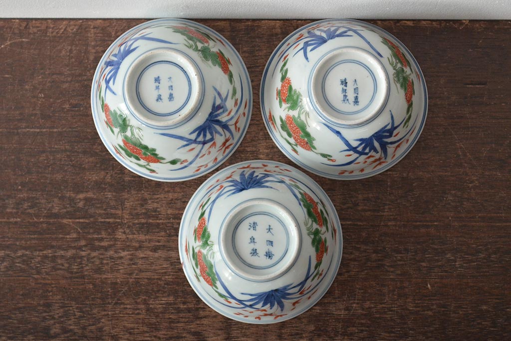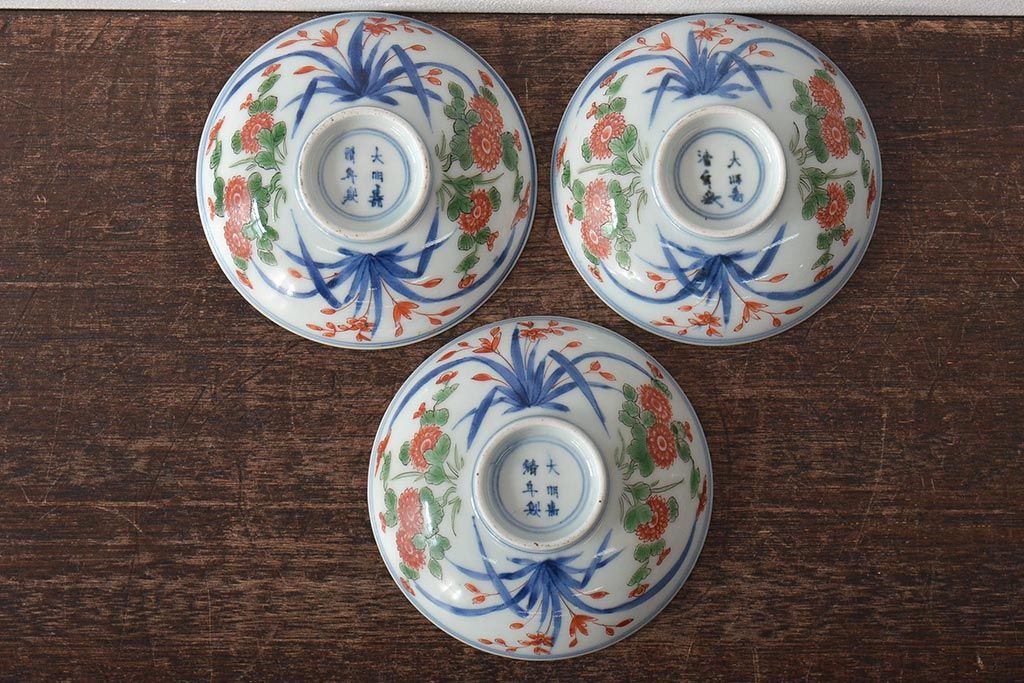 江戸期 古伊万里 大明年製 色絵染付 蓋茶碗3客(上手物古伊万里)(R-044632)