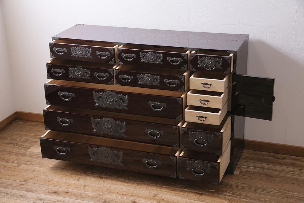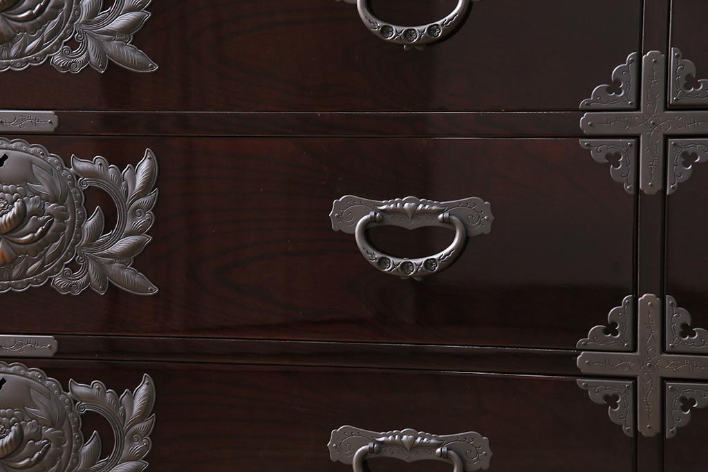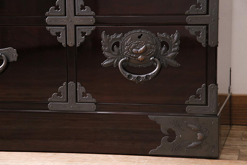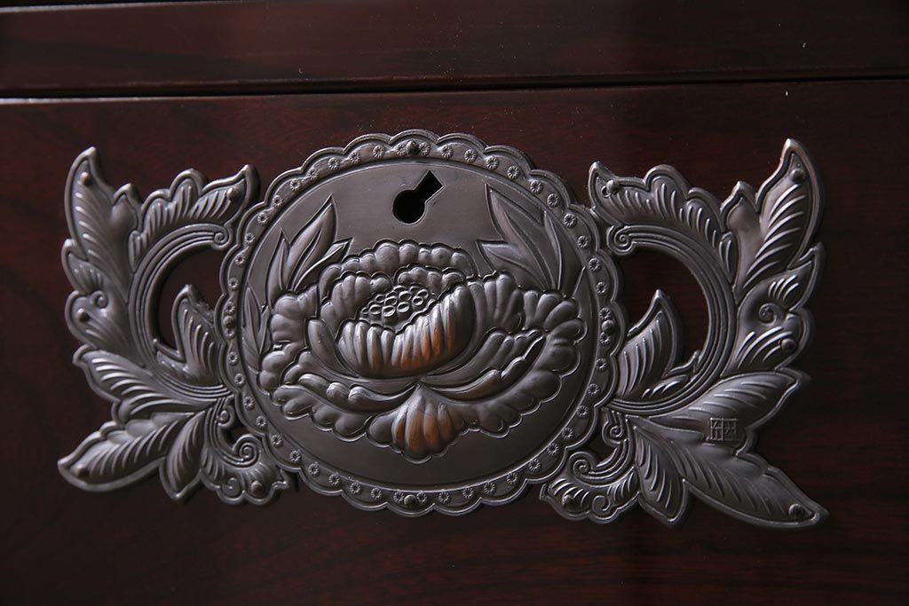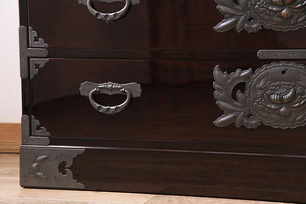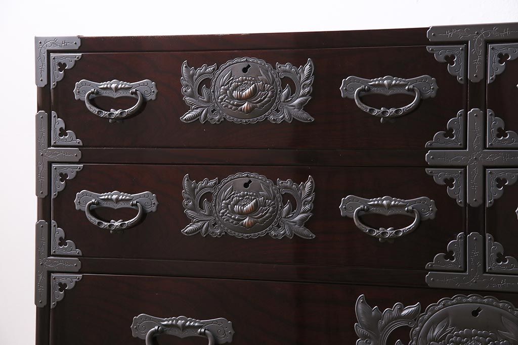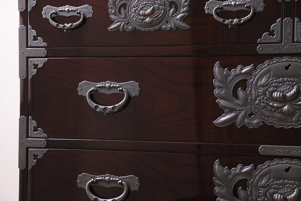 和箪笥 > 中古 仙台民芸箪笥(仙台箪笥) 欅産業 木地呂塗りと牡丹金具が美しい衣装箪笥(整理箪笥、引き出し)(定価約115万円)(R-043835)