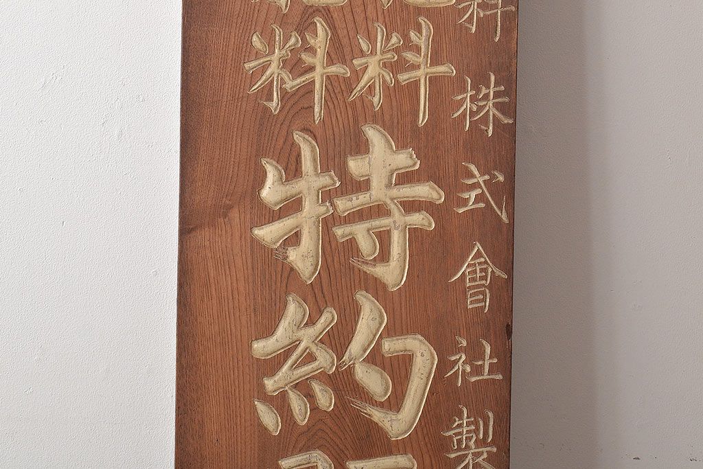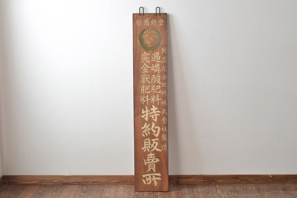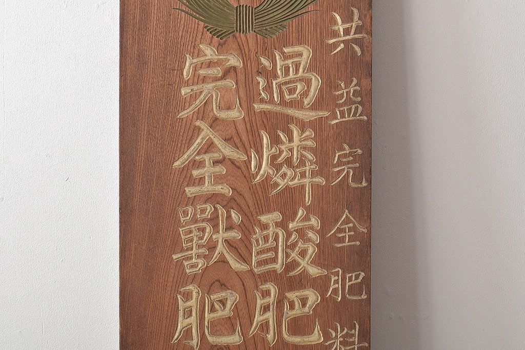 戦前 肥料 木製看板(過燐酸、完全獣、ケヤキ製)(R-044792)です。