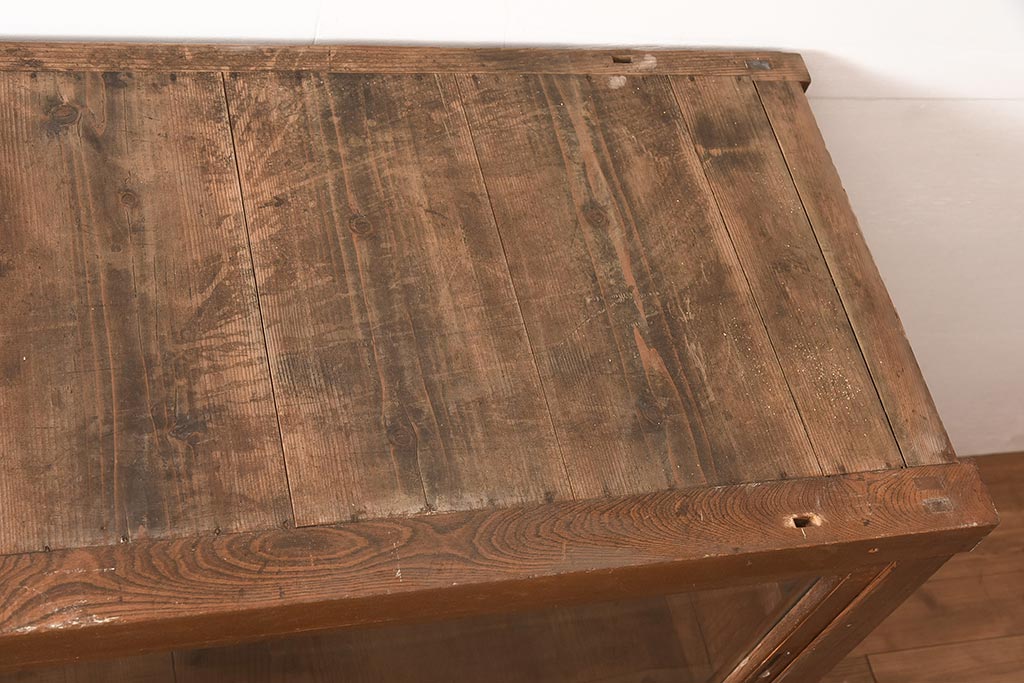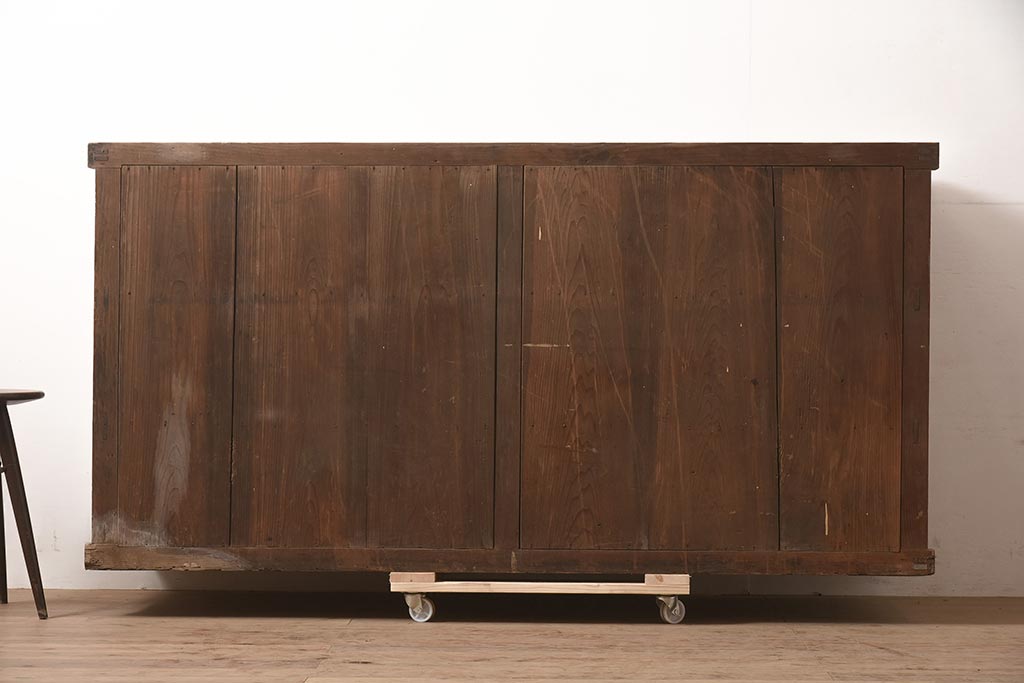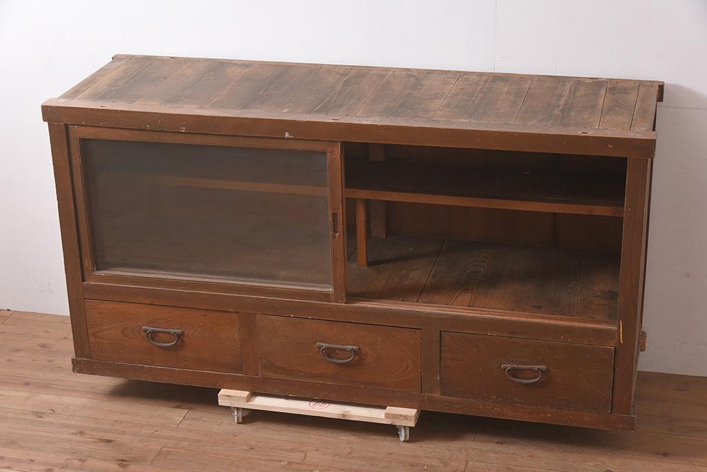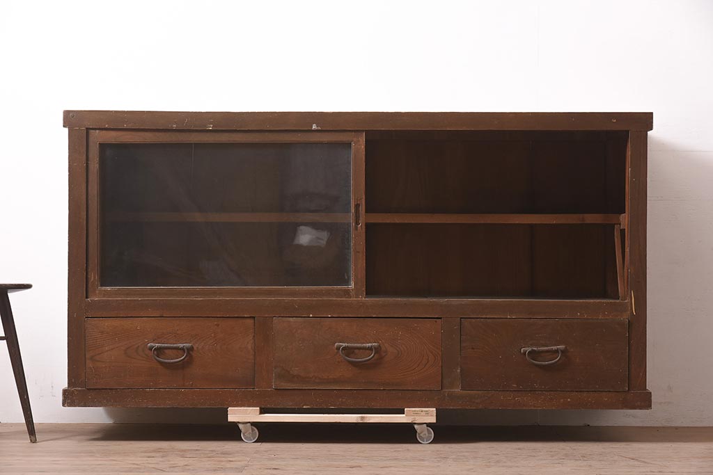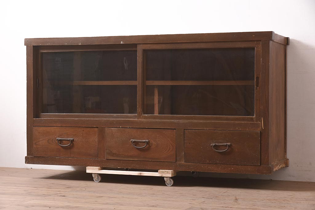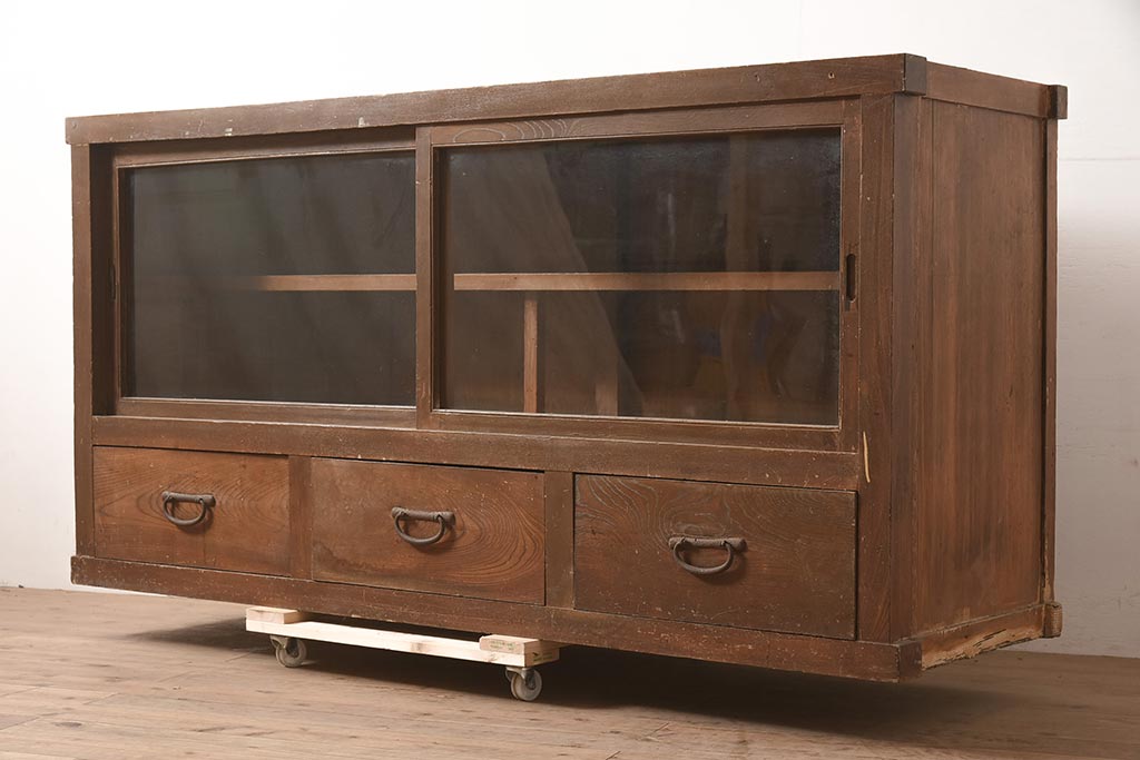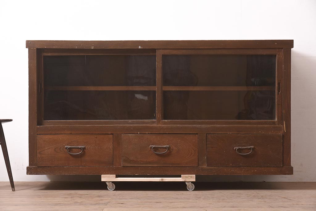 アンティーク家具 昭和初期 前面ケヤキ材 引き出し付き 味のあるシンプルなつくりのガラス戸棚(キャビネット、収納棚、本箱、食器棚)(R-044959)です。