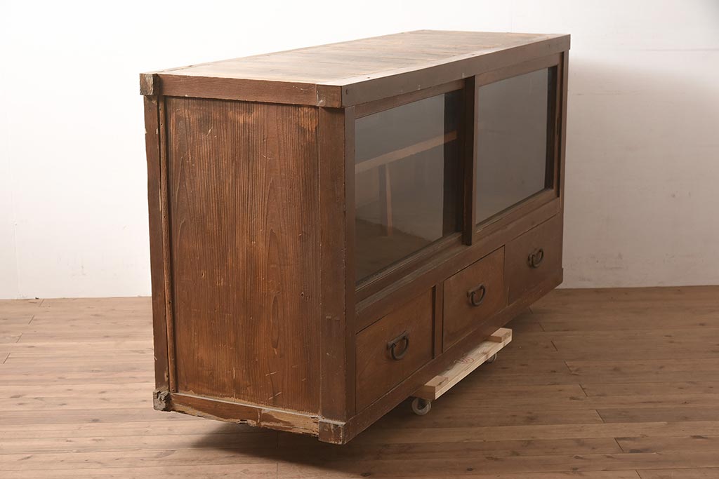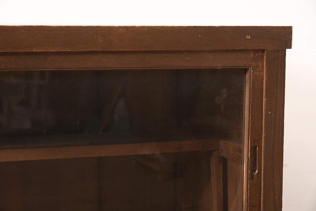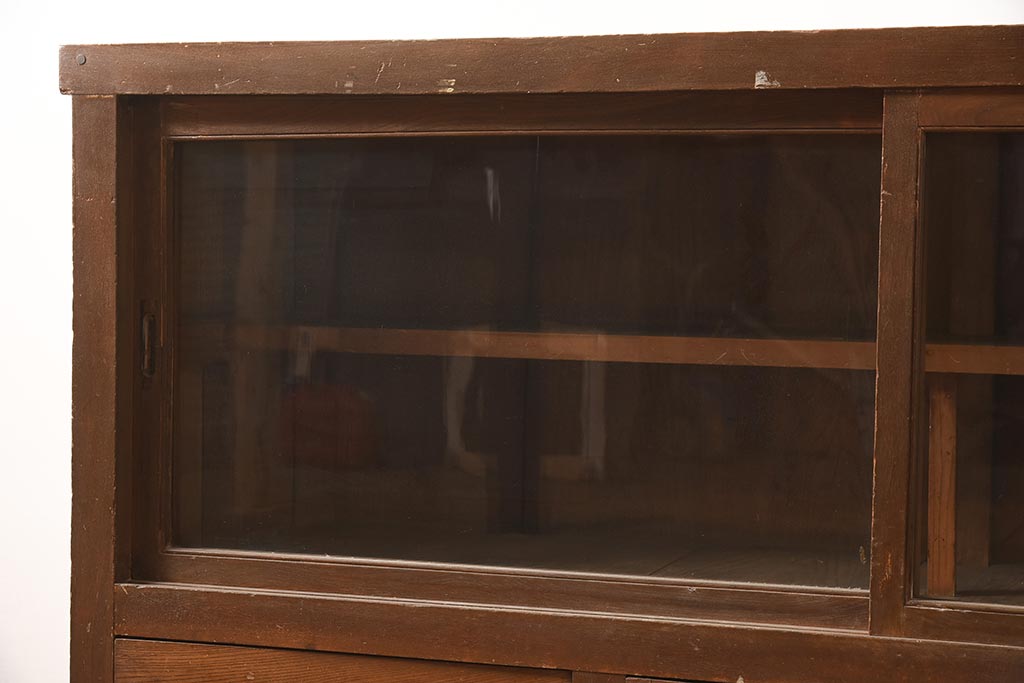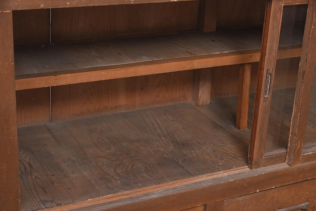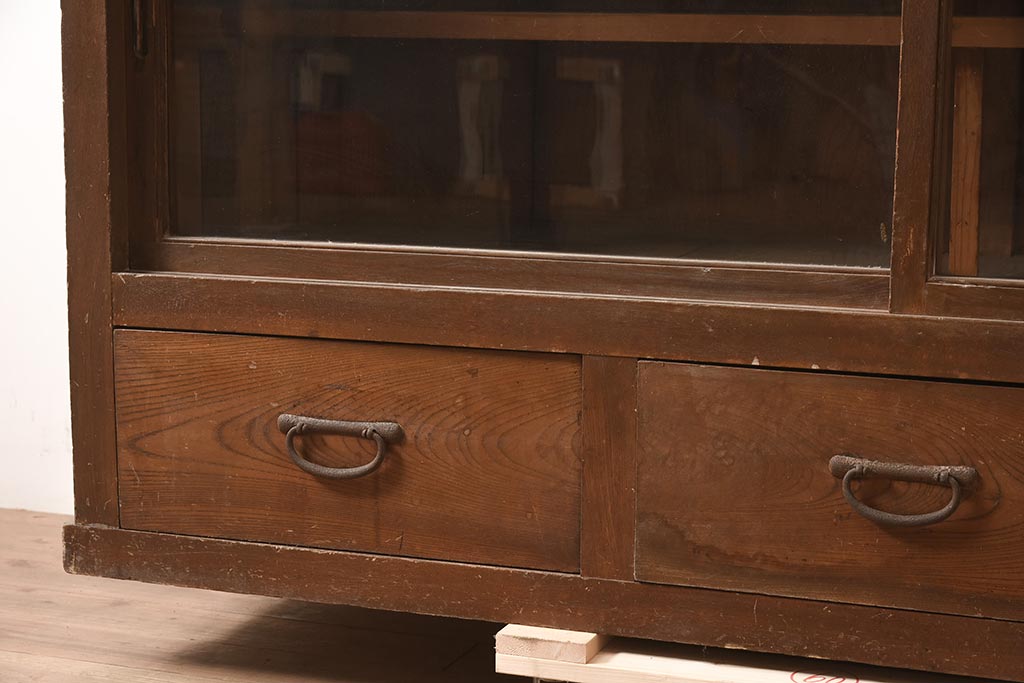 アンティーク家具 昭和初期 前面ケヤキ材 引き出し付き 味のあるシンプルなつくりのガラス戸棚(キャビネット、収納棚、本箱、食器棚)(R-044959)