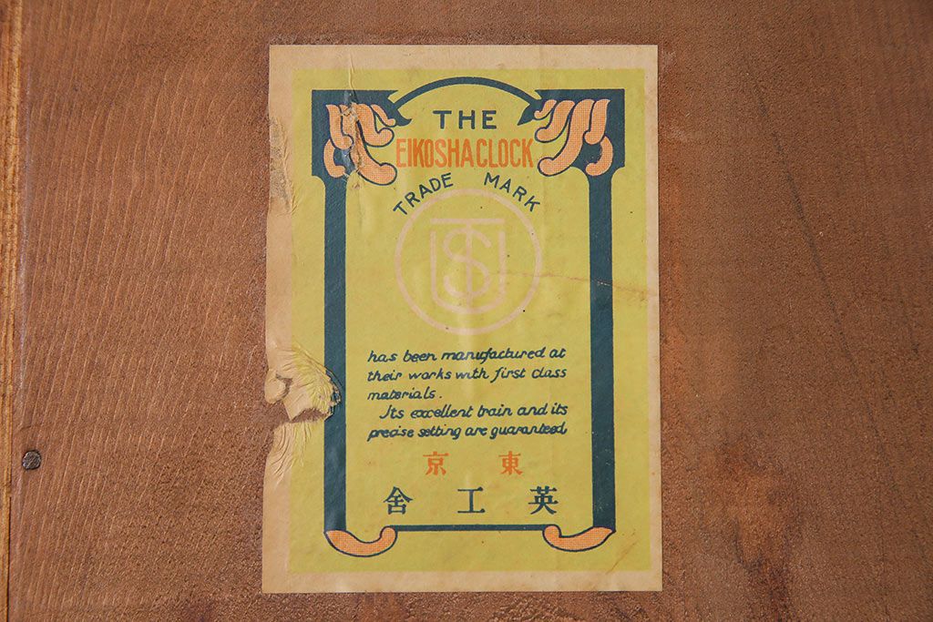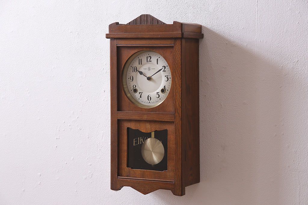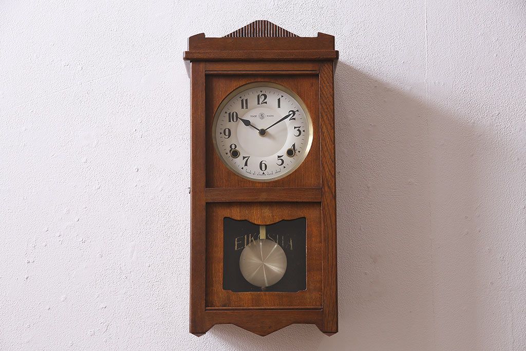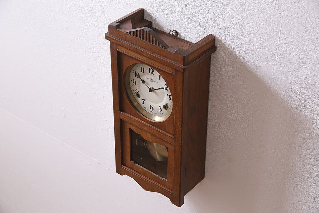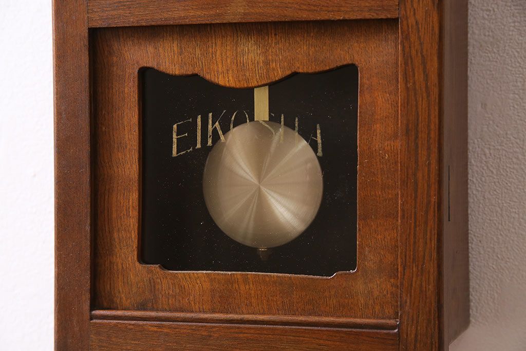 アンティーク時計 昭和初期 EIKOSHA(鶴巻時計店英工舎) 電池式 木の温もり感じる宮型掛時計(柱時計、振り子時計)(R-044817)