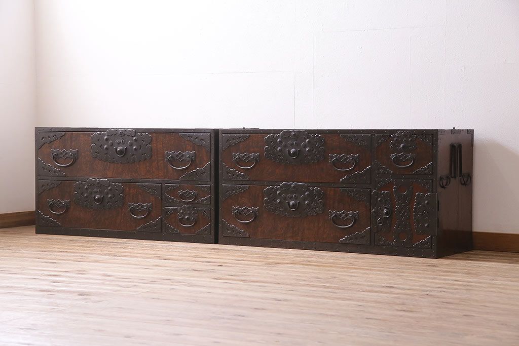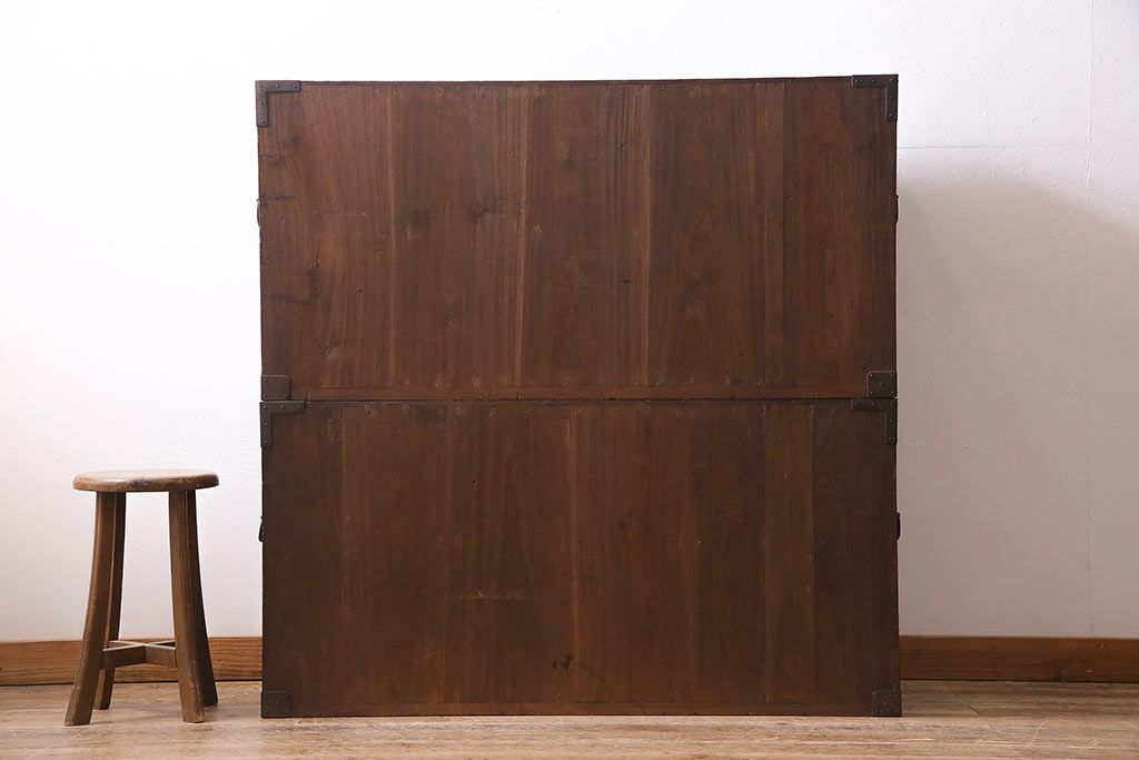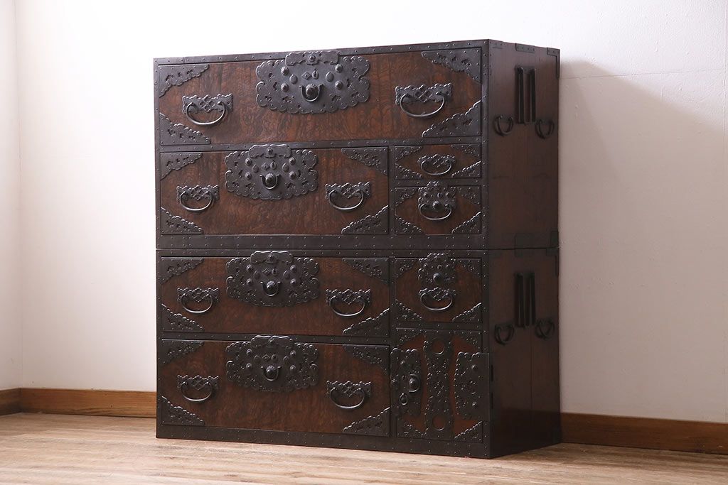 ラフジュ工房> 和箪笥> 衣装箪笥 > アンティーク家具 前面ケヤキ材 玉杢 分厚い金具が目を引く上手物の佐渡小木箪笥(佐渡箪笥、衣装箪笥、重ね箪笥)(R-045038)