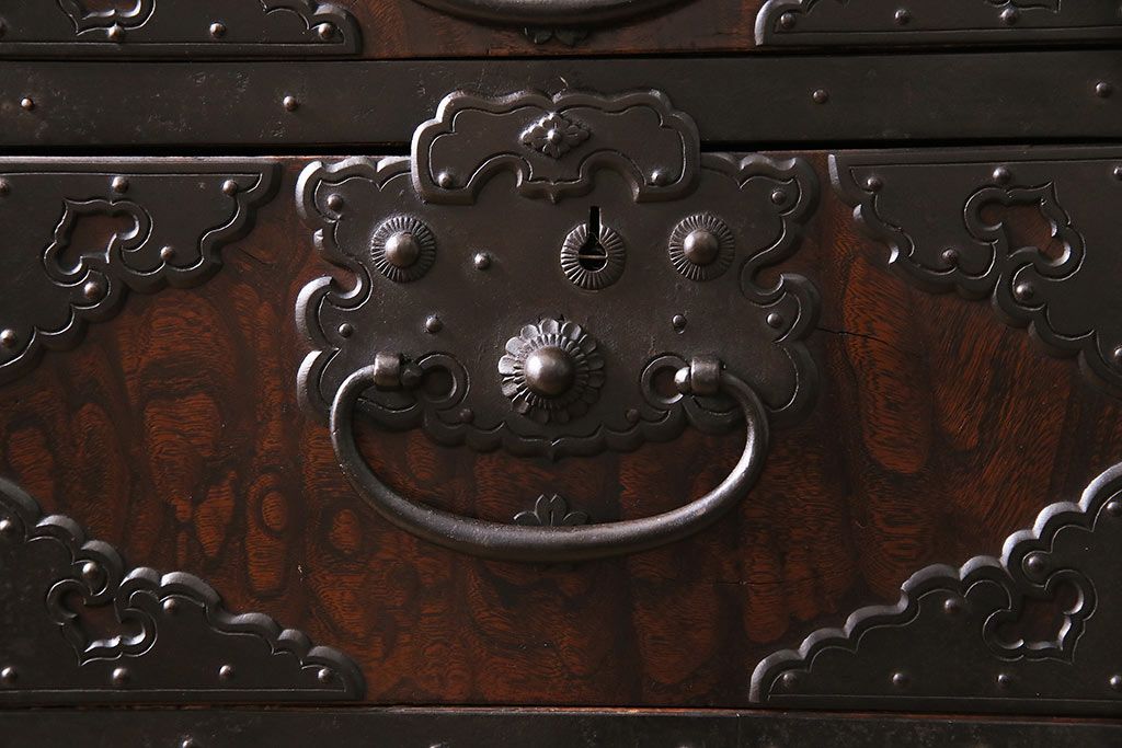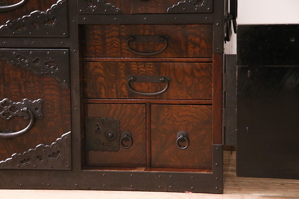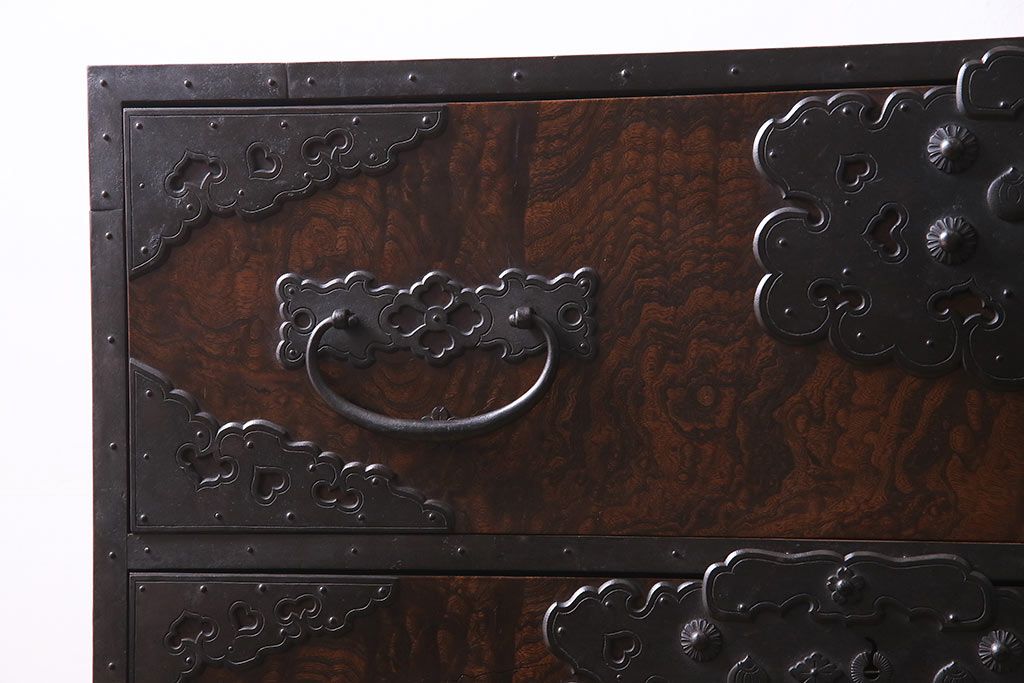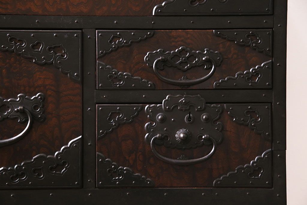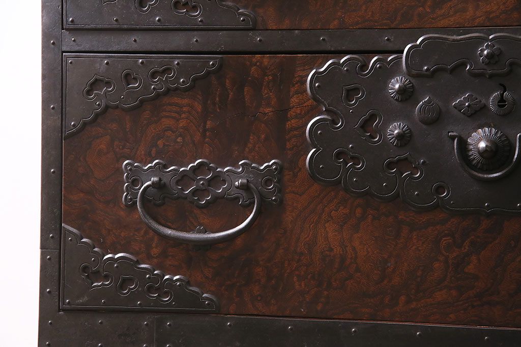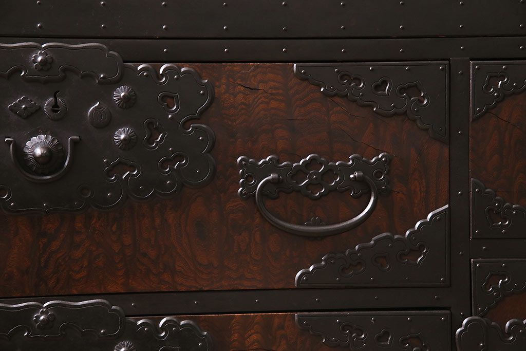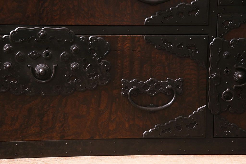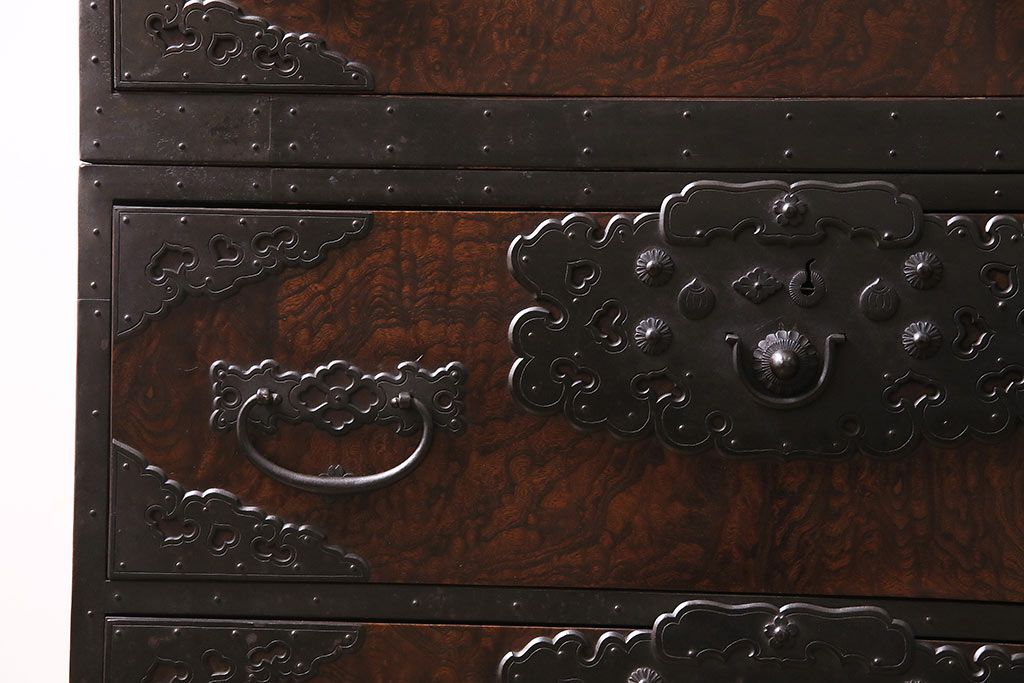 ラフジュ工房> チェスト・引き出し > アンティーク家具 前面ケヤキ材 玉杢 分厚い金具が目を引く上手物の佐渡小木箪笥(佐渡箪笥、衣装箪笥、重ね箪笥)(R-045038)