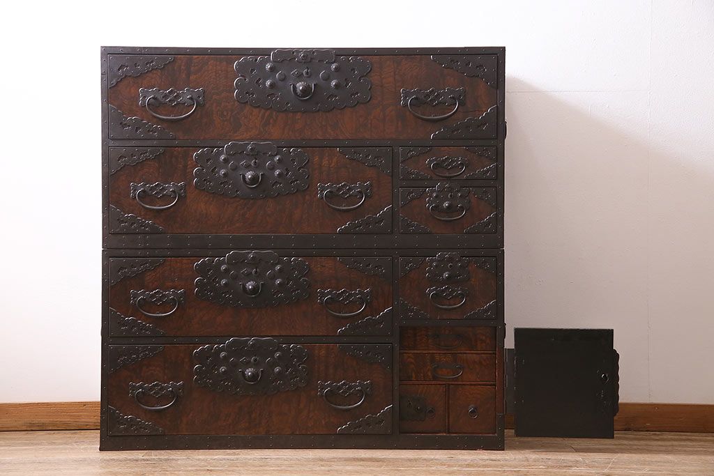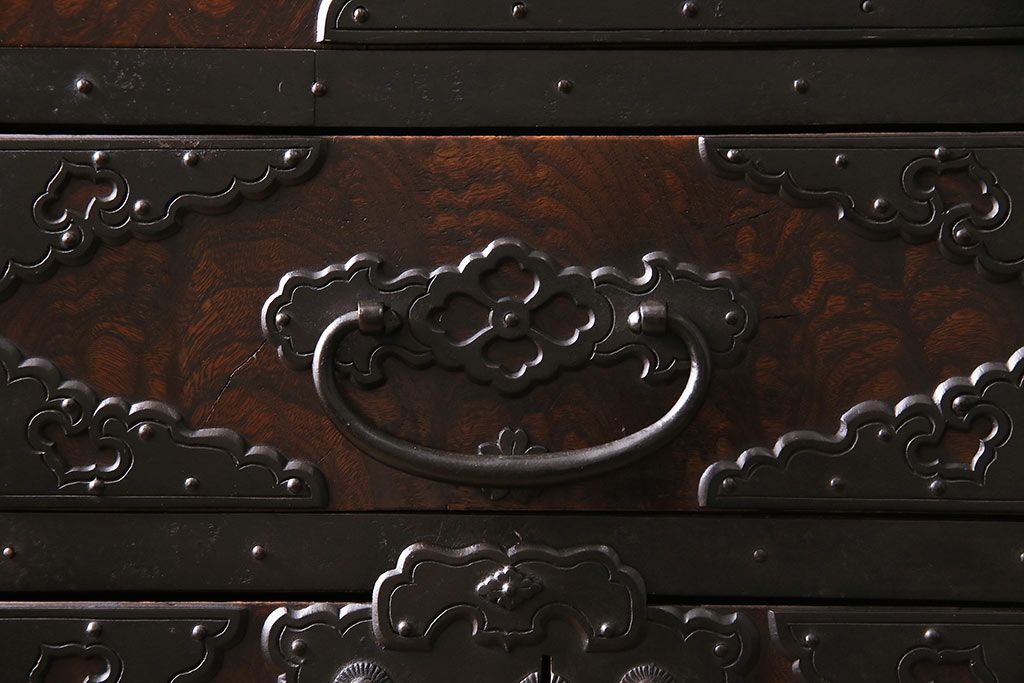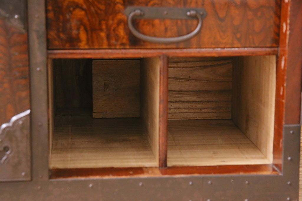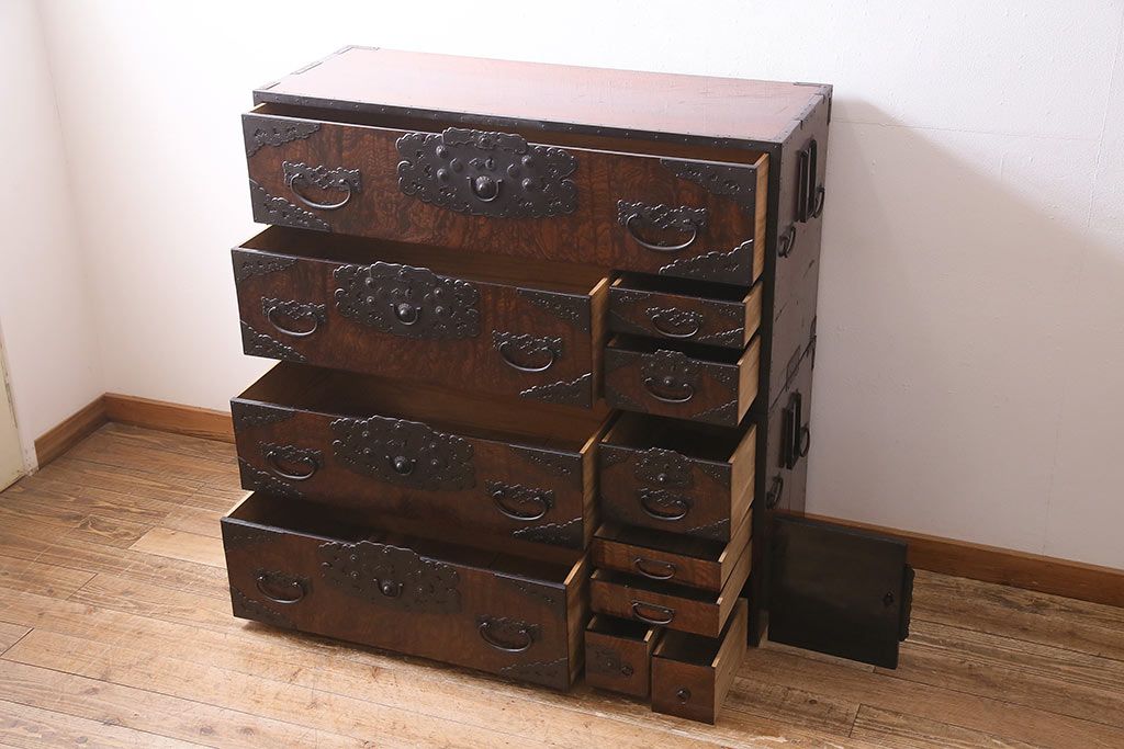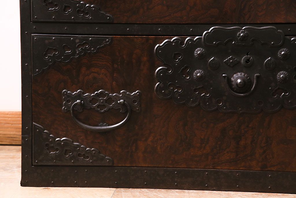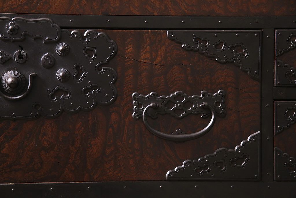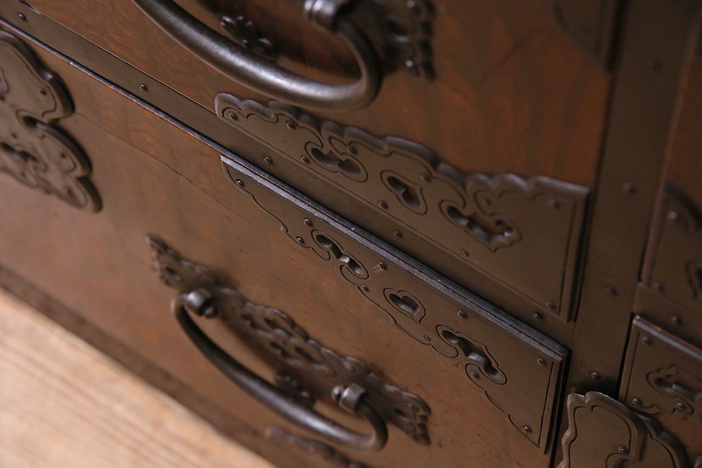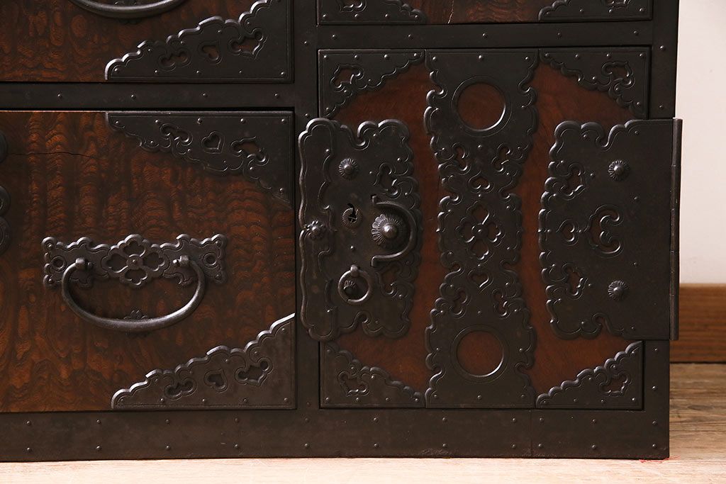 ラフジュ工房> チェスト・引き出し > アンティーク家具 前面ケヤキ材 玉杢 分厚い金具が目を引く上手物の佐渡小木箪笥(佐渡箪笥、衣装箪笥、重ね箪笥)(R-045038)