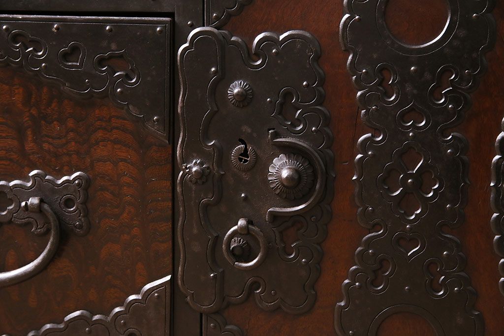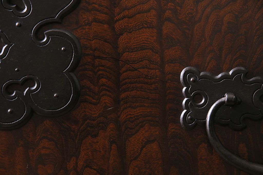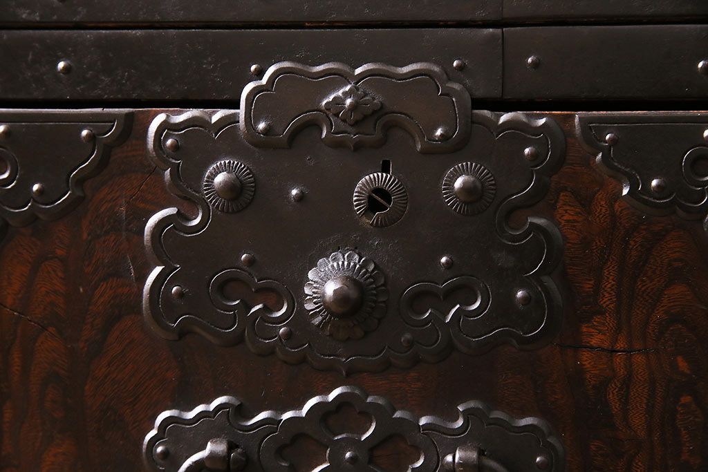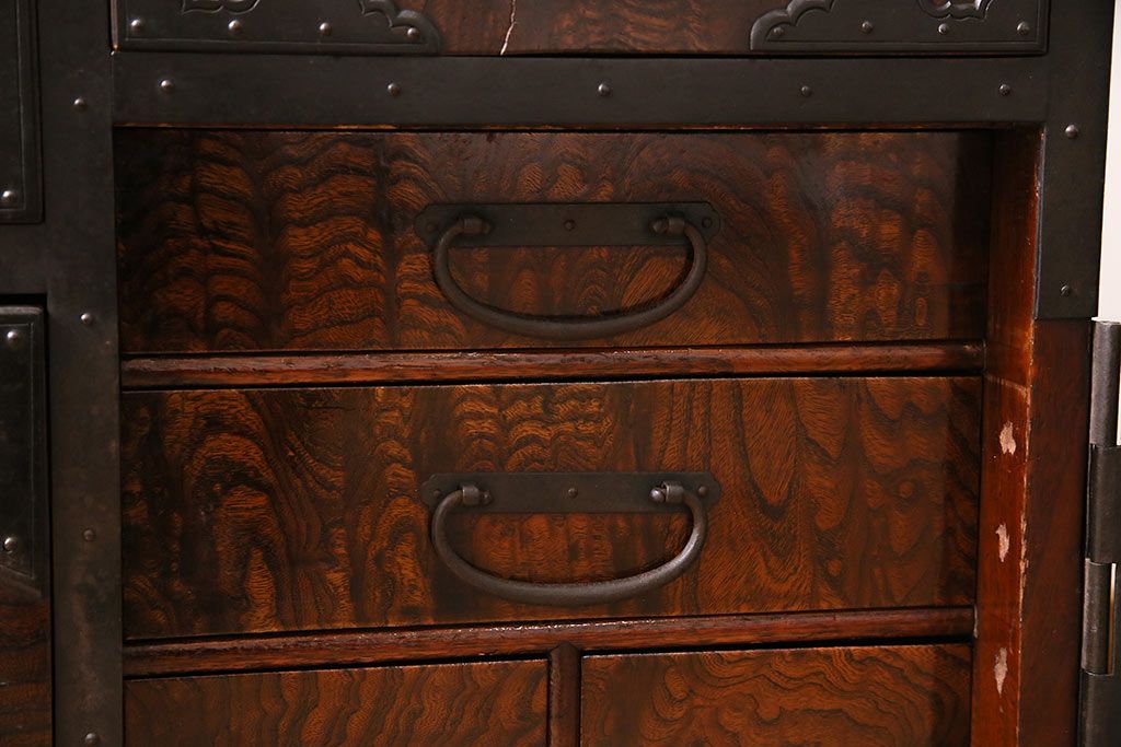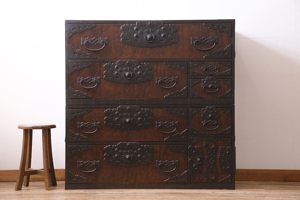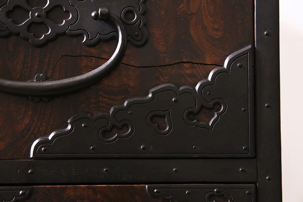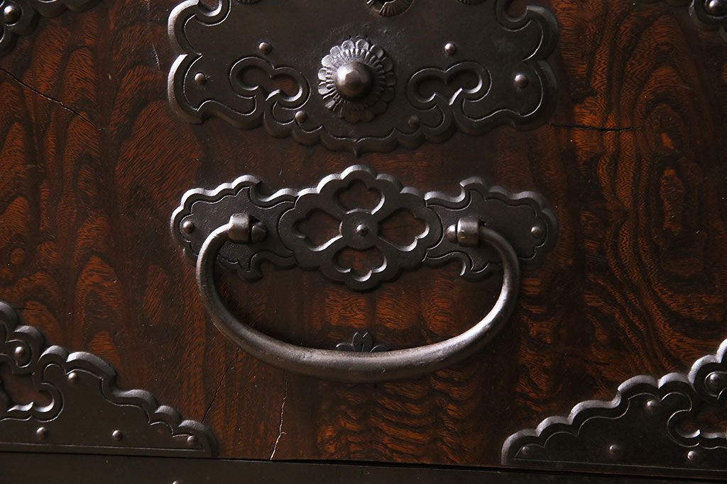 ラフジュ工房> チェスト・引き出し > アンティーク家具 前面ケヤキ材 玉杢 分厚い金具が目を引く上手物の佐渡小木箪笥(佐渡箪笥、衣装箪笥、重ね箪笥)(R-045038)